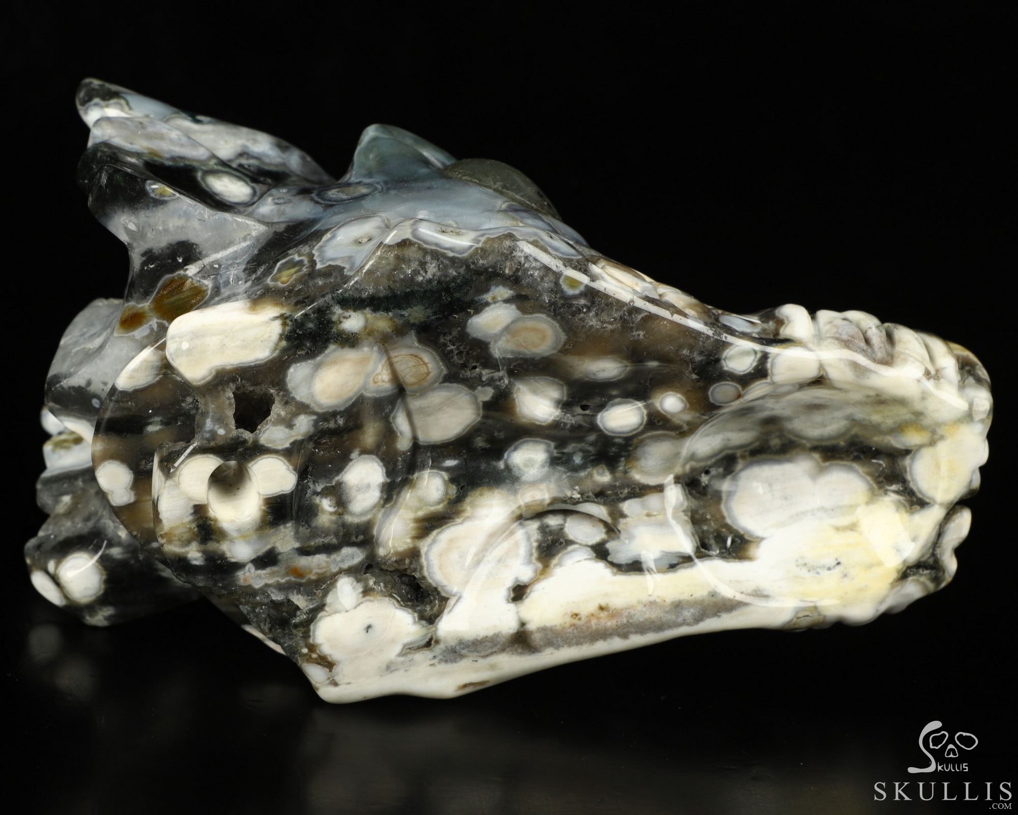 You are looking at a Ocean Jasper skull. The skull is 5.3 inches from front to back.