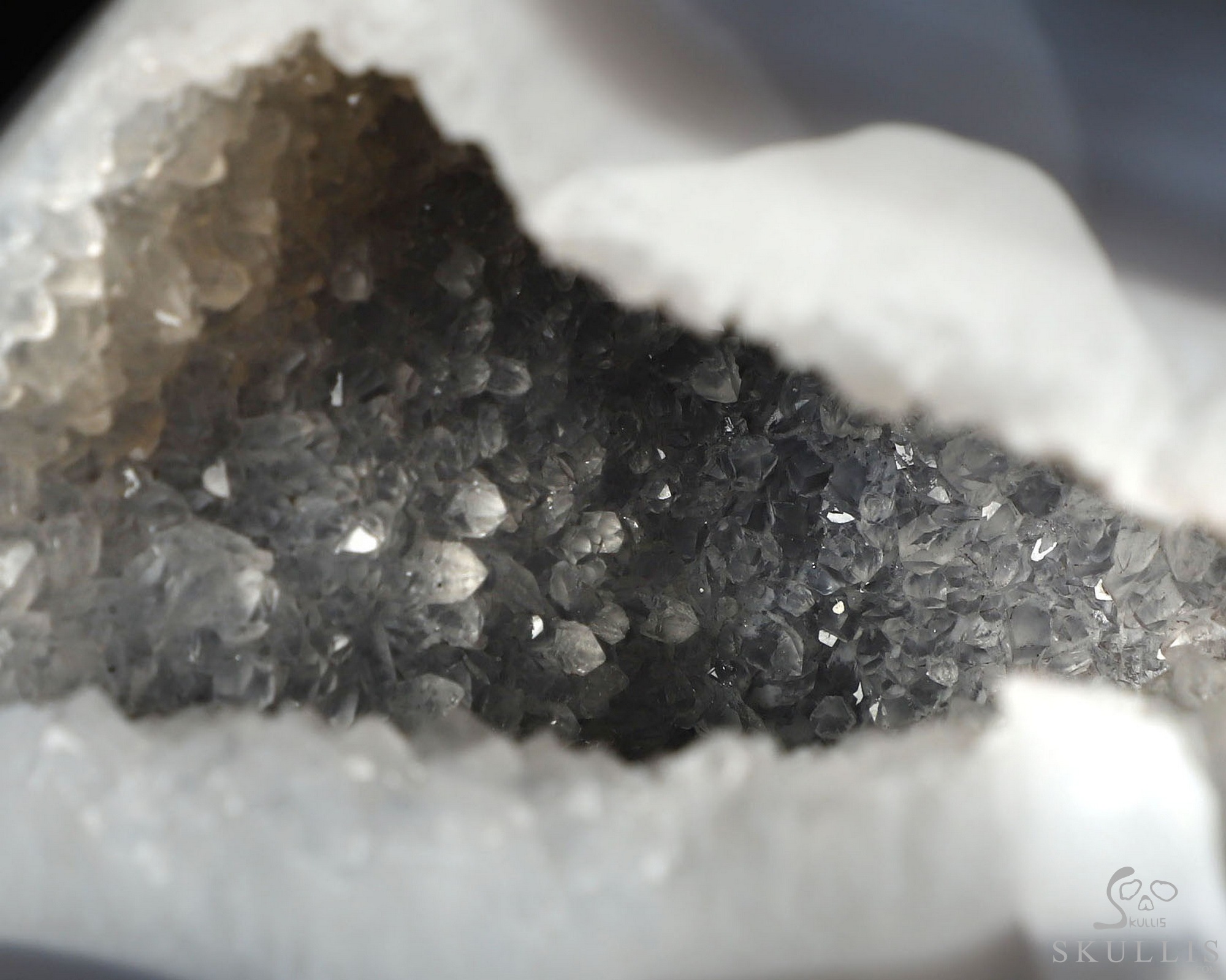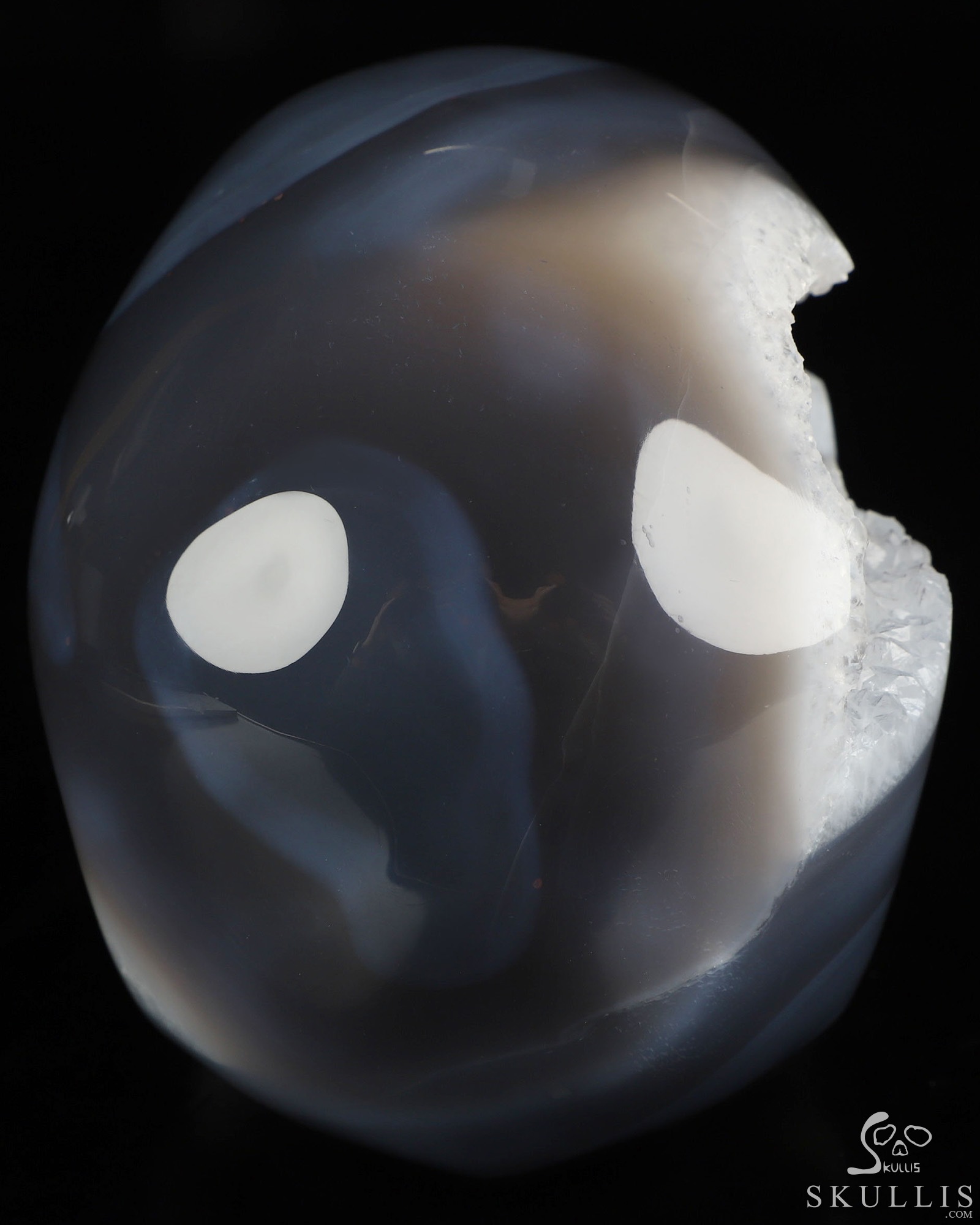 You are looking at an Agate Geode skull. The skull is 5.5 inches from front to back.