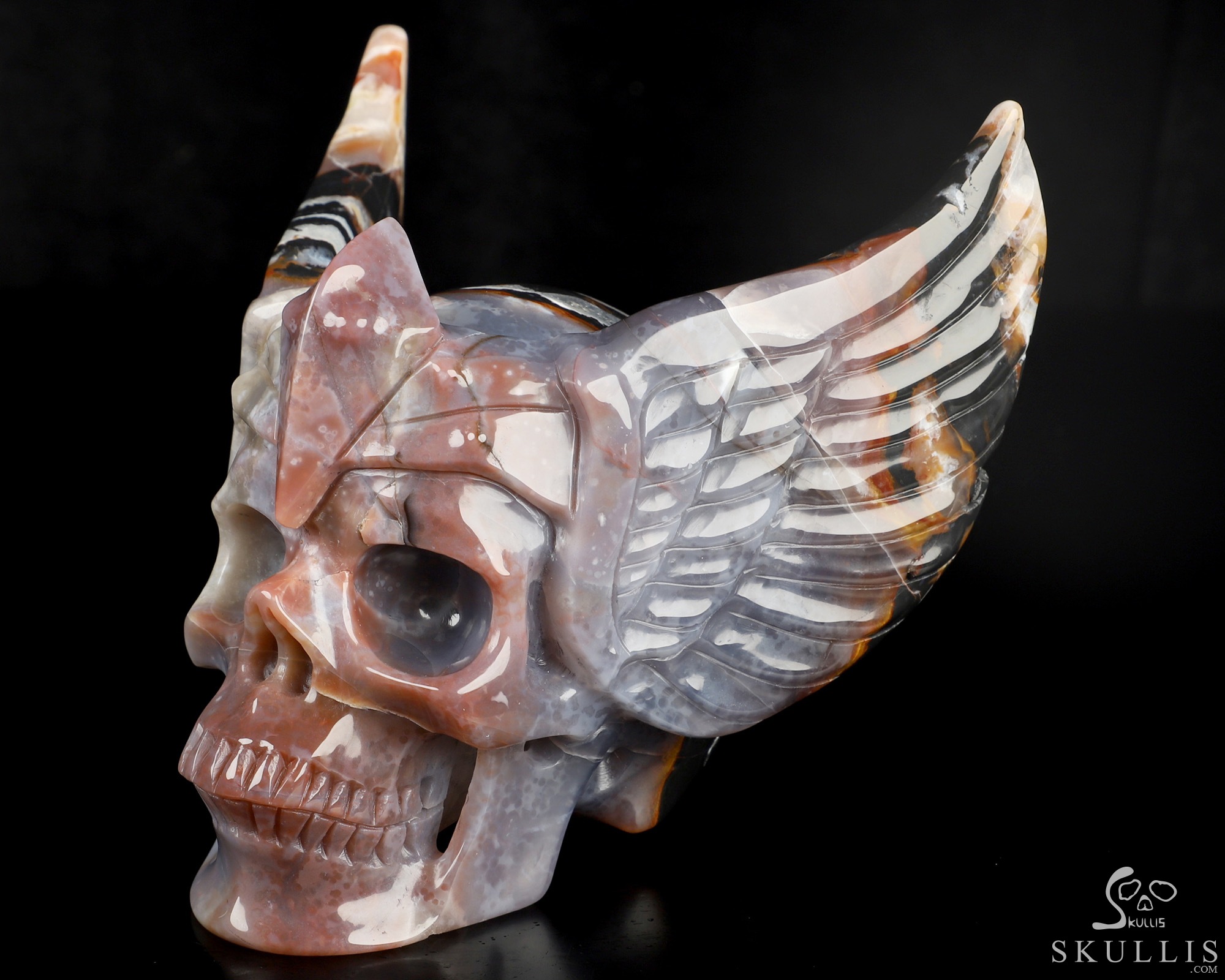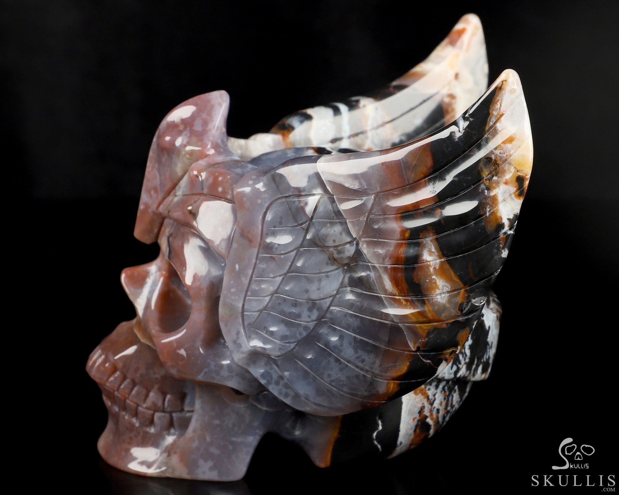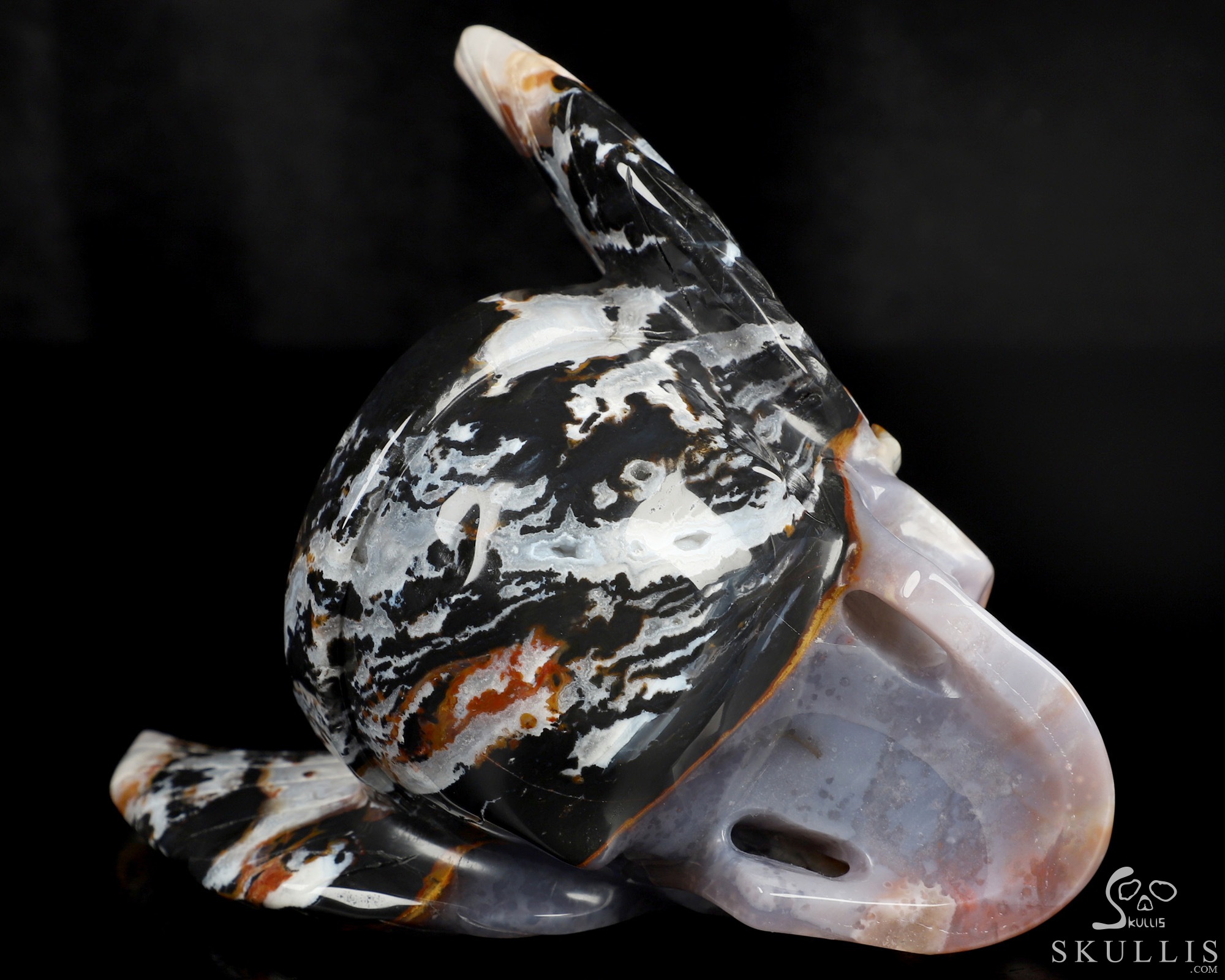 6.3" Black Zebra Agate Carved Crystal Skull & Raven Sculpture, Crystal Healing