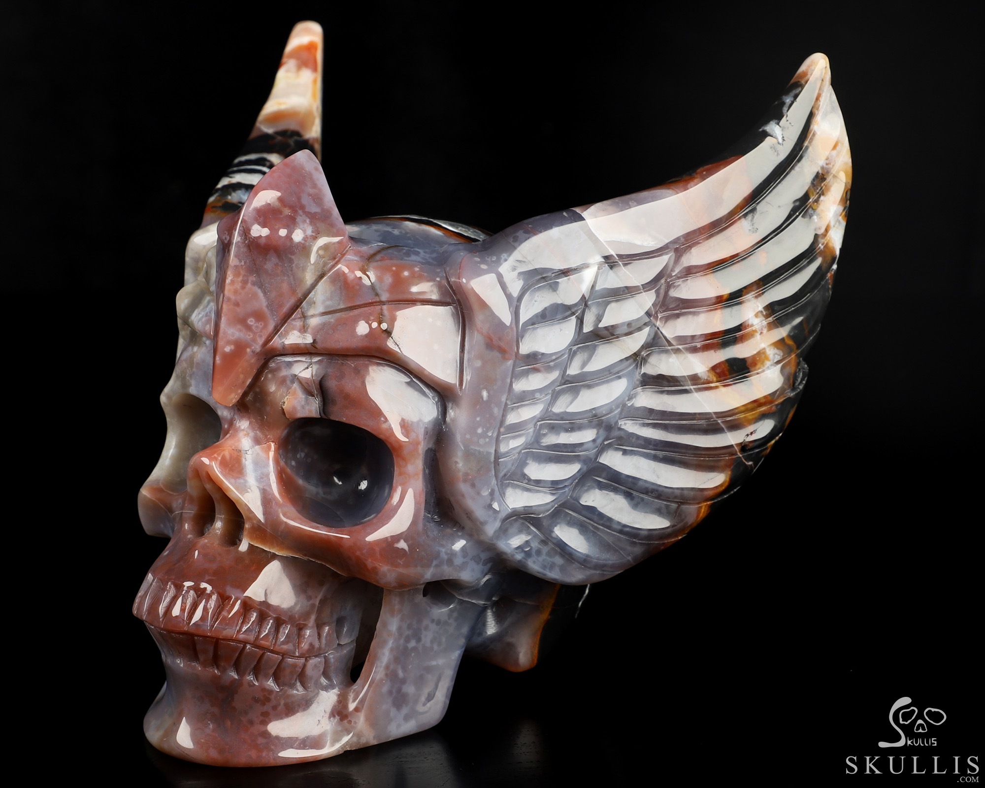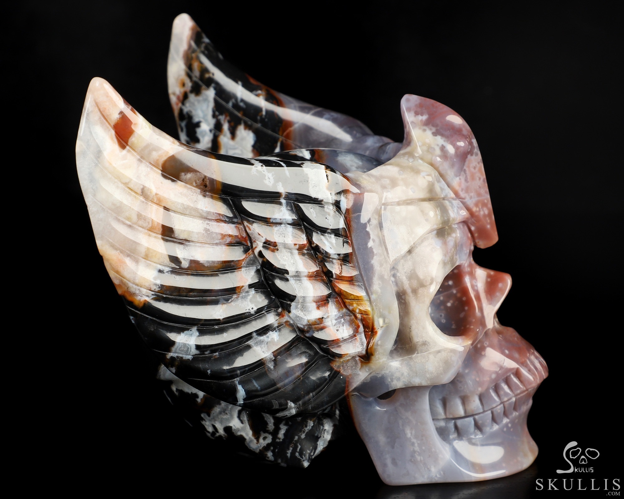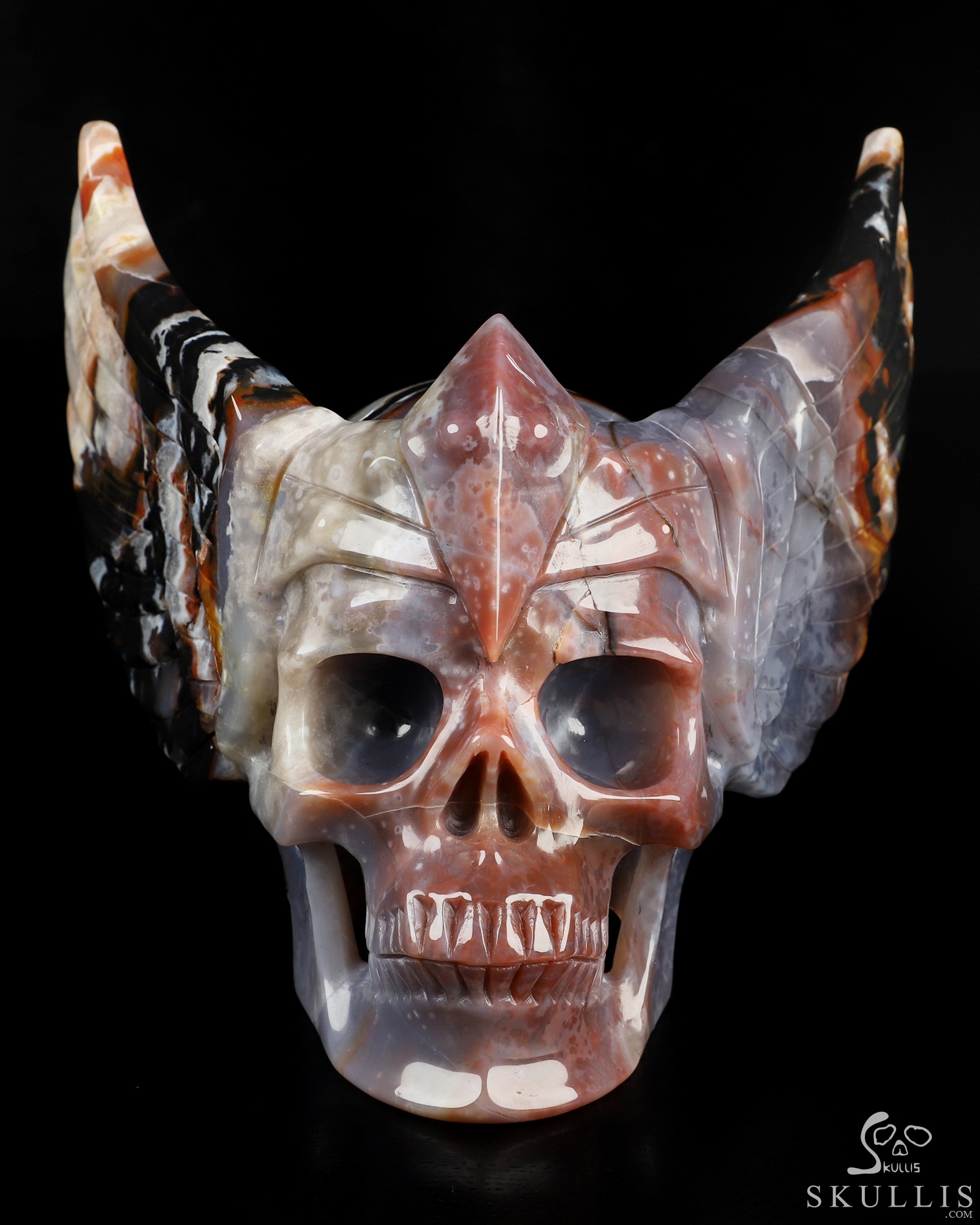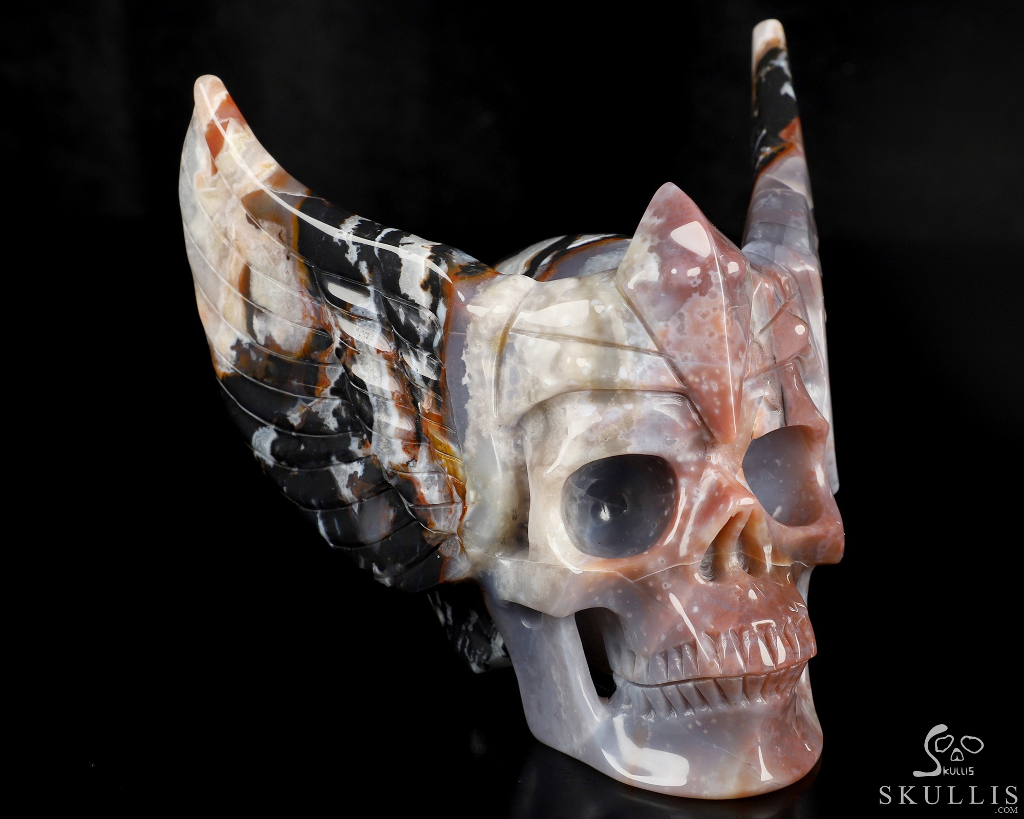 6.3" Black Zebra Agate Carved Crystal Skull & Raven Sculpture, Crystal Healing