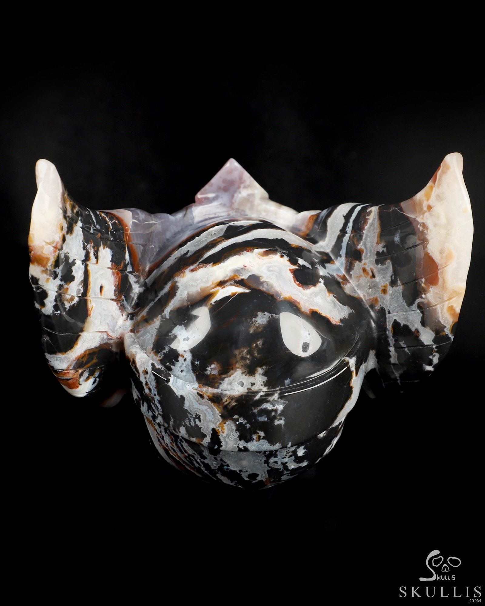 5.0" Black Zebra Agate Hand Carved Crystal Dragon Skull Sculpture, Crystal Healing