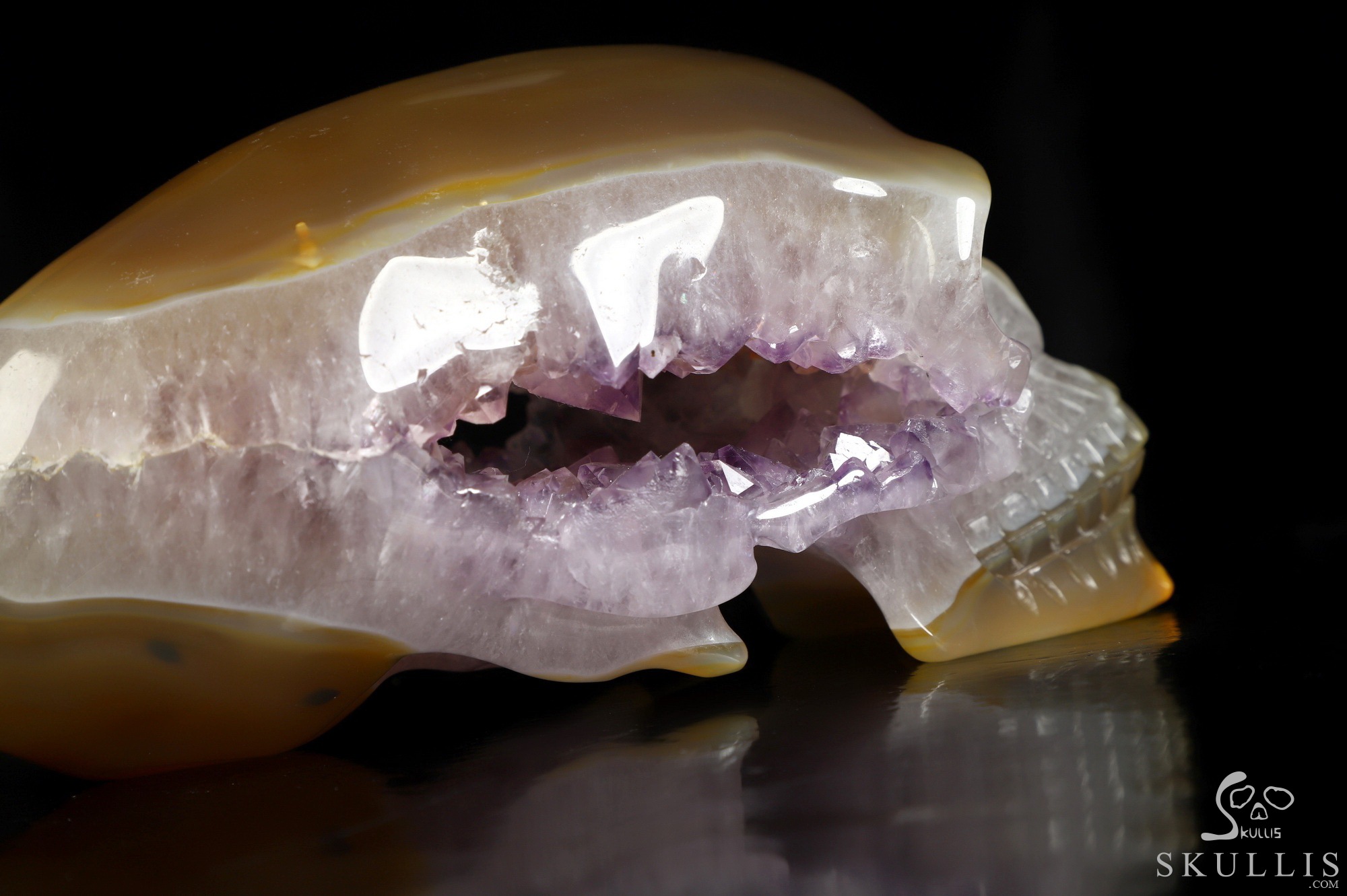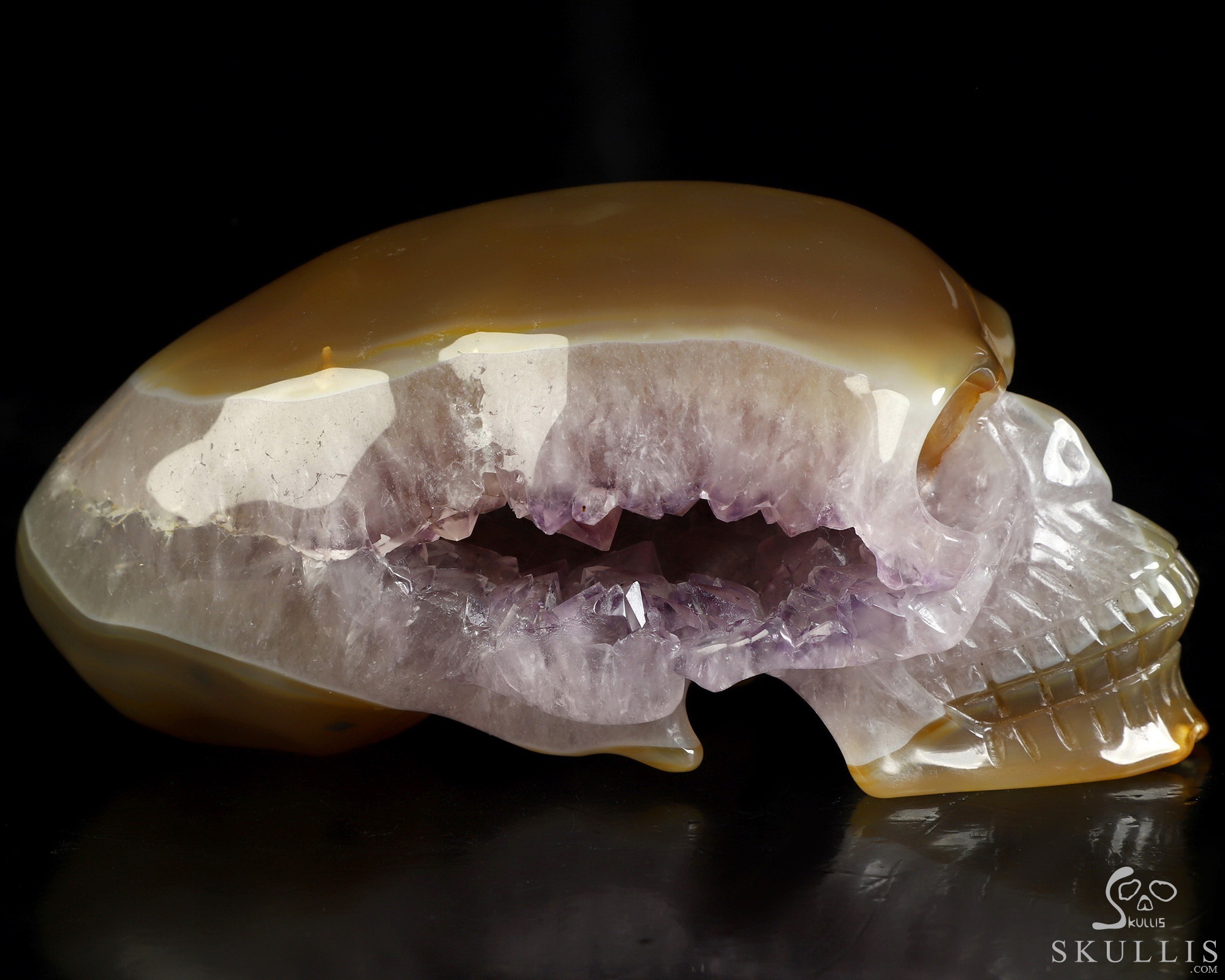 5.7" Premium Brazilian Agate Amethyst Geode Hand Carved Crystal Elongated Mayan Alien Skull Sculpture, Crystal Healing