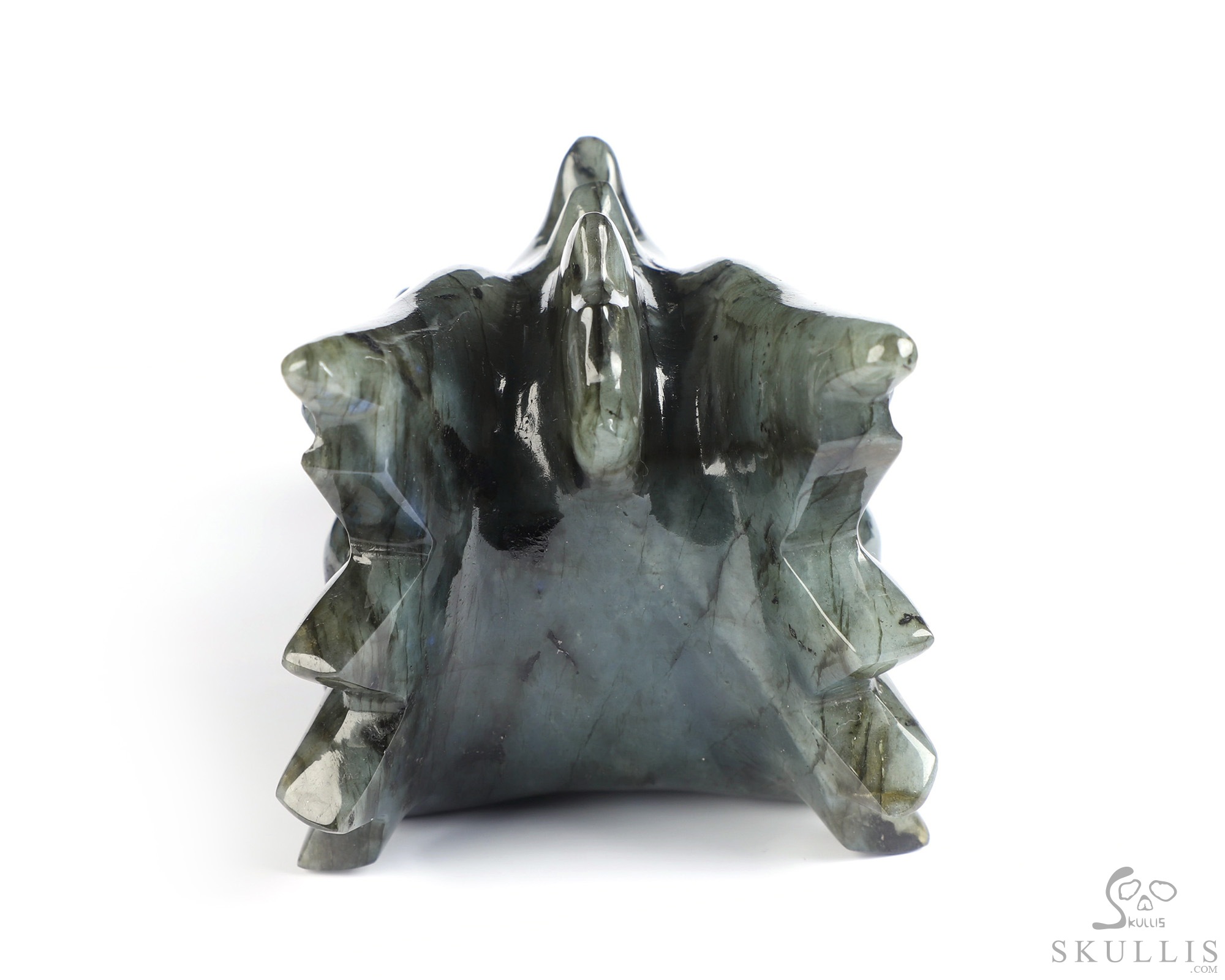 You are looking at a Labradorite skull. The skull is 5.8 inches from front to back.
