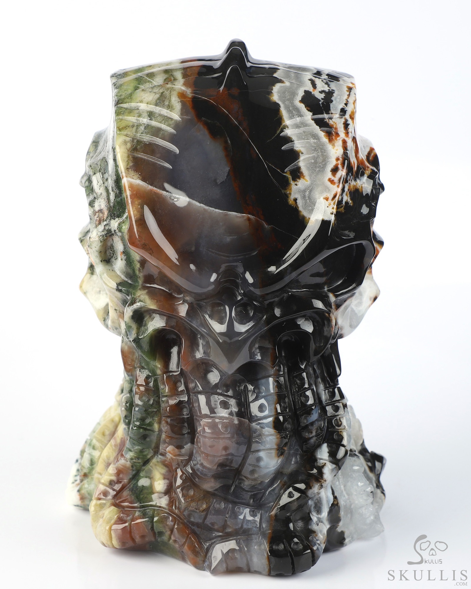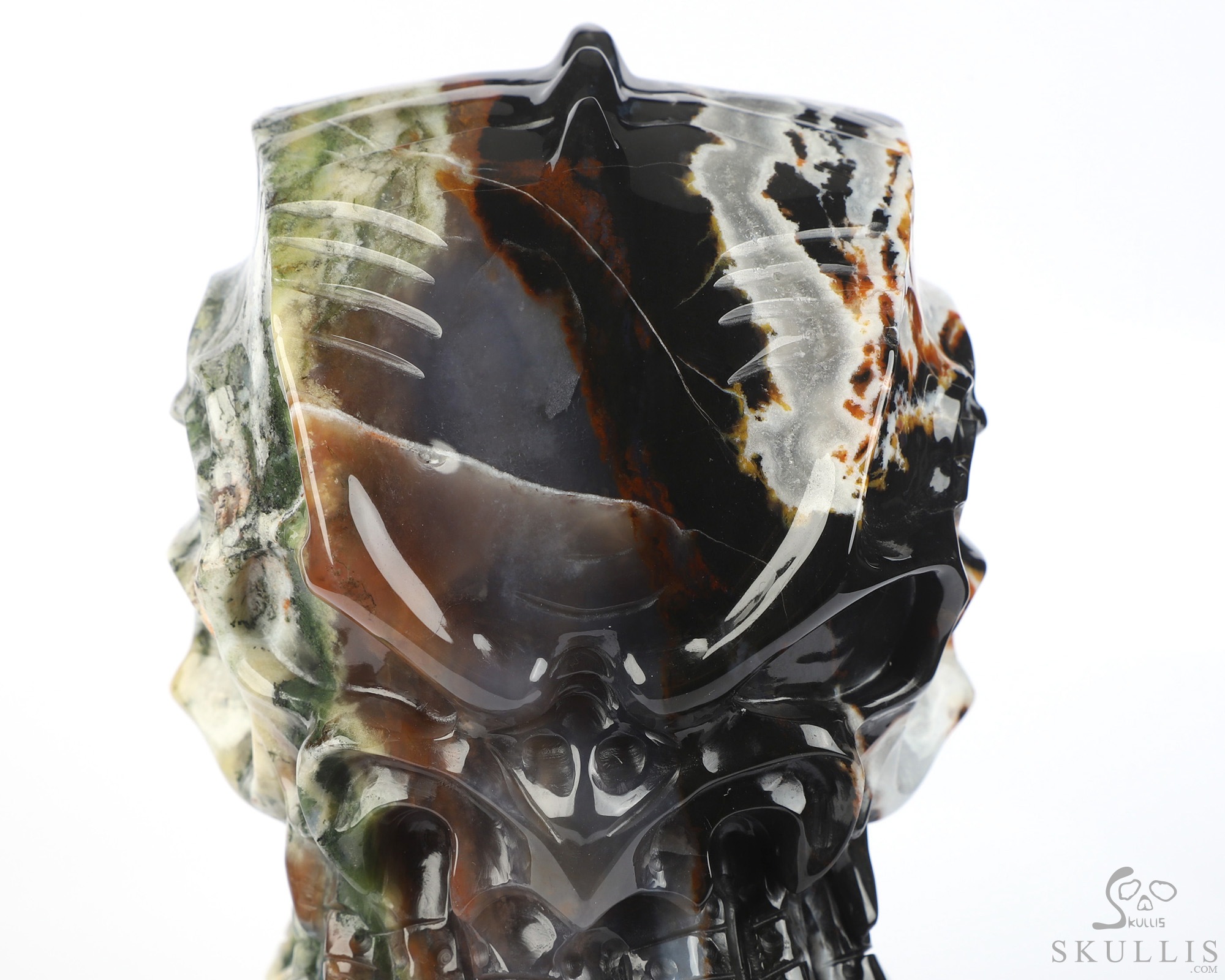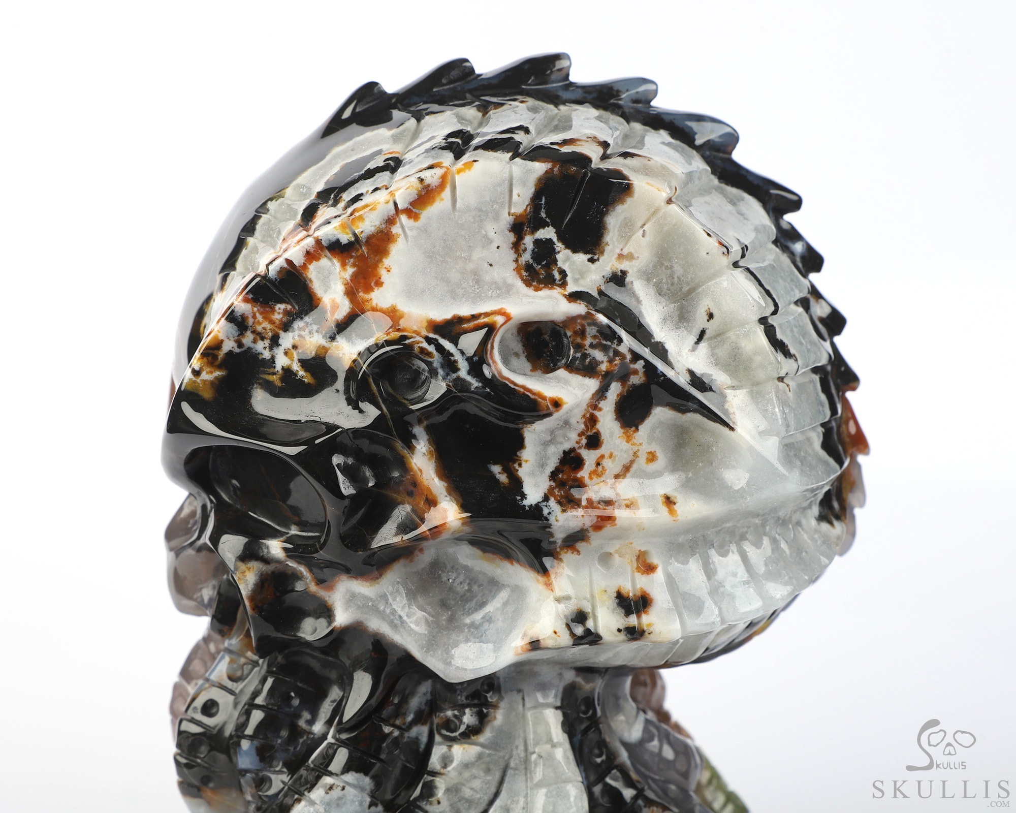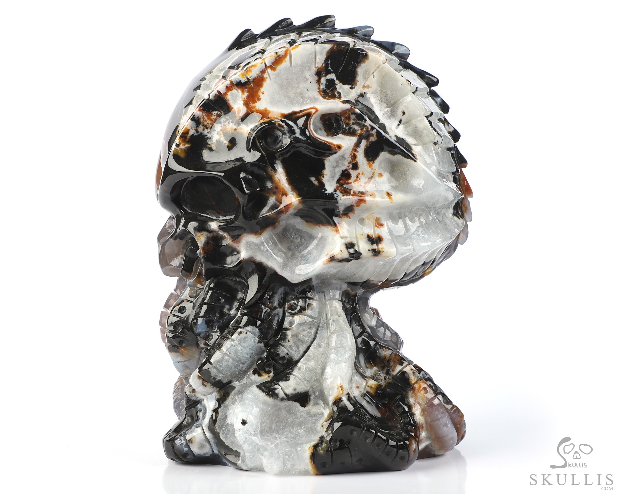 6.3" Black Zebra Agate Carved Crystal Skull & Owl Sculpture, Realistic
