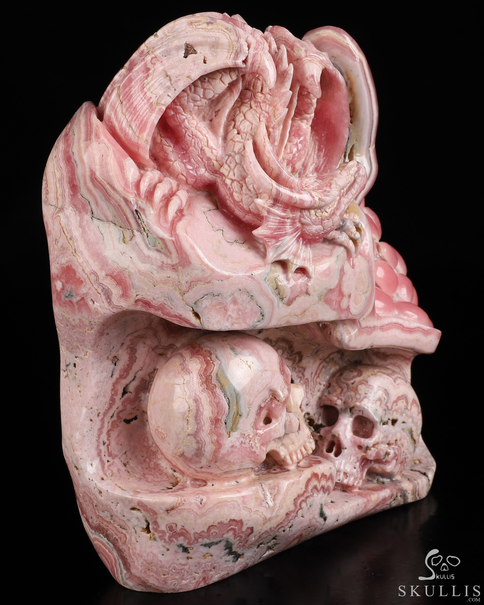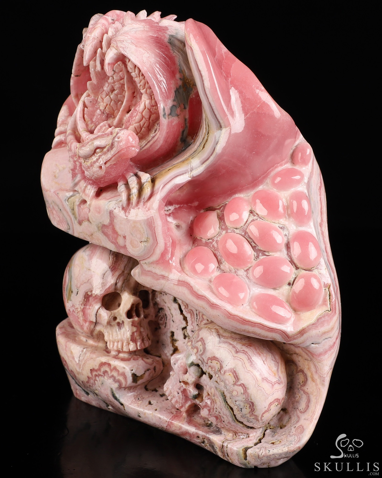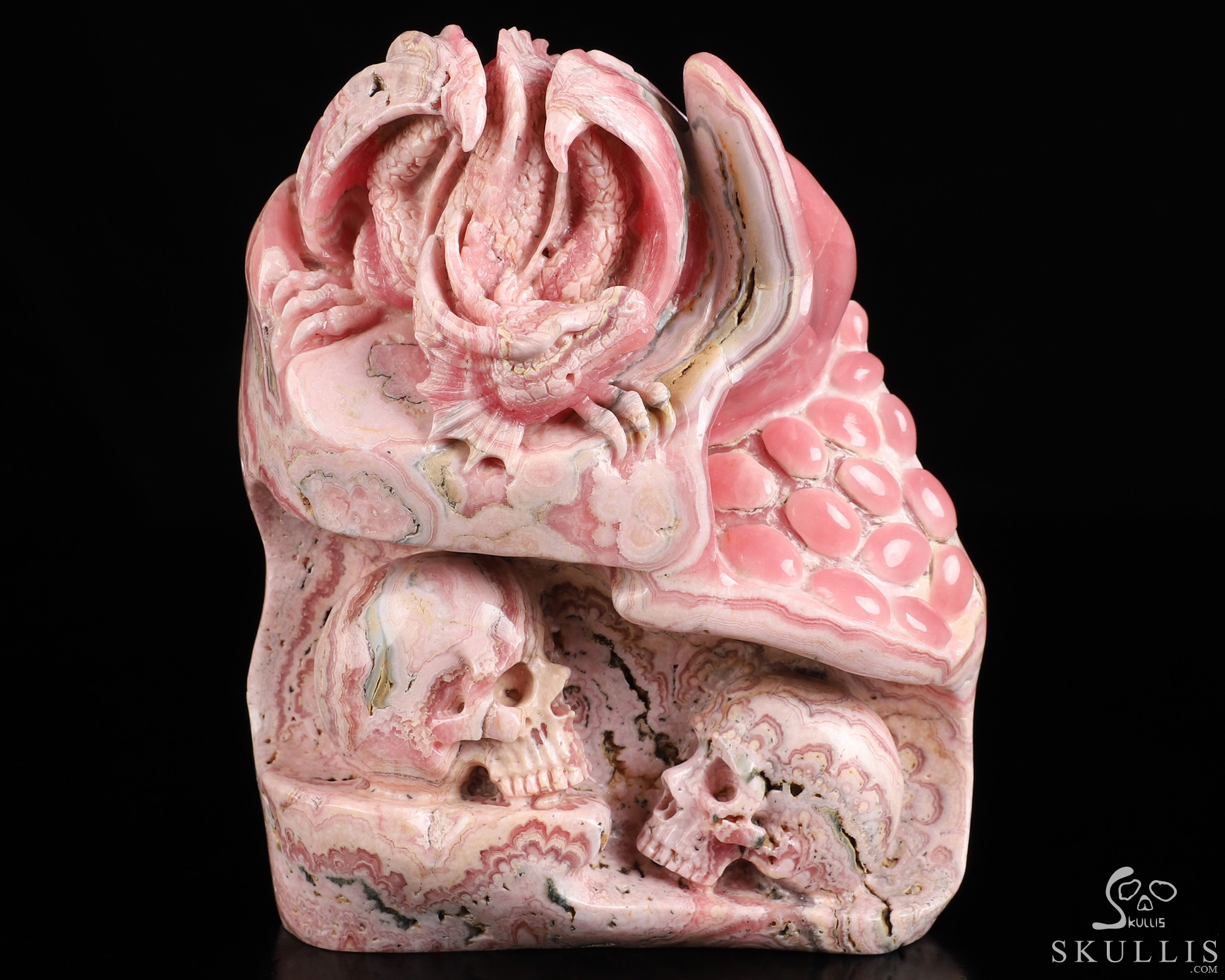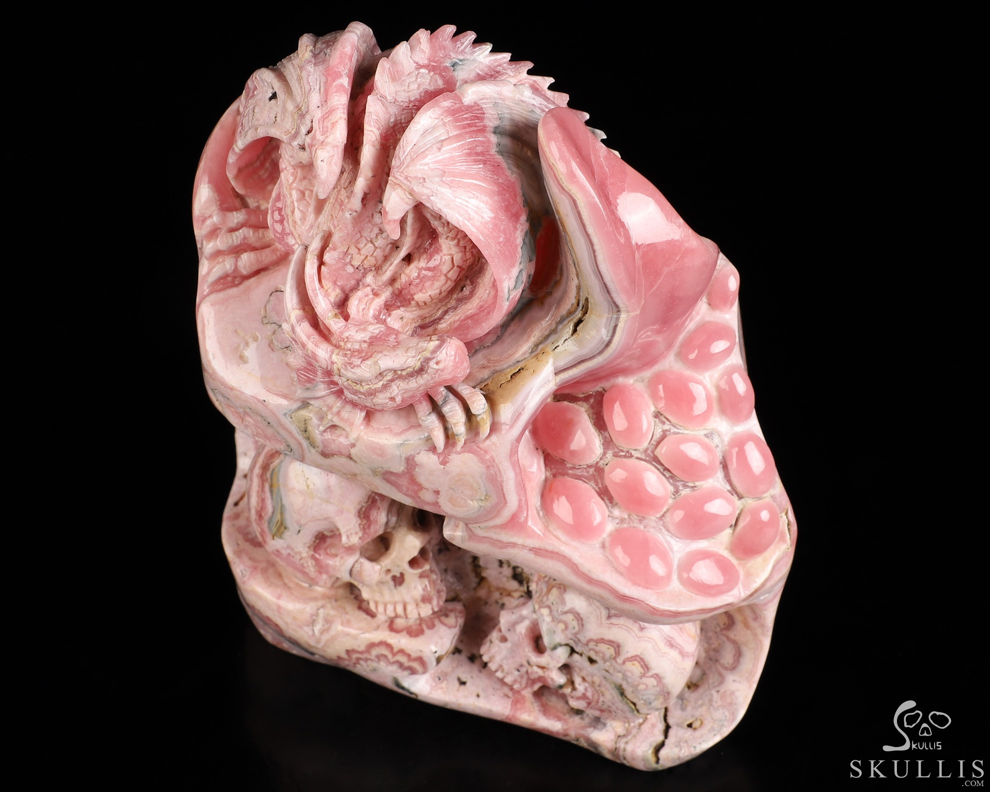 6.1" Rhodochrosite Hand Carved Crystal Skull and Dragon Fine Art Sculpture, Crystal Healing