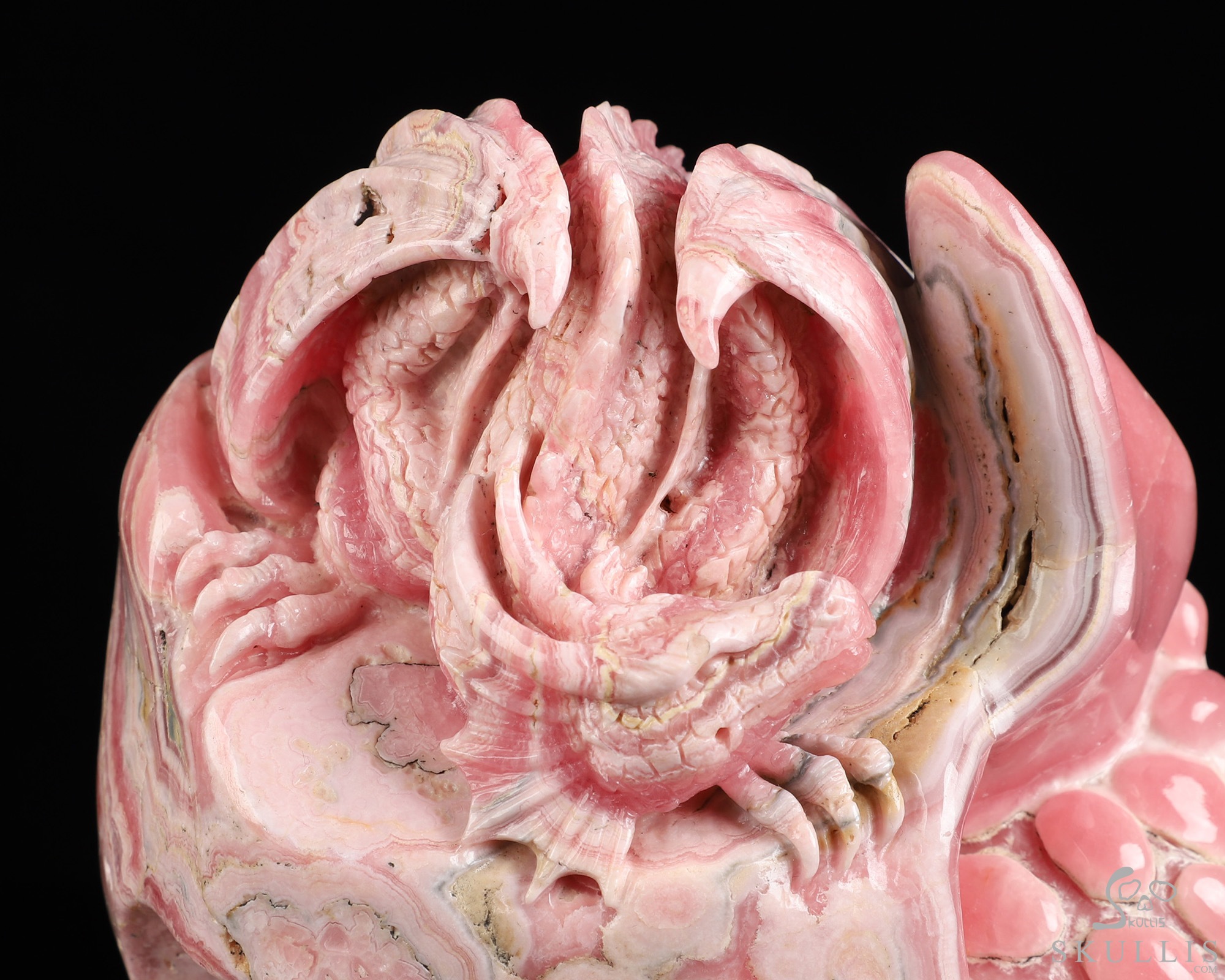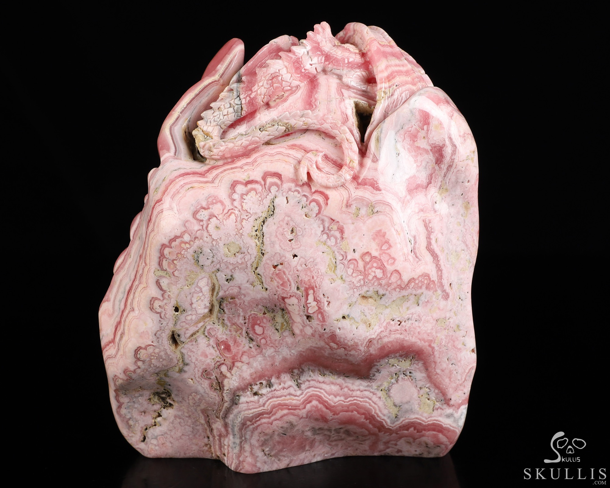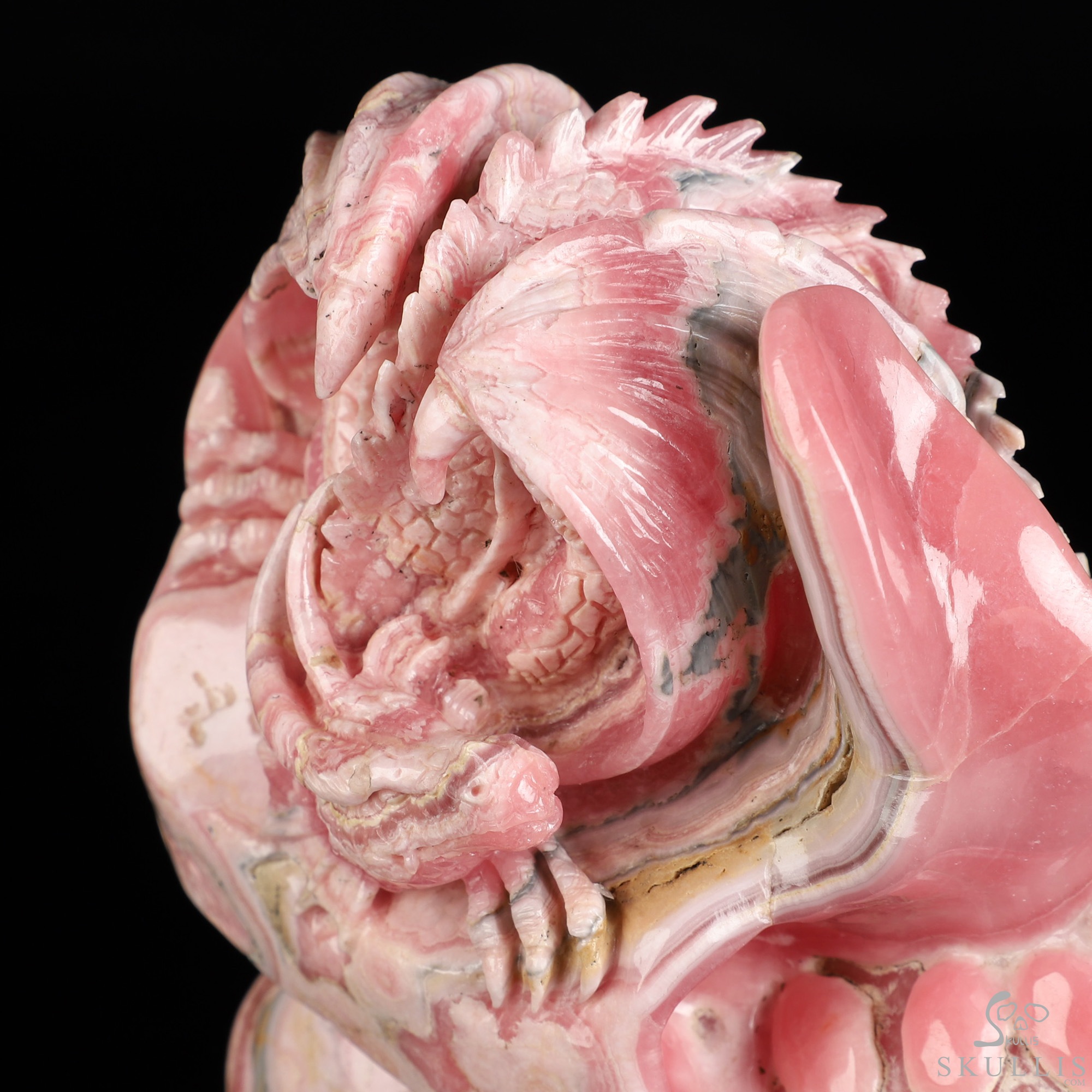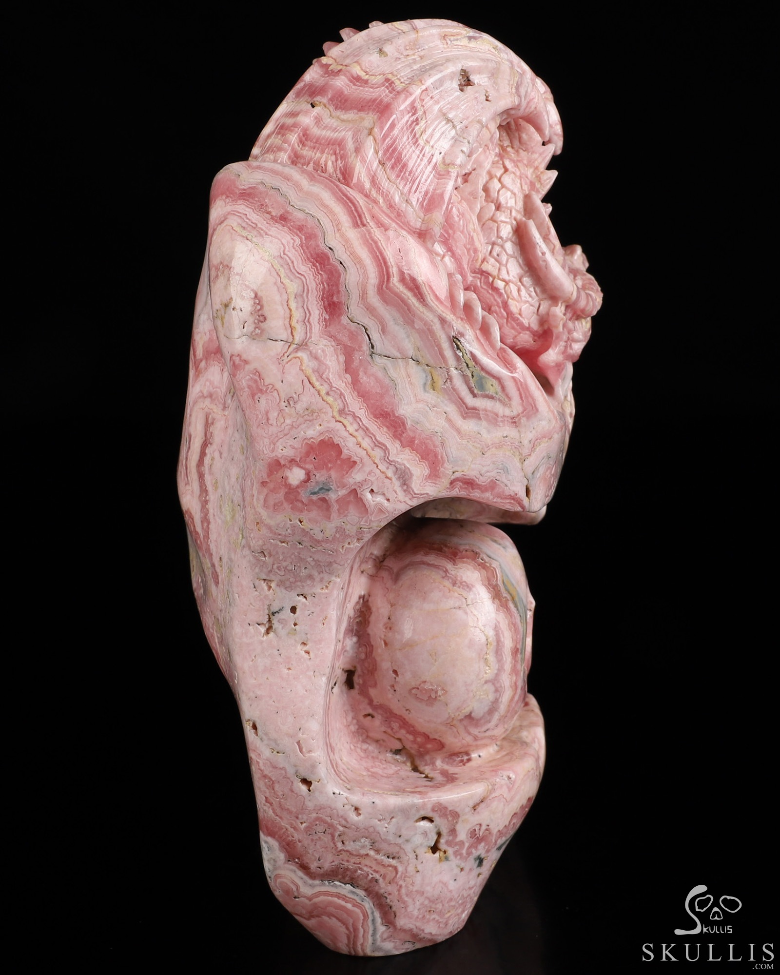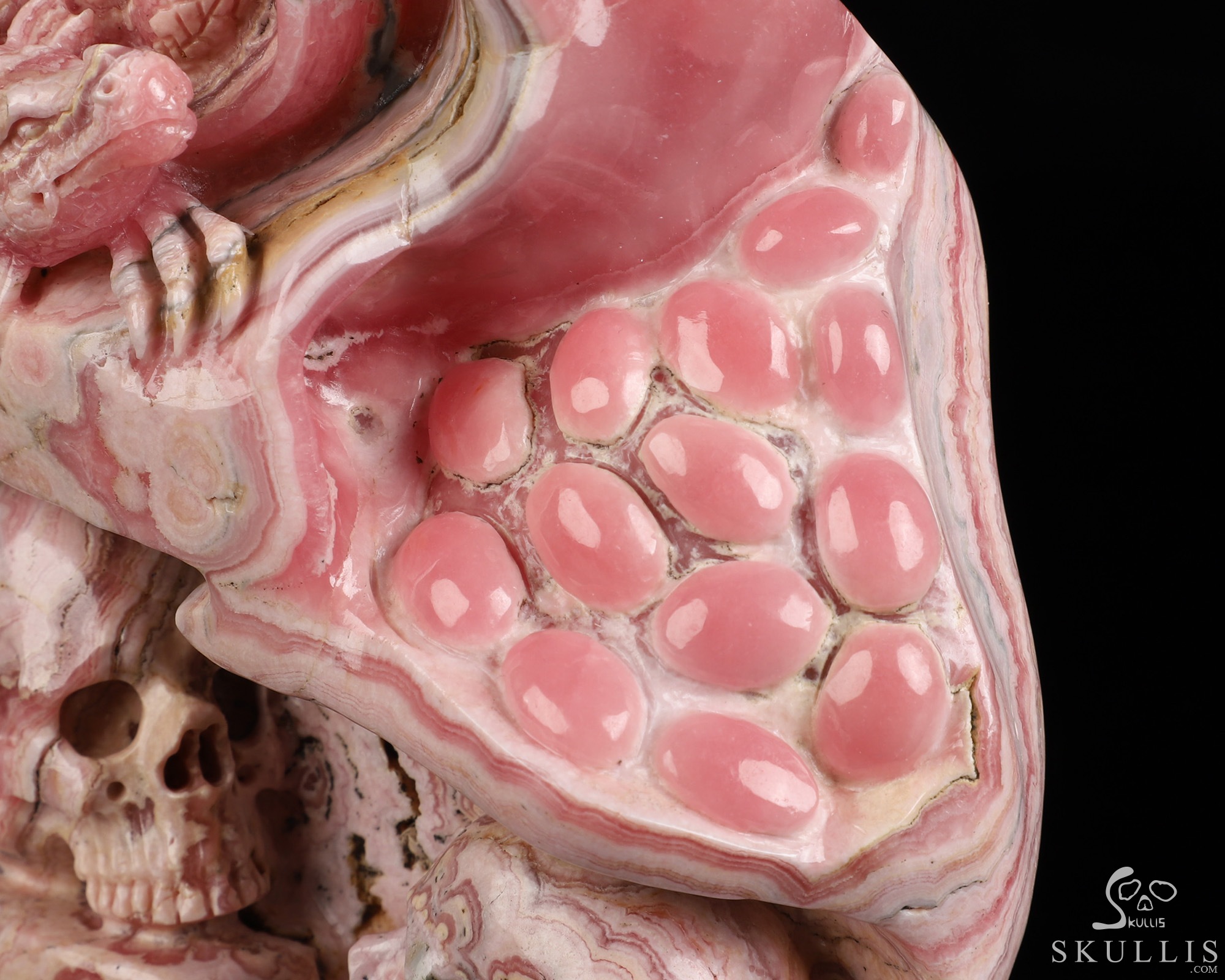 6.1" Rhodochrosite Hand Carved Crystal Skull and Dragon Fine Art Sculpture, Crystal Healing
