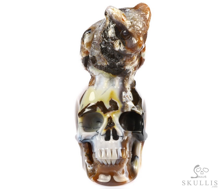 6.3" Black Zebra Agate Carved Crystal Skull & Owl Sculpture, Realistic
