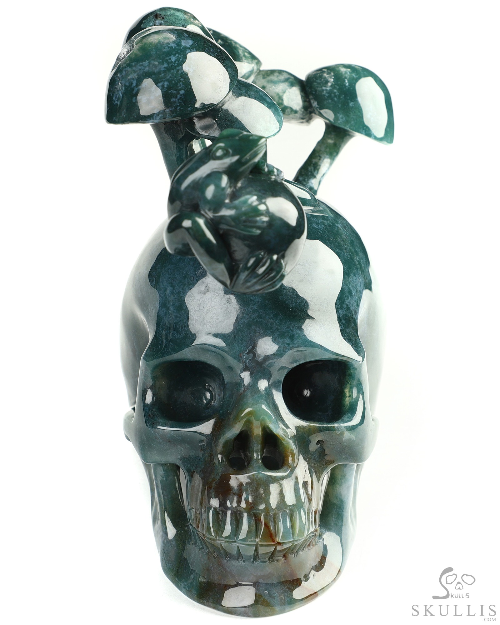 6.3" Green Moss Agate Hand Carved Crystal mushroom Skull Sculpture, Crystal Healing