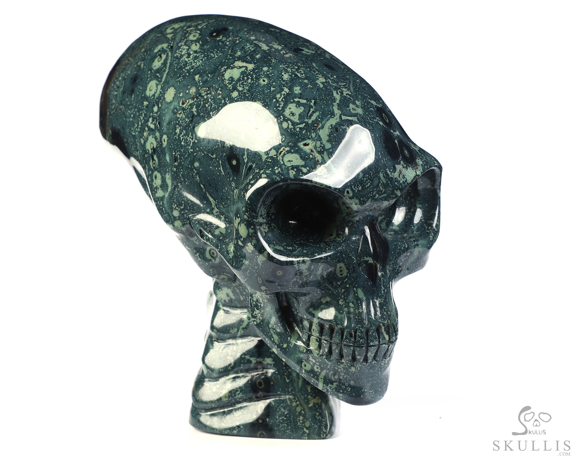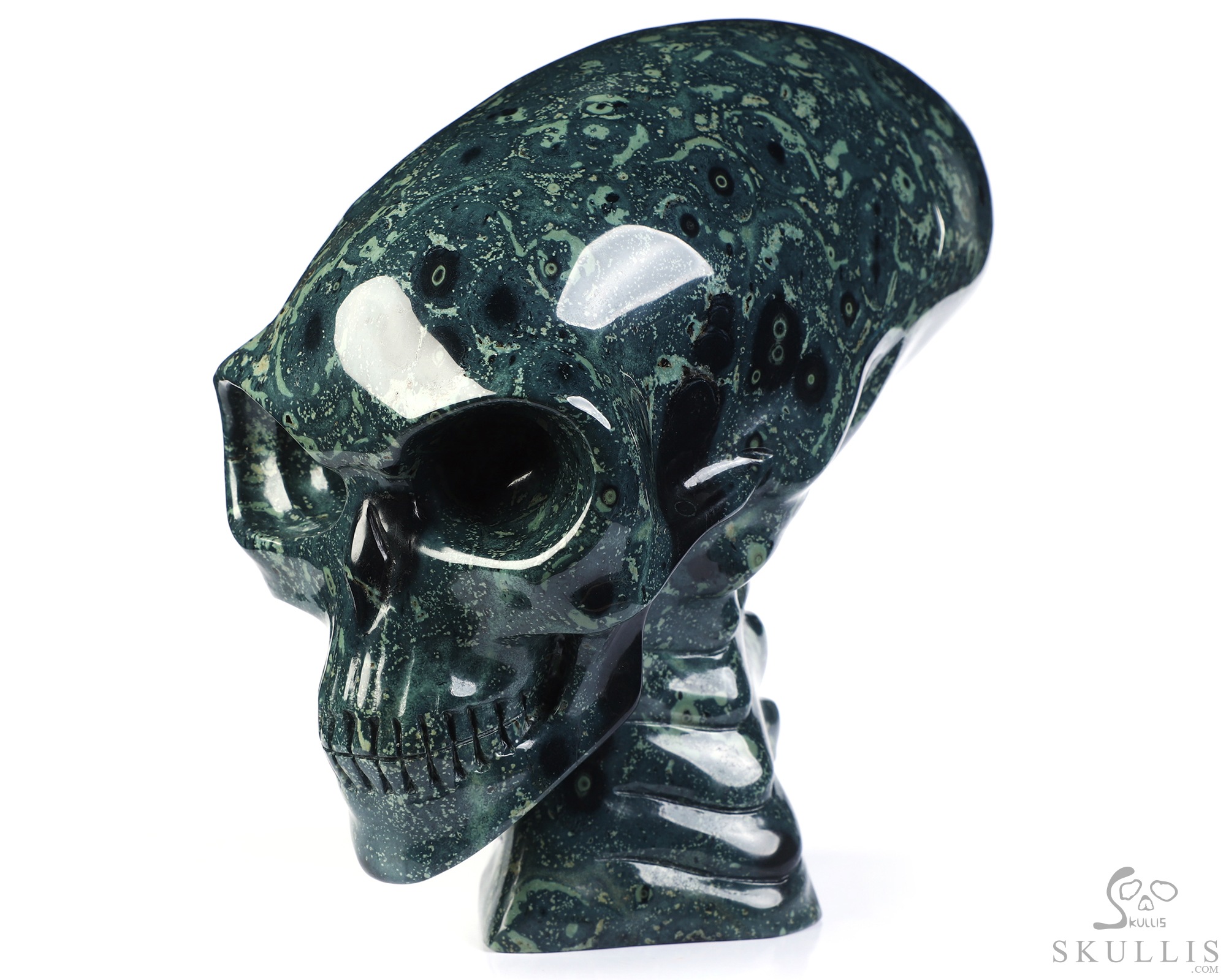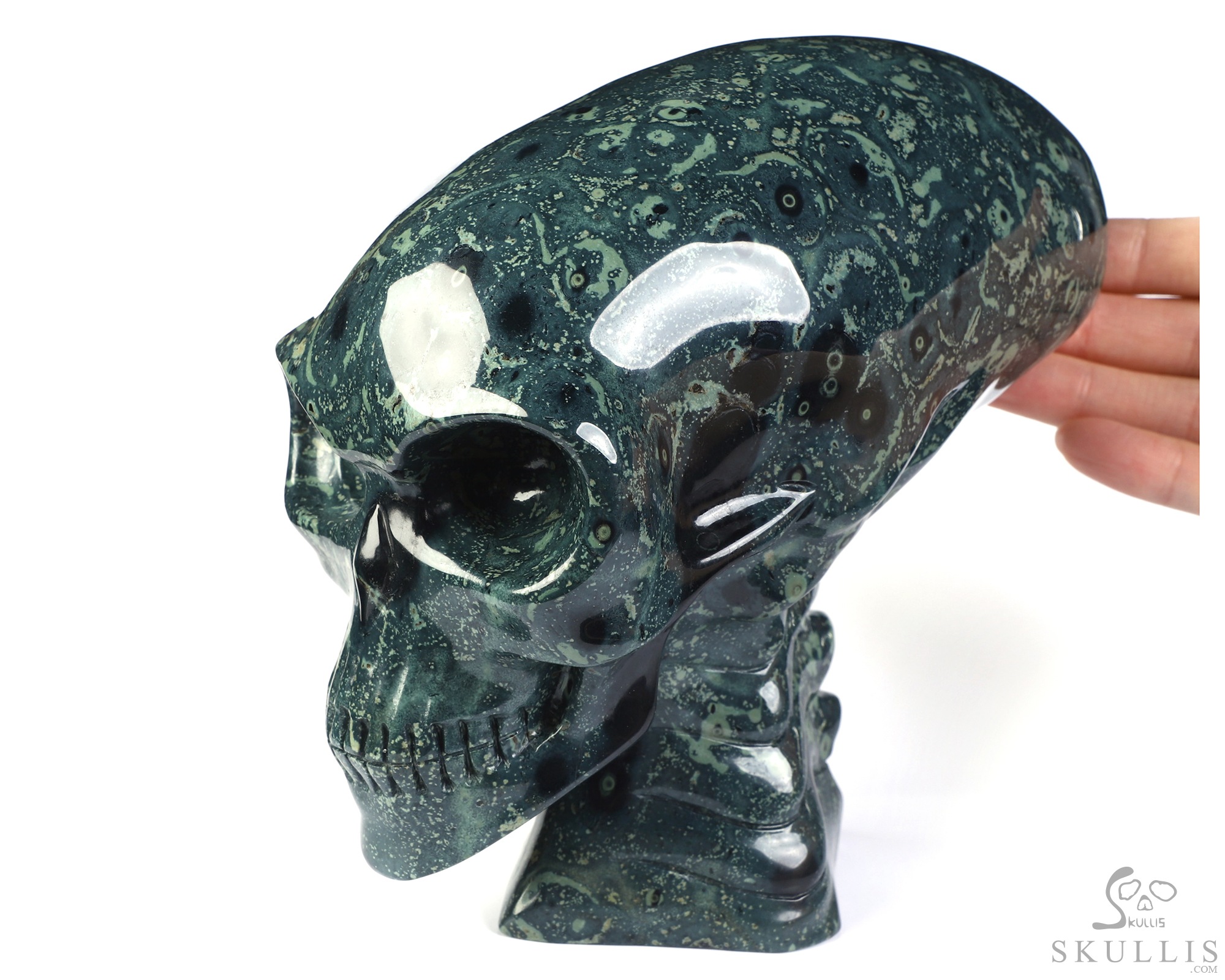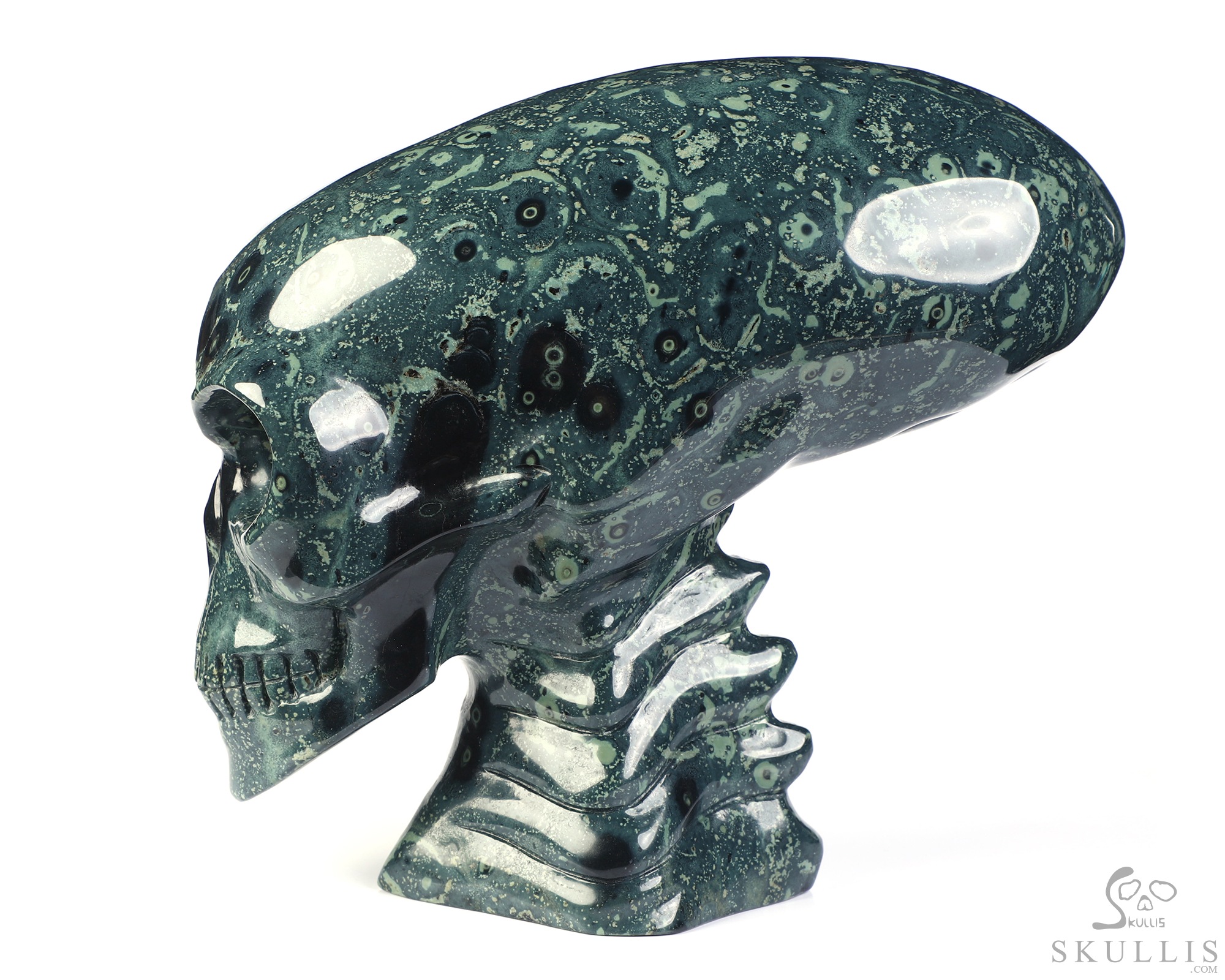 6.3" Kambaba Jasper Hand Carved Crystal Elongated Mayan Alien Skull with Spine Sculpture, Crystal Healing