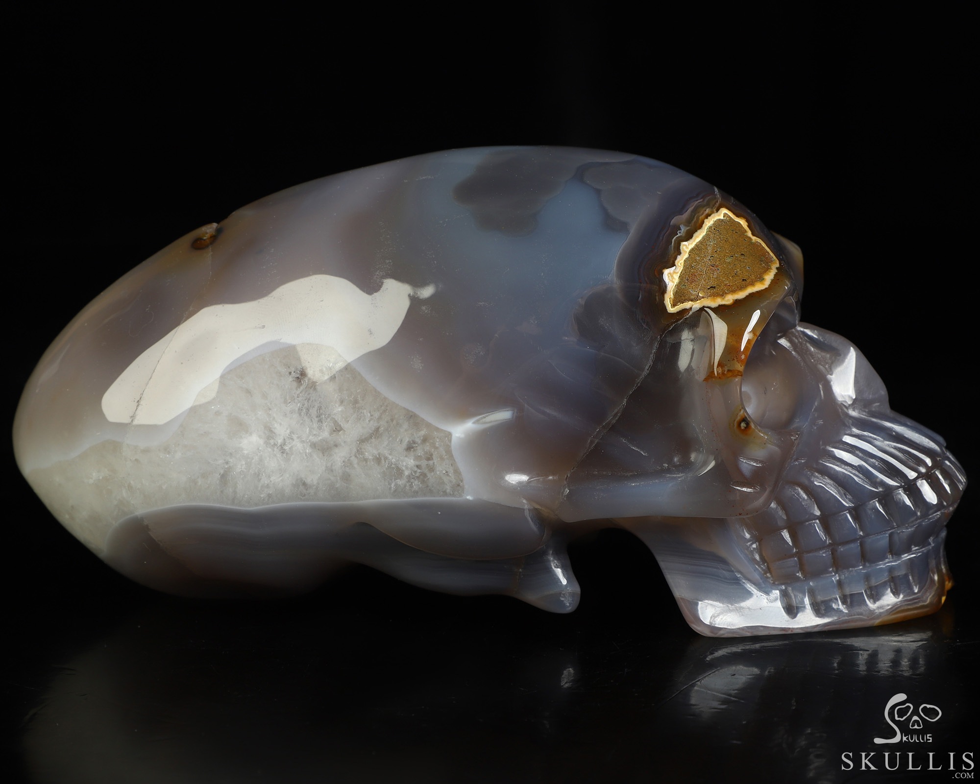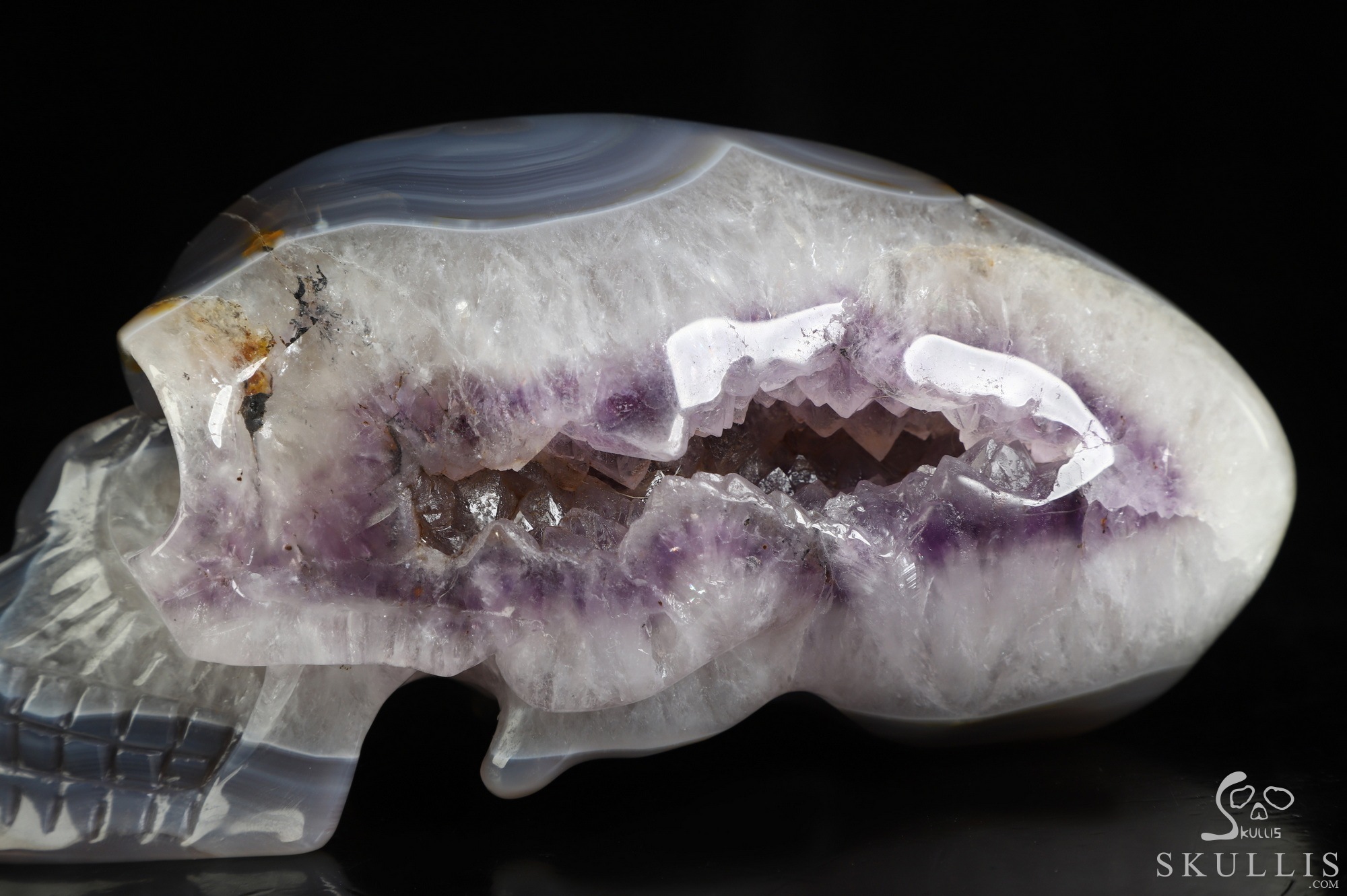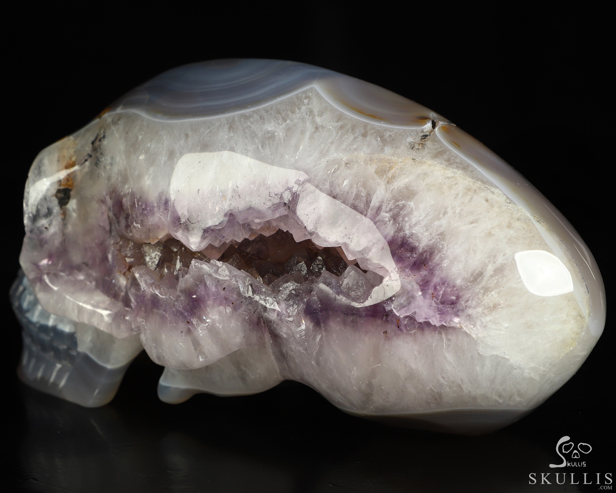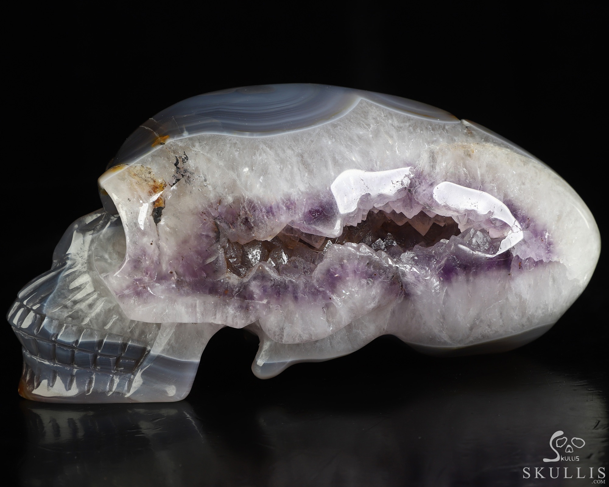 7.5" Premium Brazilian Agate Geode Hand Carved Crystal Skull Fine Art Sculpture, Crystal Healing