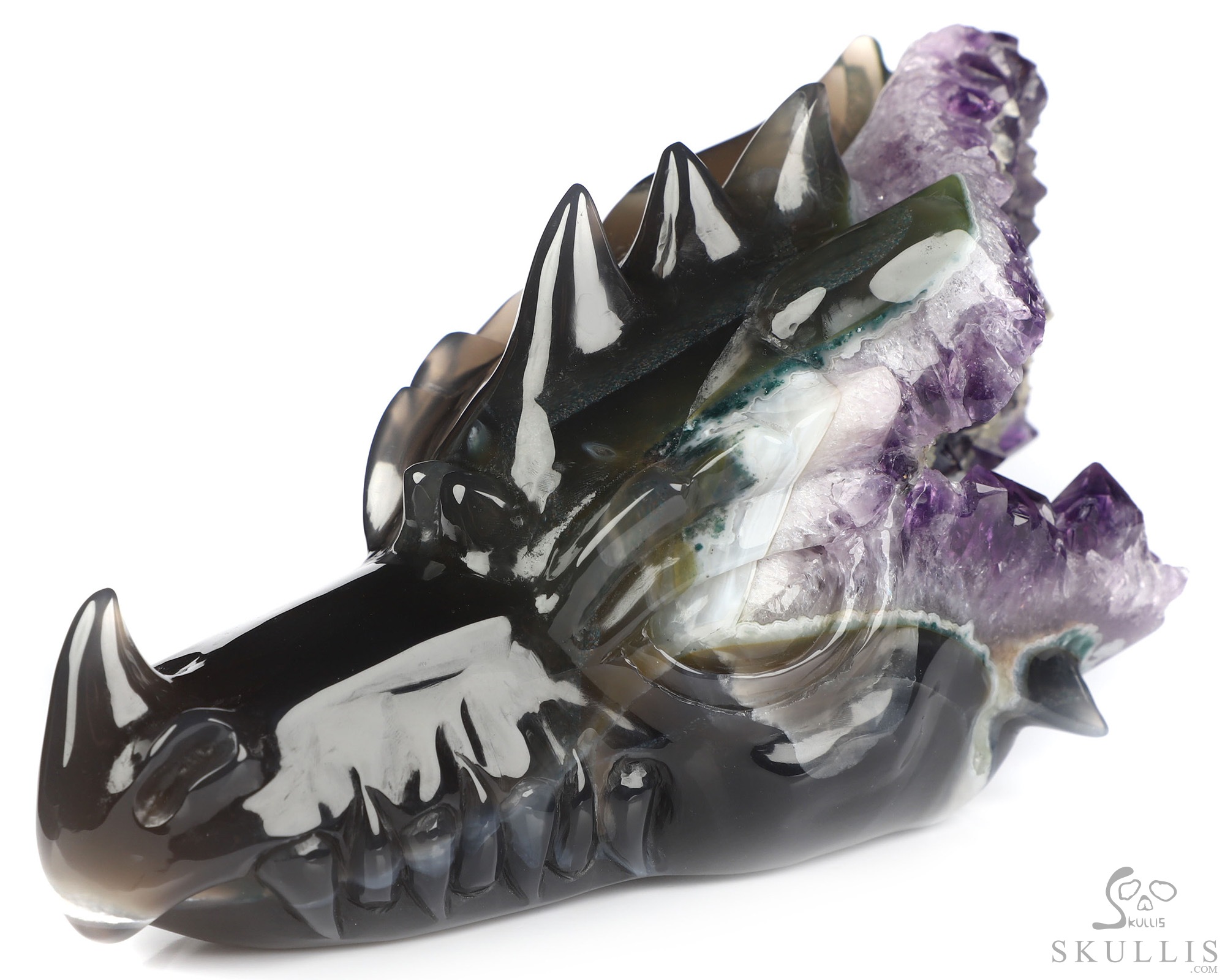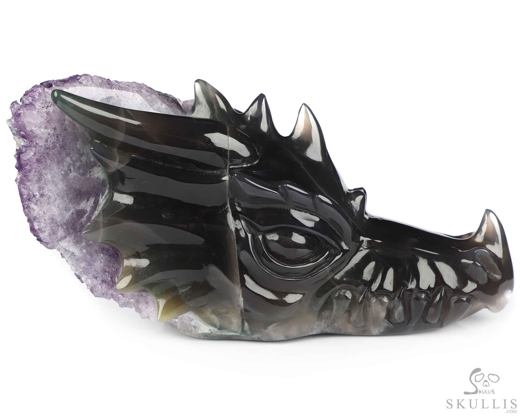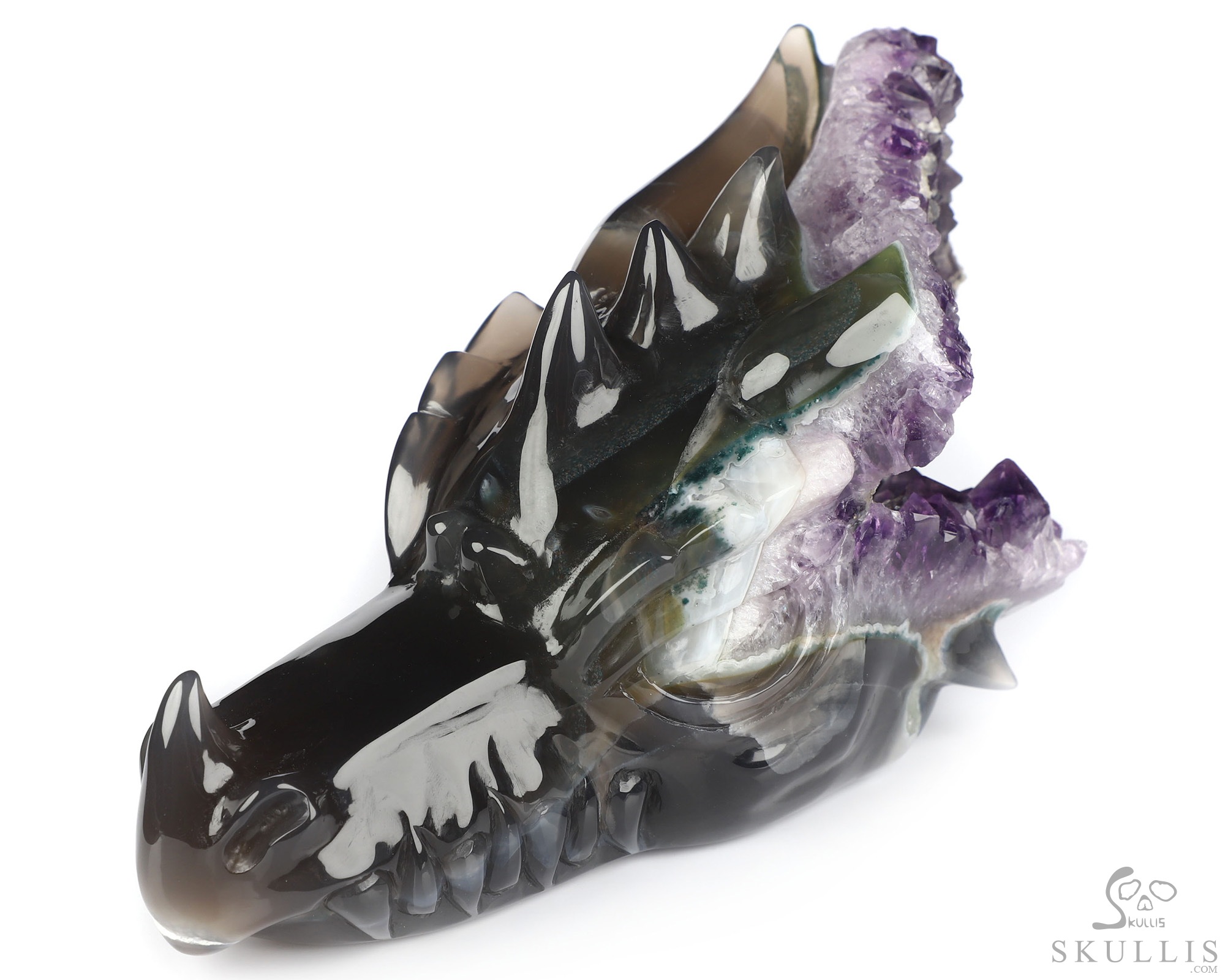 6.5" Agate Amethyst Geode Hand Carved Crystal Dragon Head Skull Sculpture, Crystal Healing