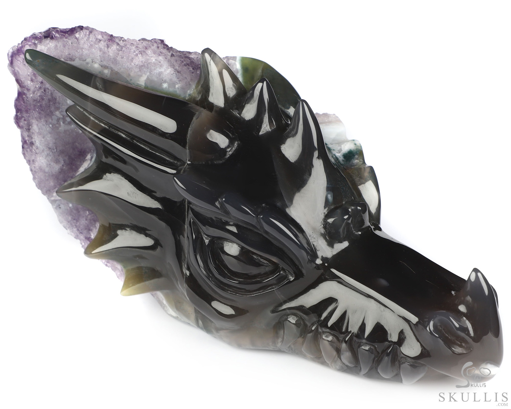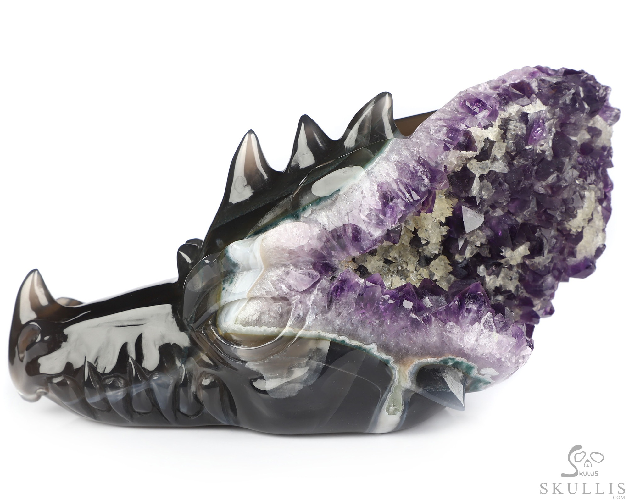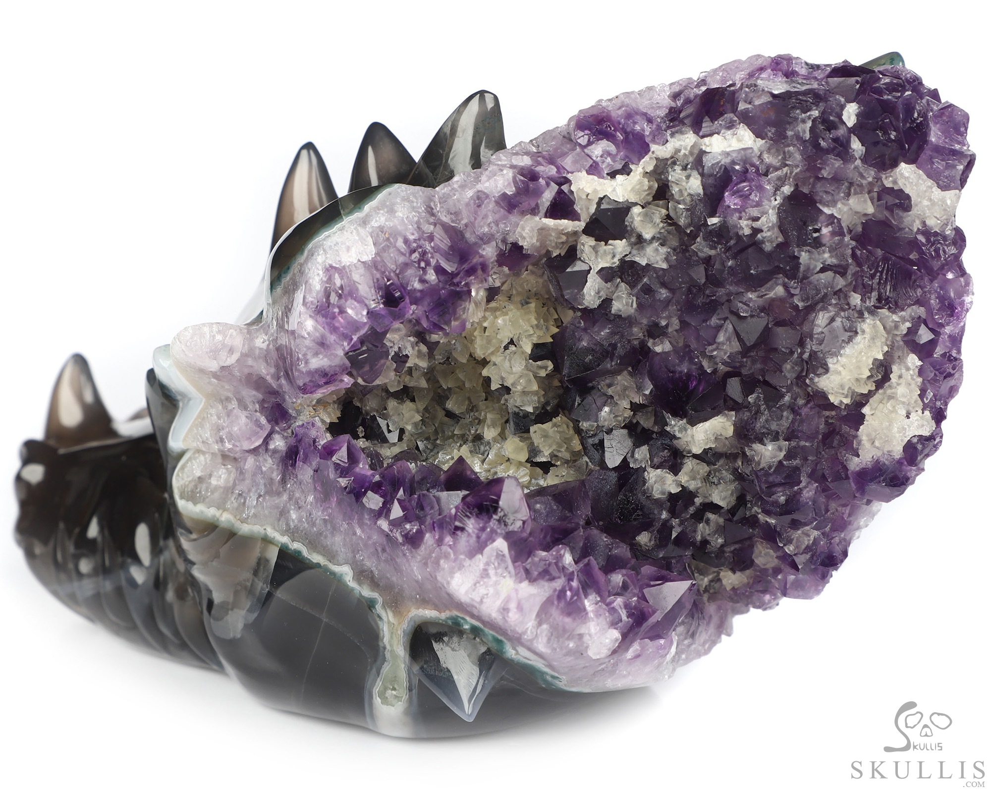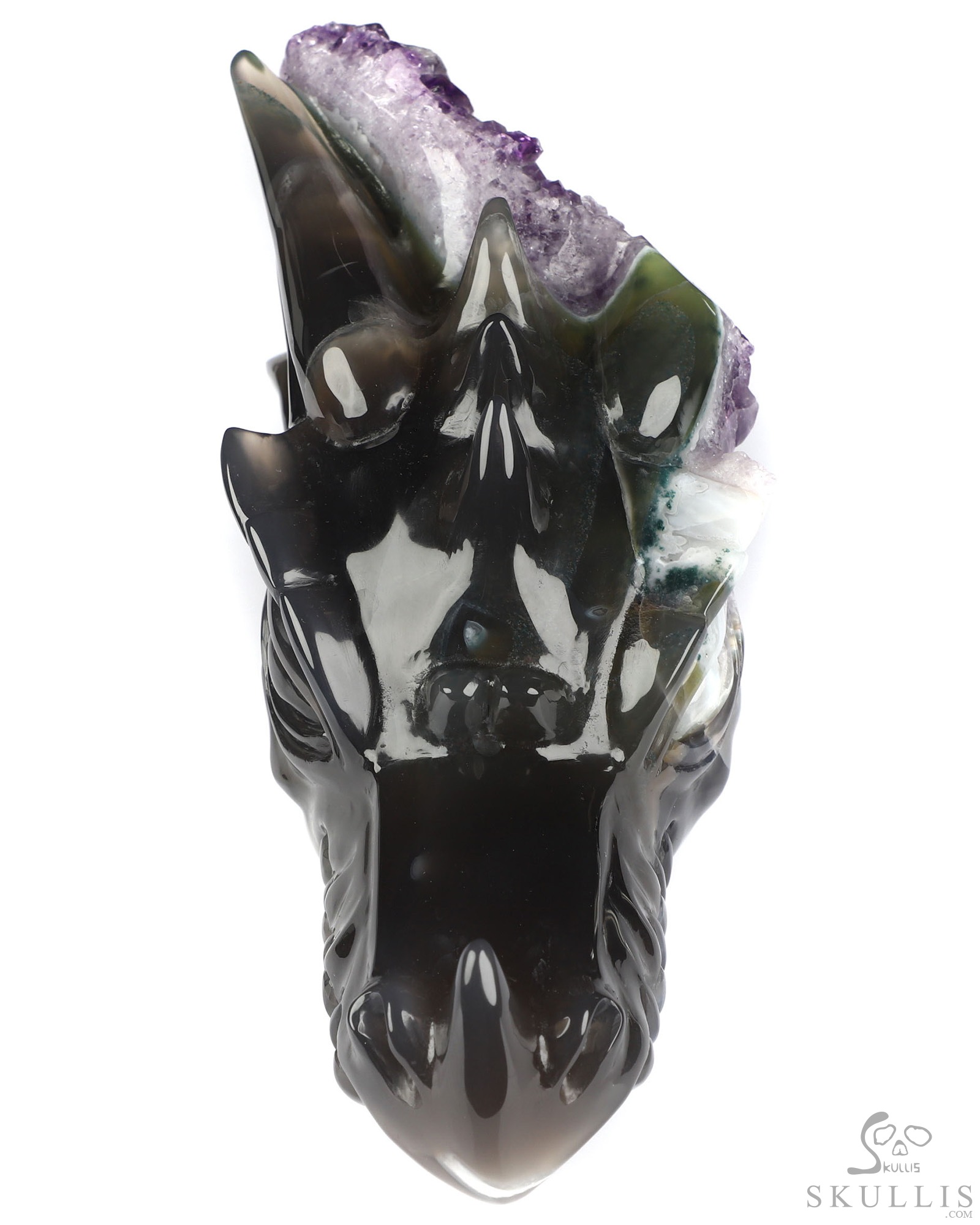6.5" Agate Amethyst Geode Hand Carved Crystal Dragon Head Skull Sculpture, Crystal Healing