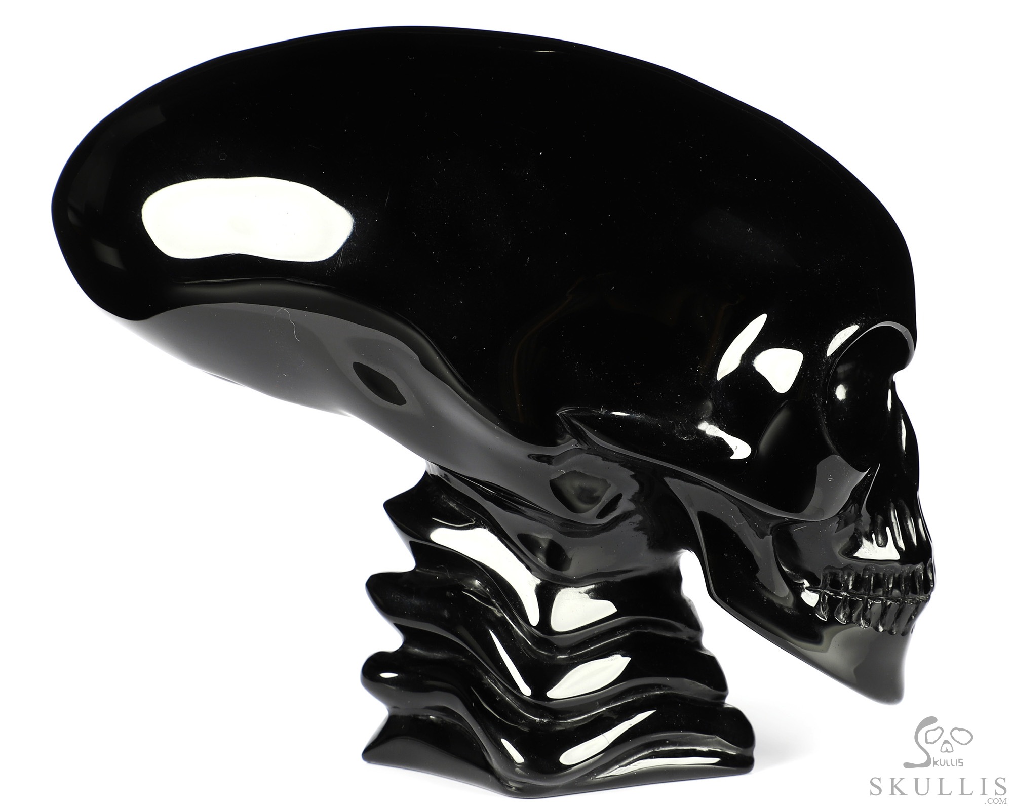 6.5" Black Obsidian Hand Carved Crystal Elongated Mayan Alien Skull with Spine Sculpture, Crystal Healing
