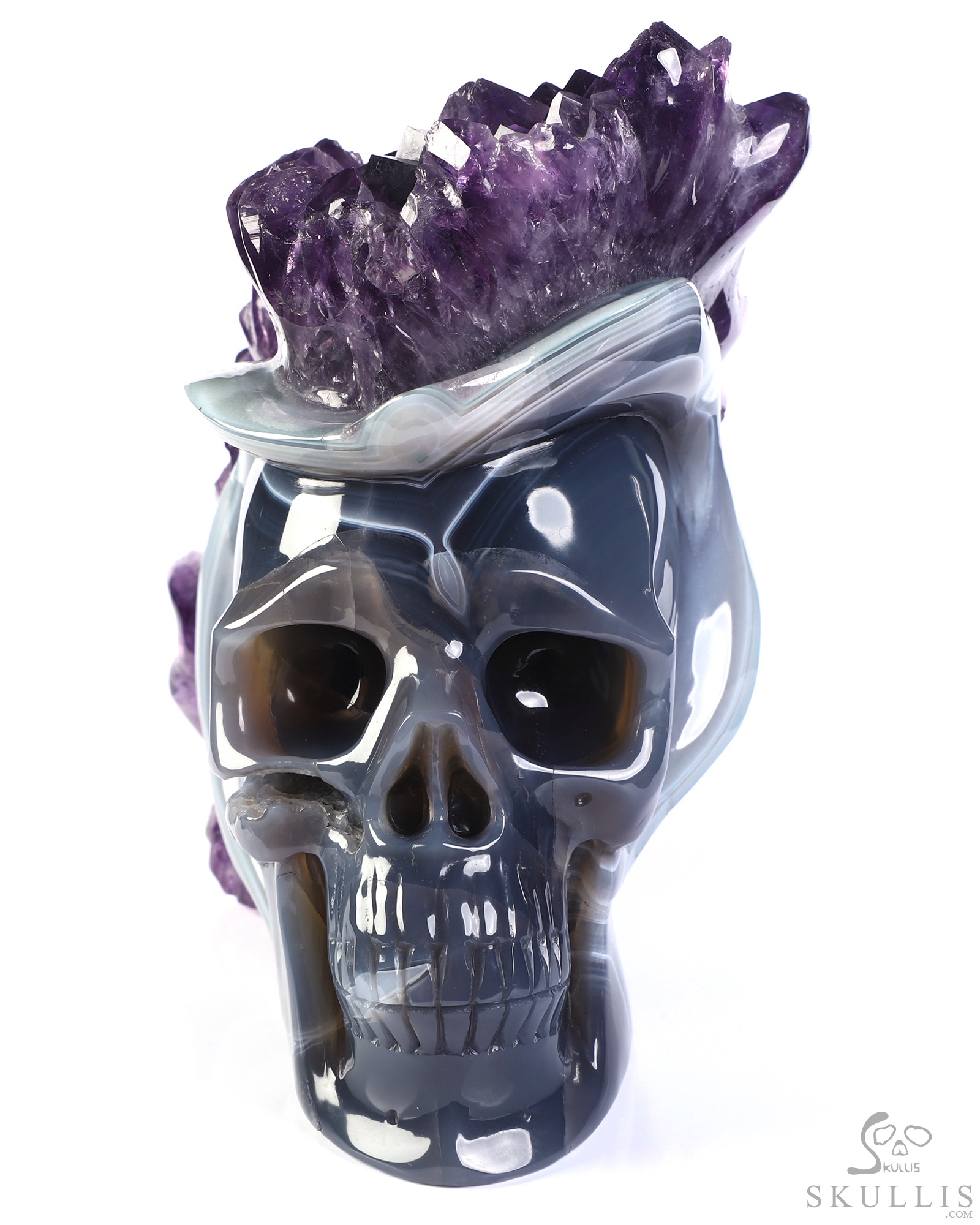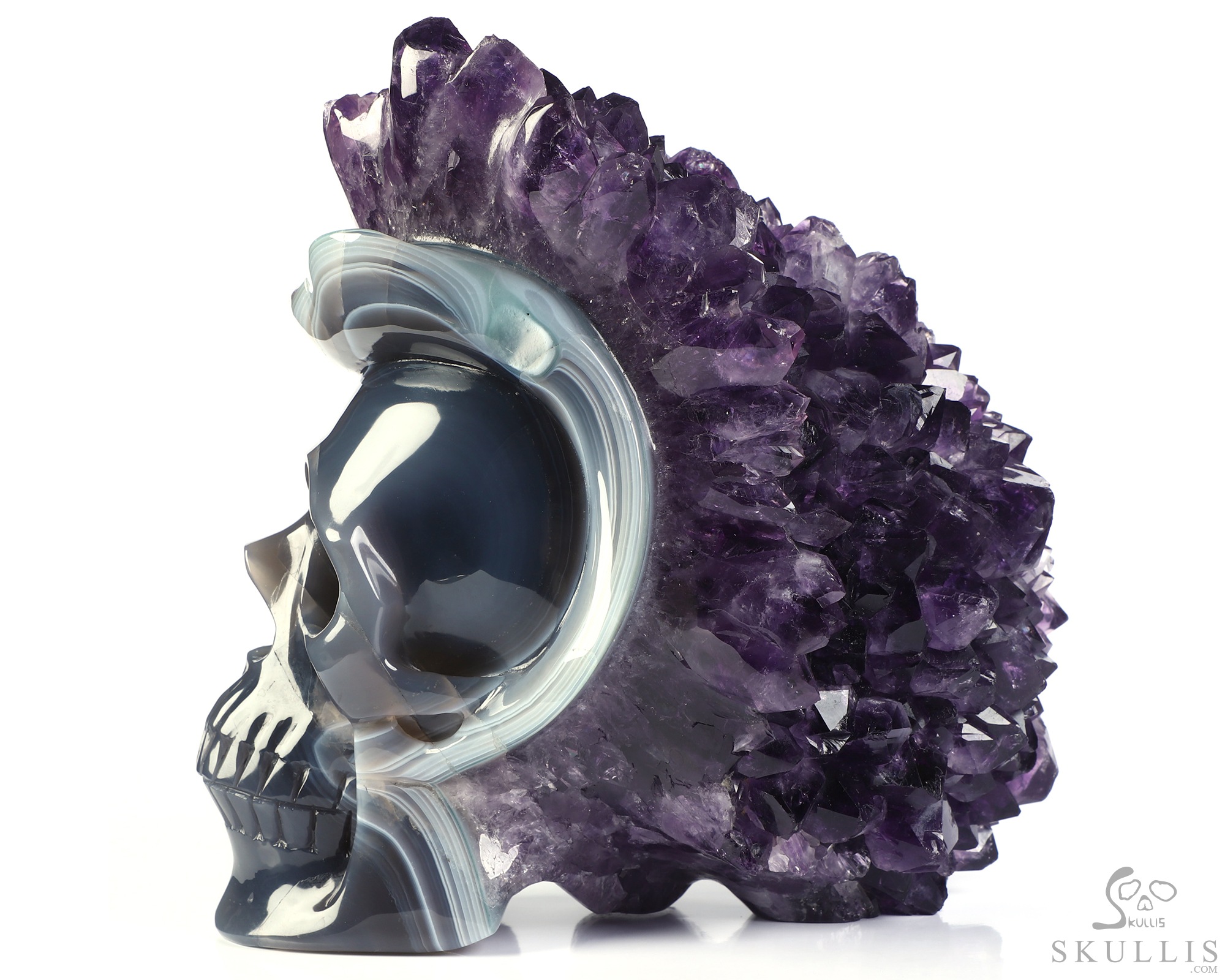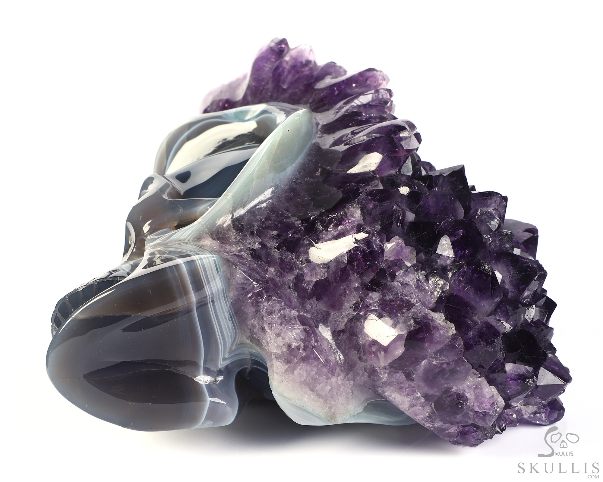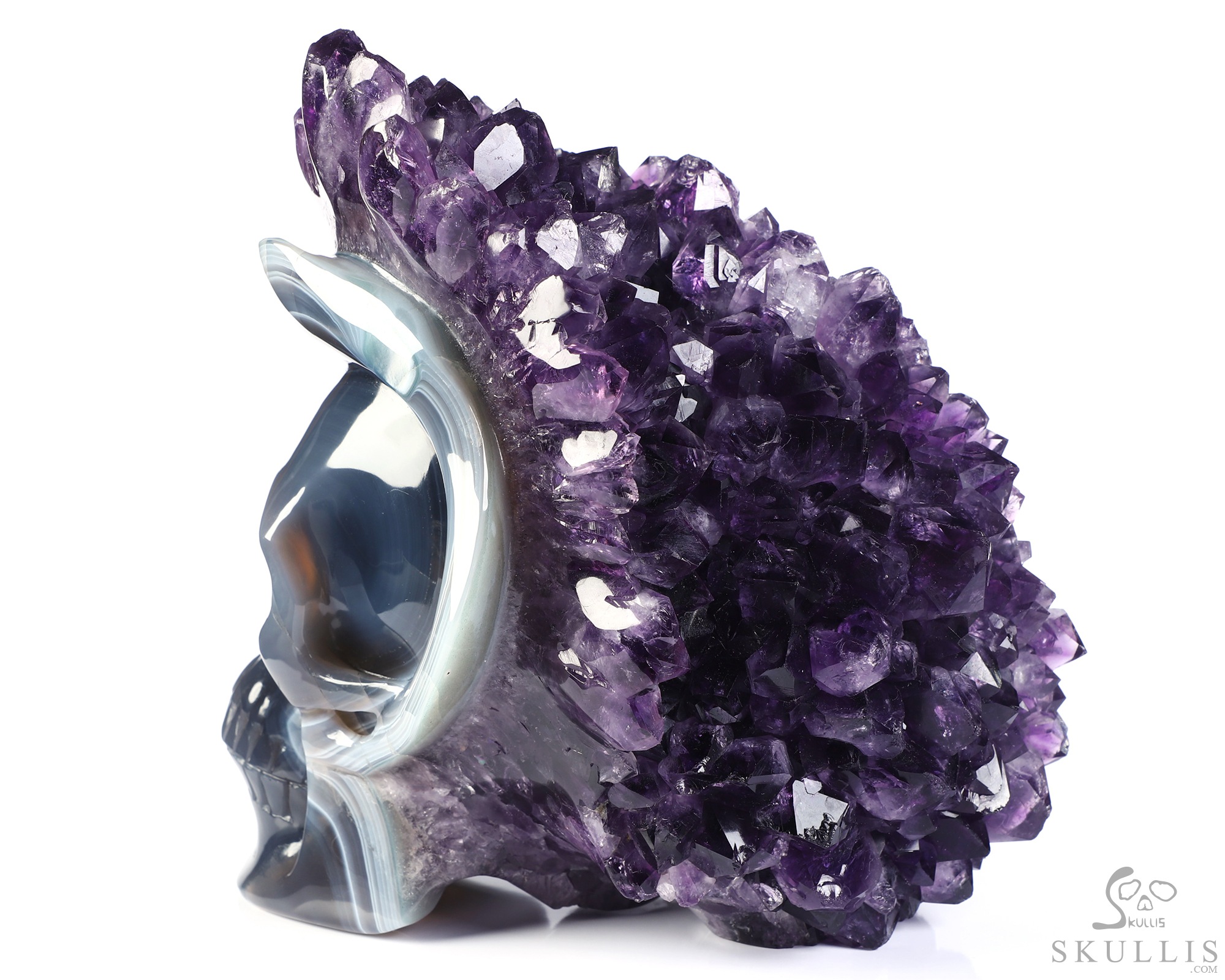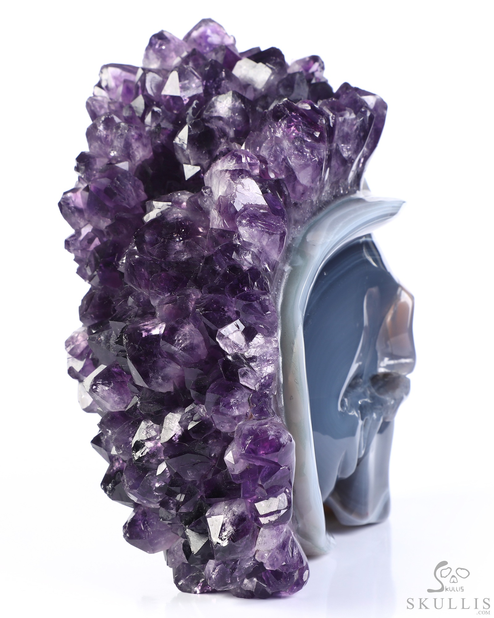 You are looking at an Agate Amethyst Druse skull. The skull is 6.8 inches from top to bottom.