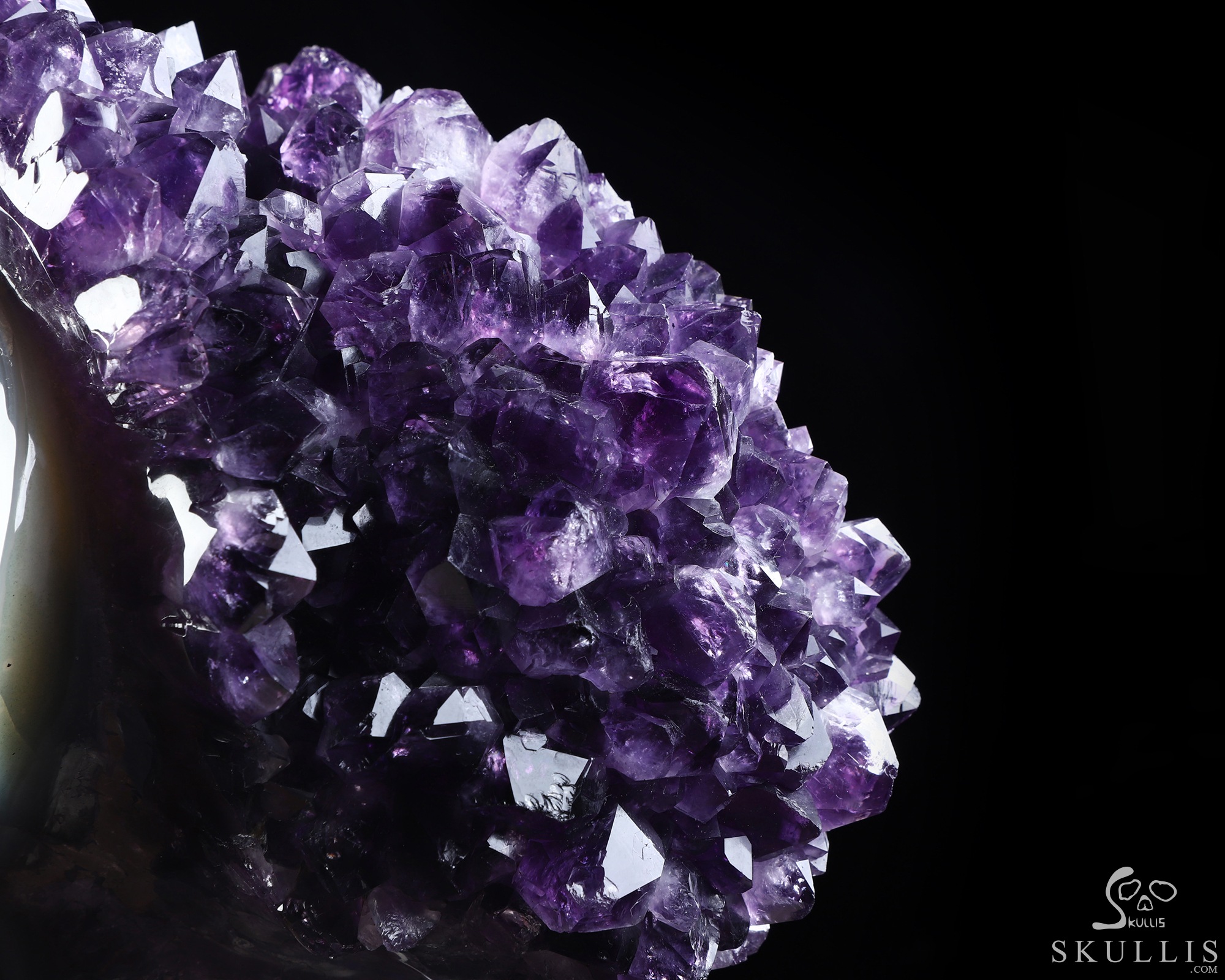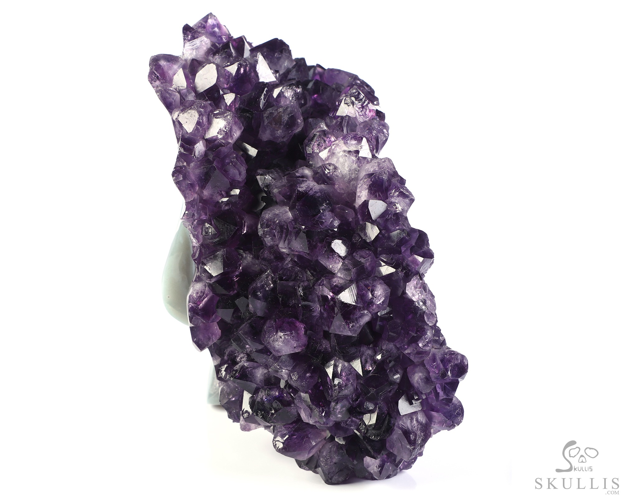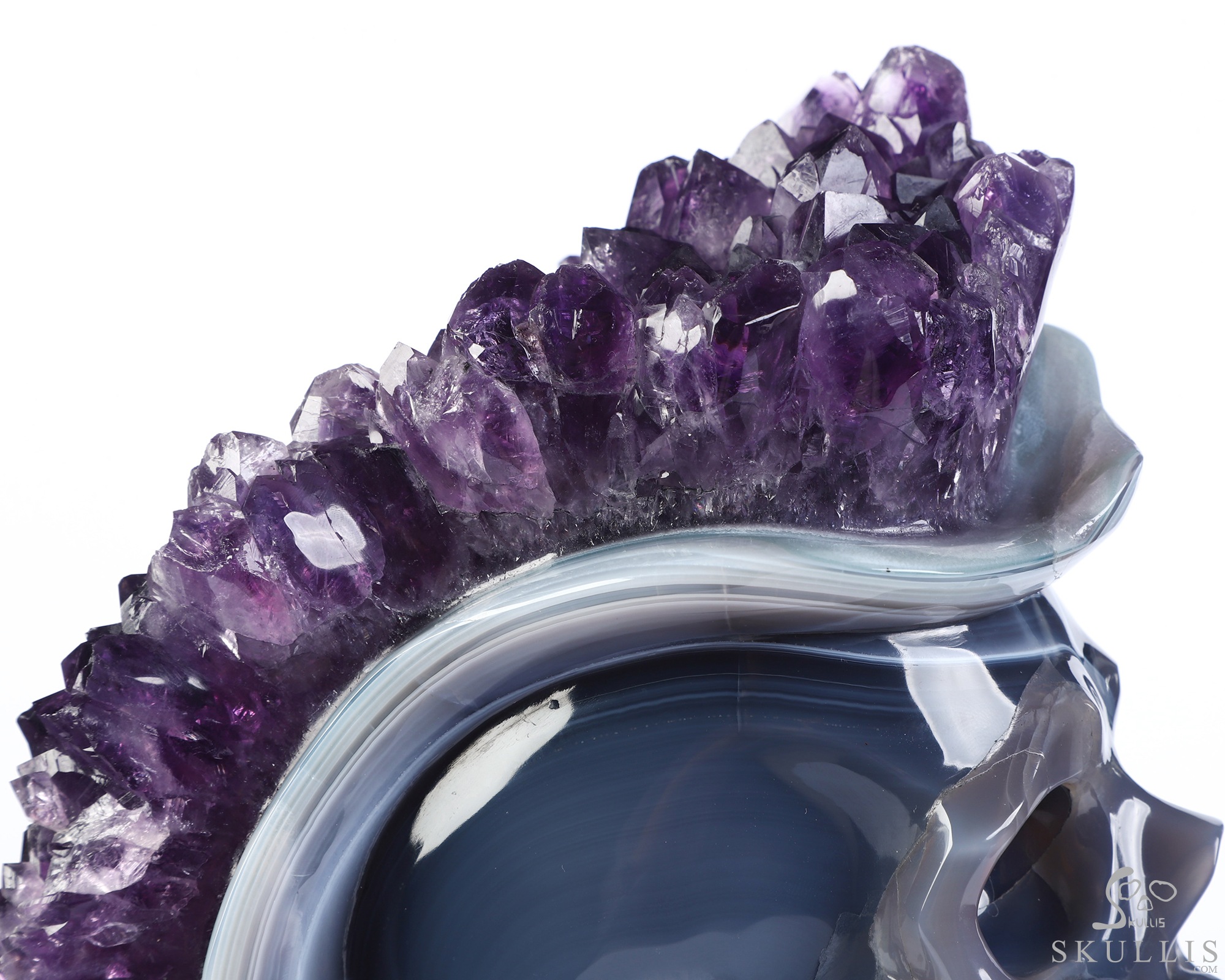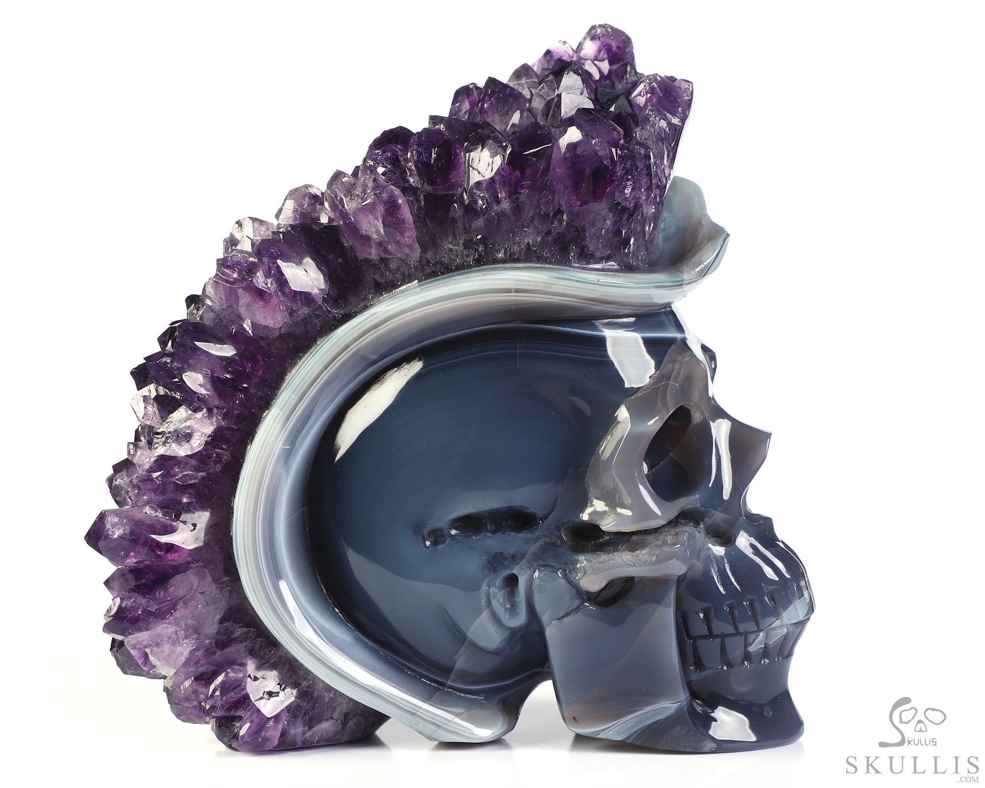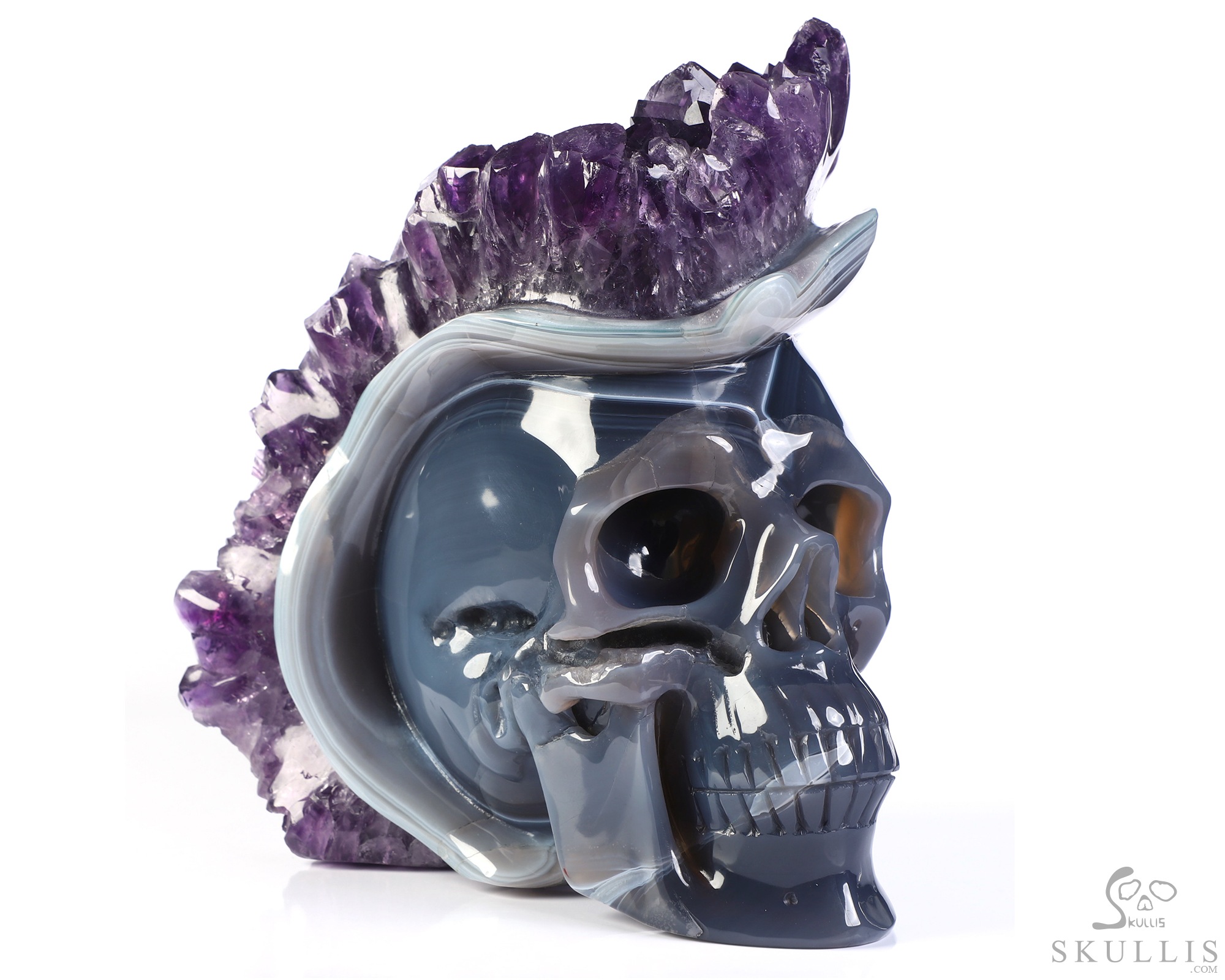 You are looking at an Agate Amethyst Druse skull. The skull is 6.8 inches from top to bottom.