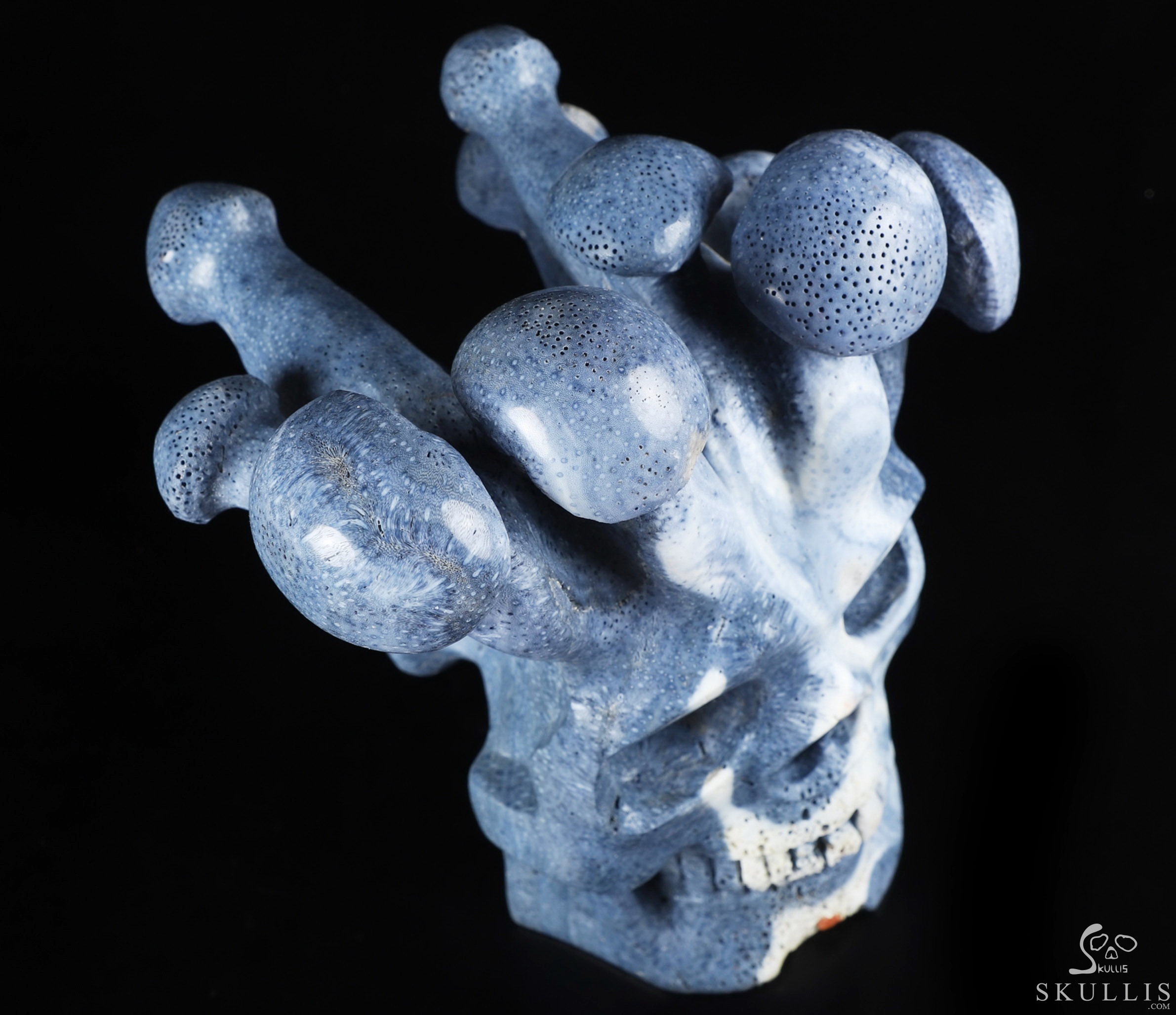 6.8" Blue Sponge Coral Carved Crystal Skull & Mushroom, Crystal Healing