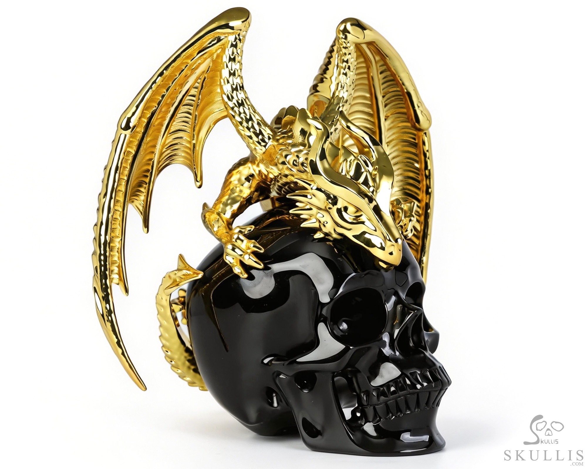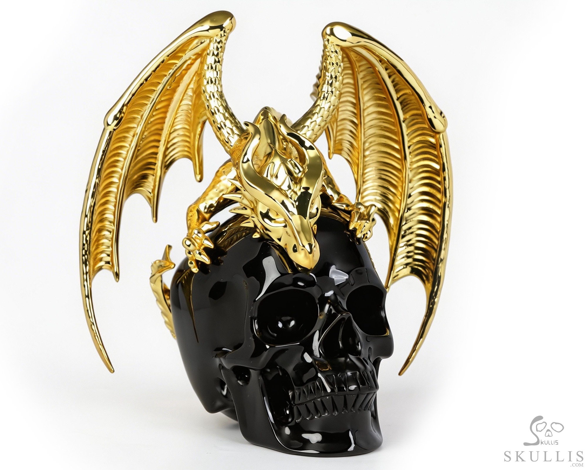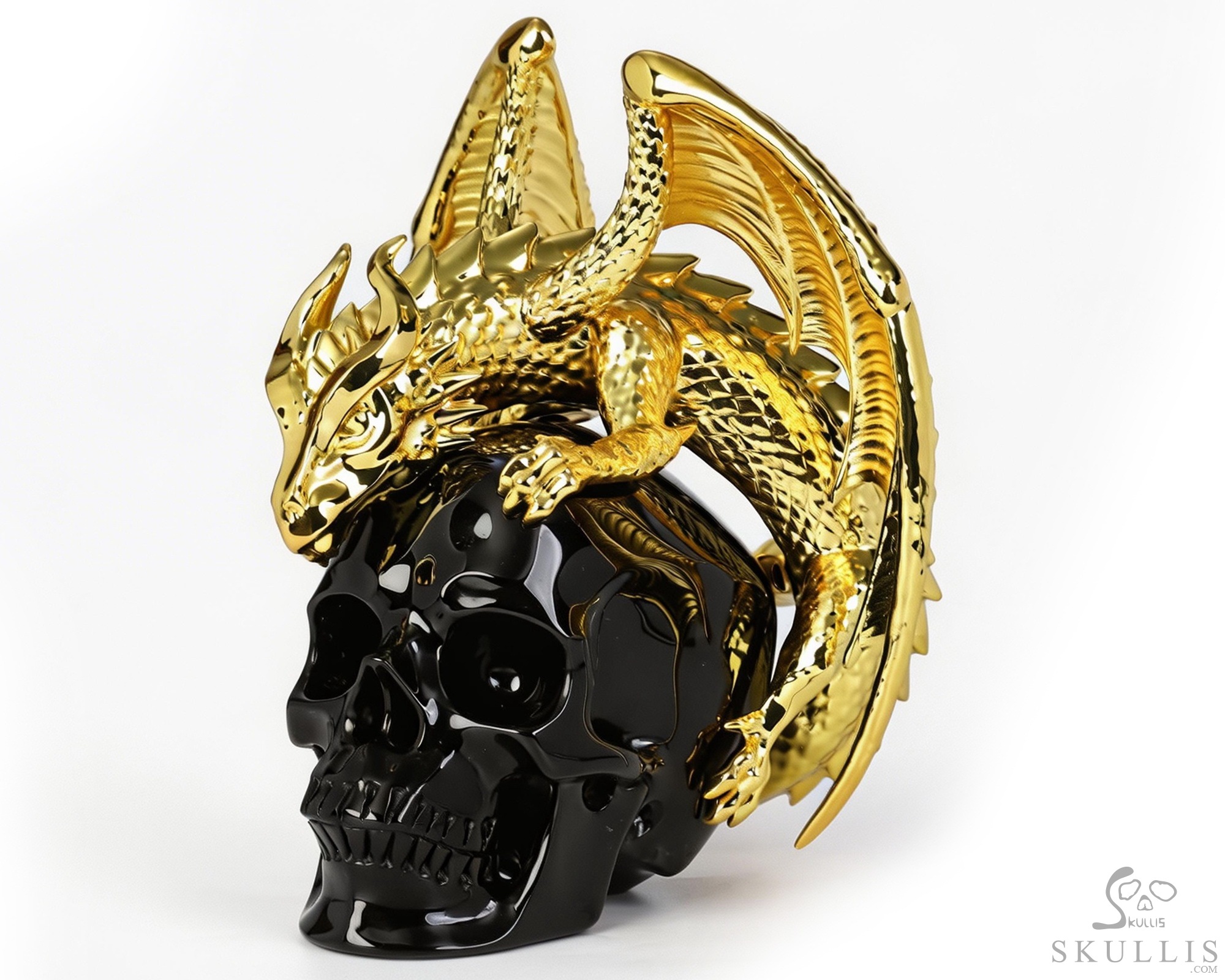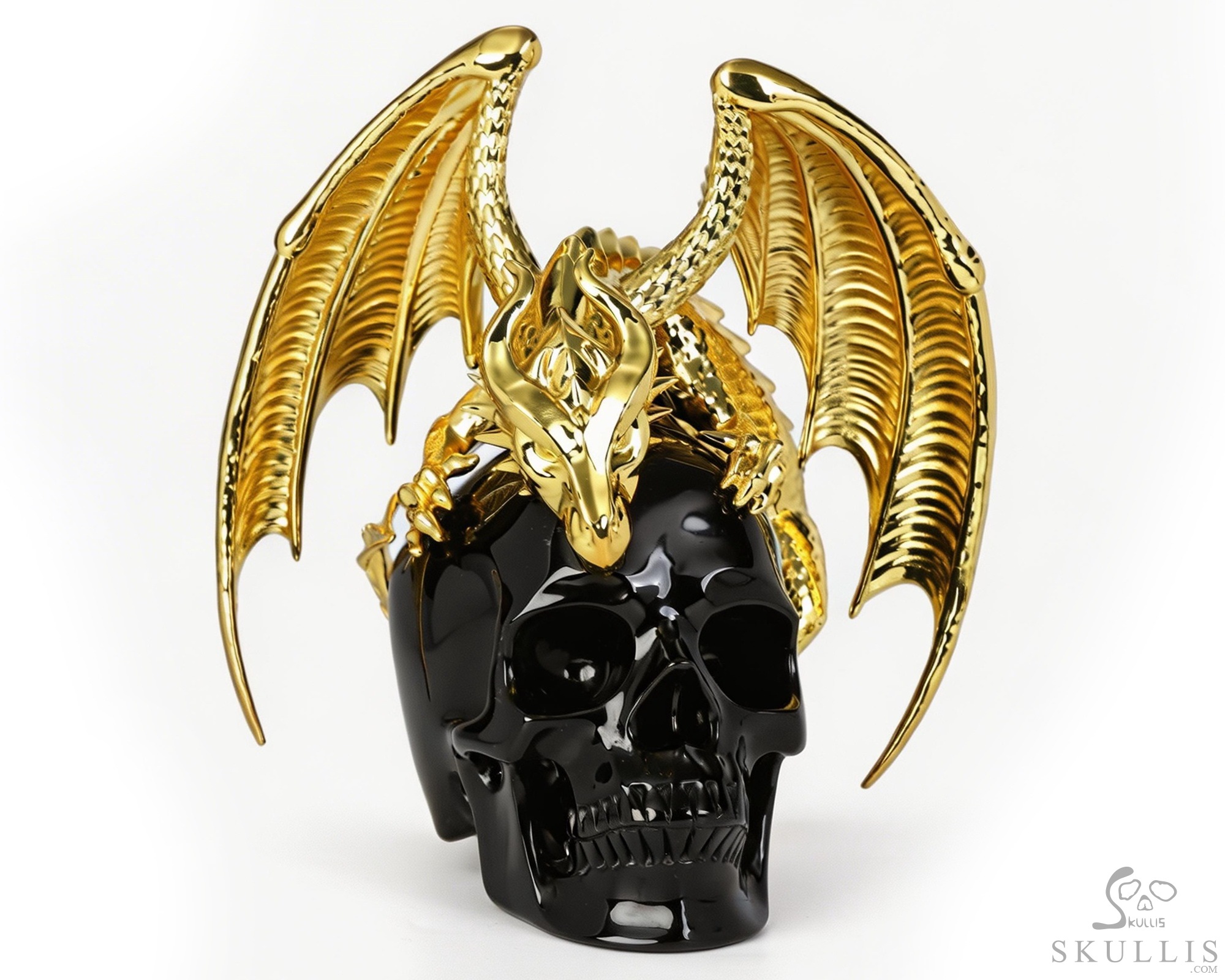 6.9" Black Obsidian Hand Carved Crystal Skull and Gold Plated Cooper Dragon Fine Art Sculpture, Crystal Healing