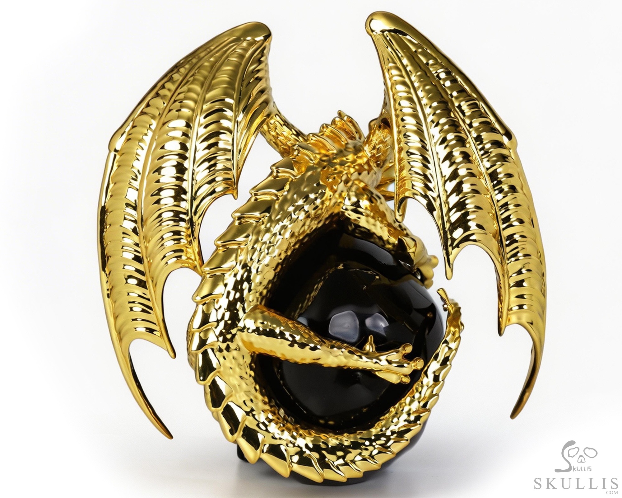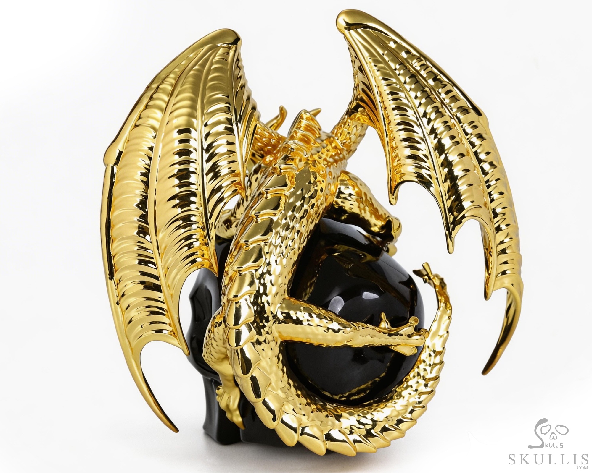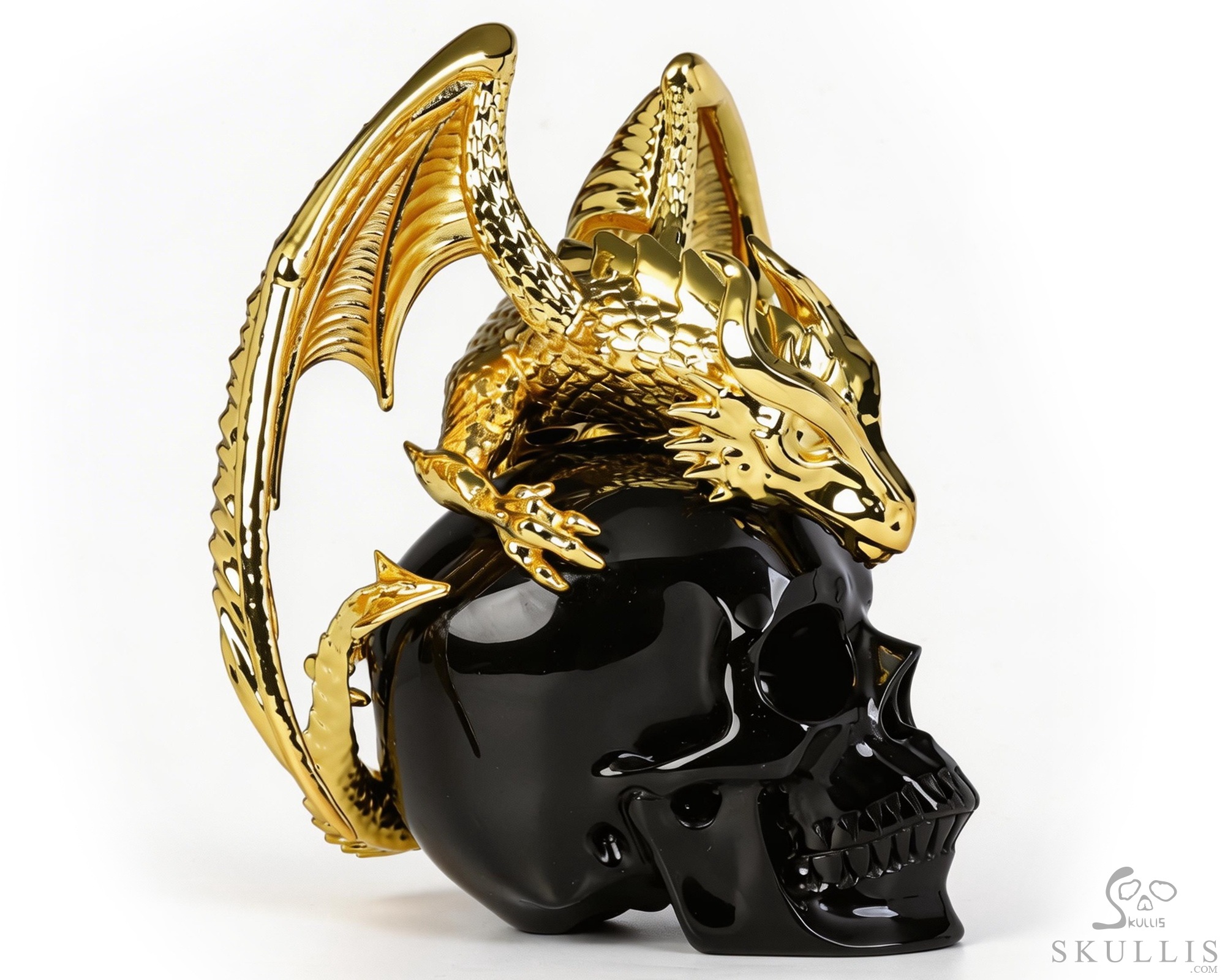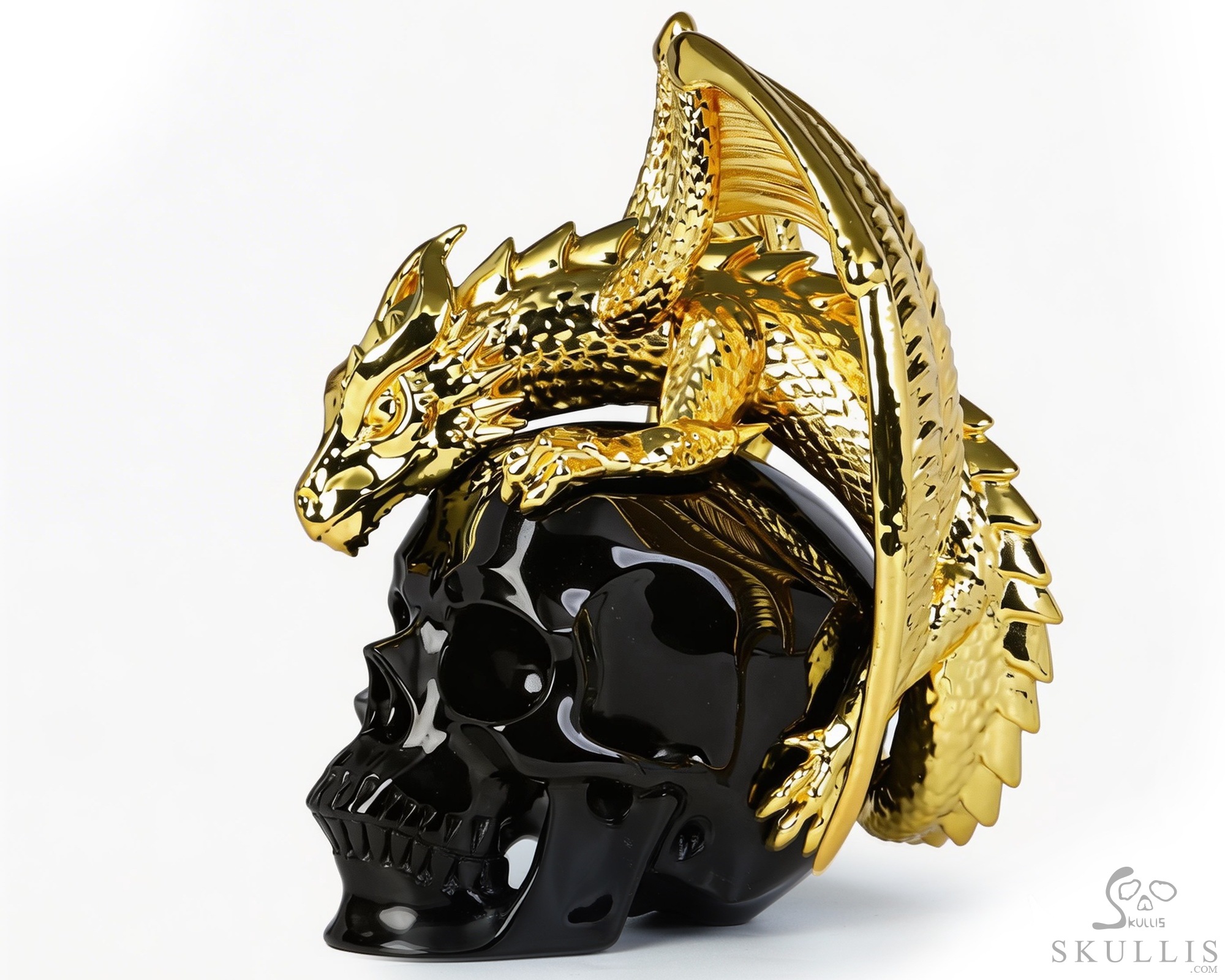 6.9" Black Obsidian Hand Carved Crystal Skull and Gold Plated Cooper Dragon Fine Art Sculpture, Crystal Healing