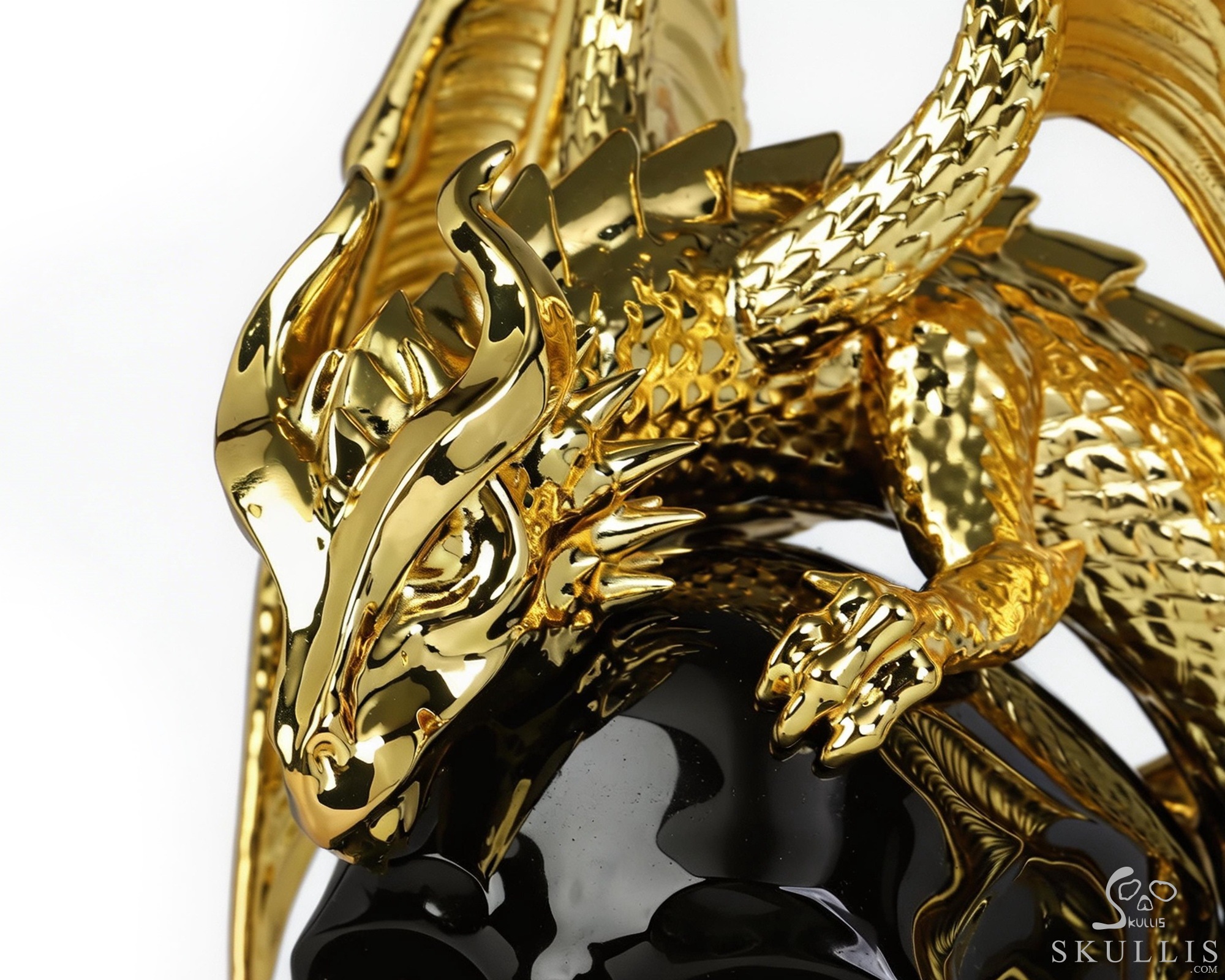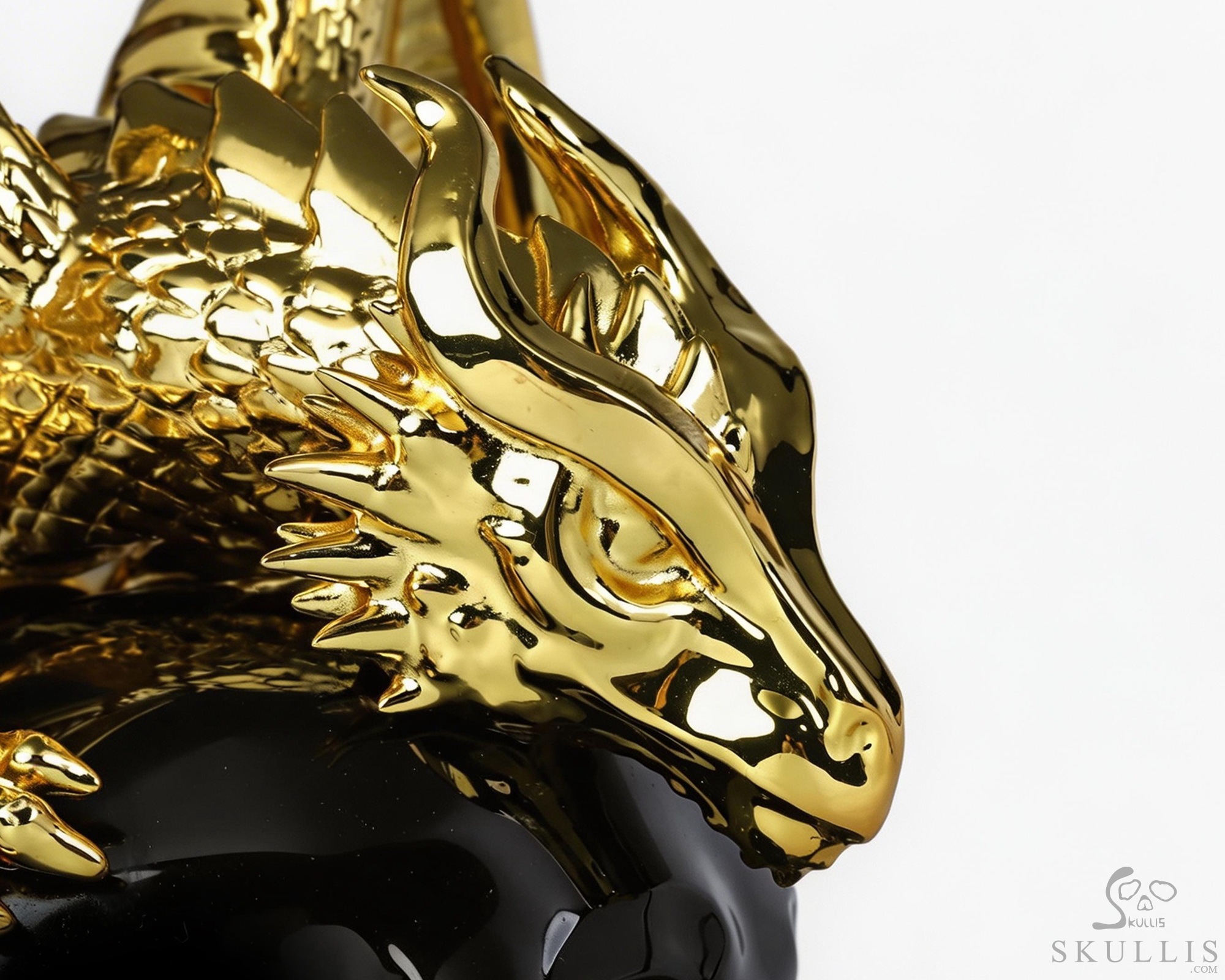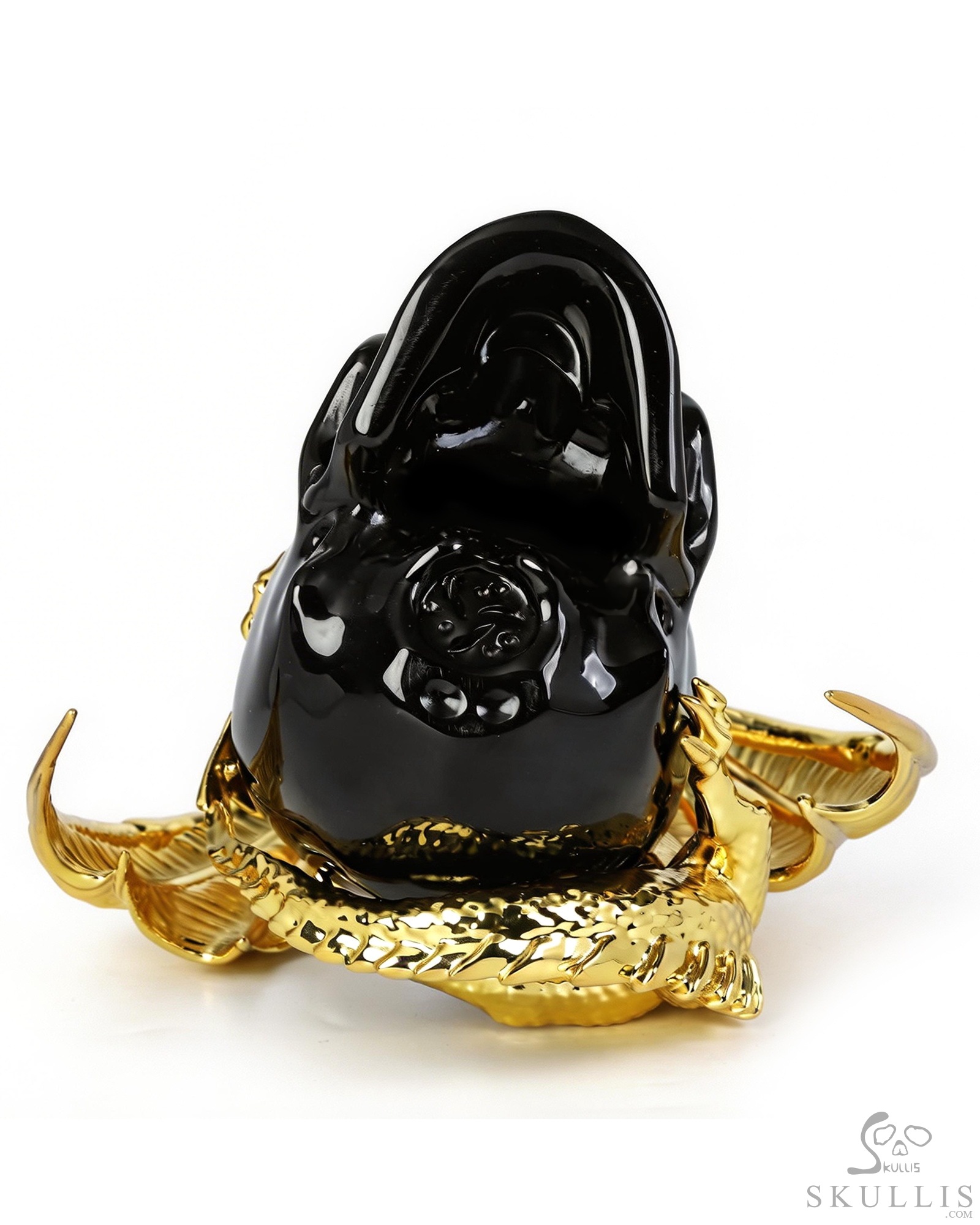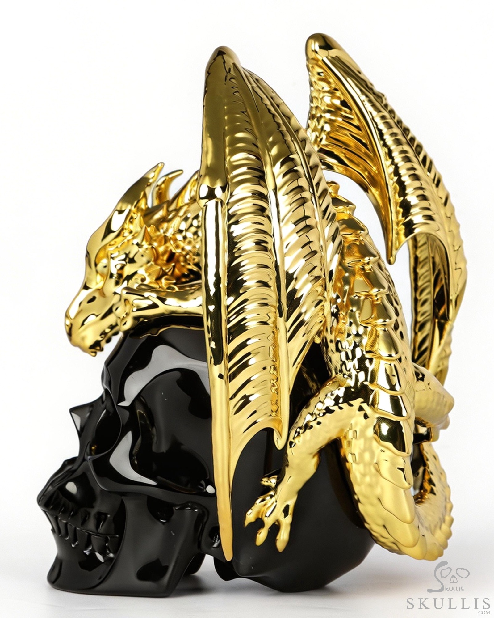 6.9" Black Obsidian Hand Carved Crystal Skull and Gold Plated Cooper Dragon Fine Art Sculpture, Crystal Healing