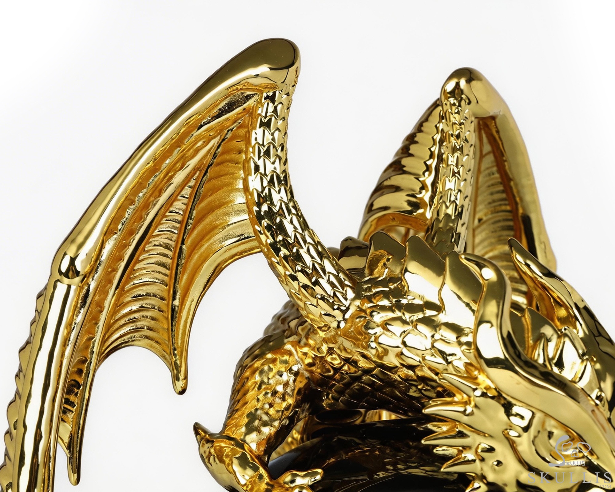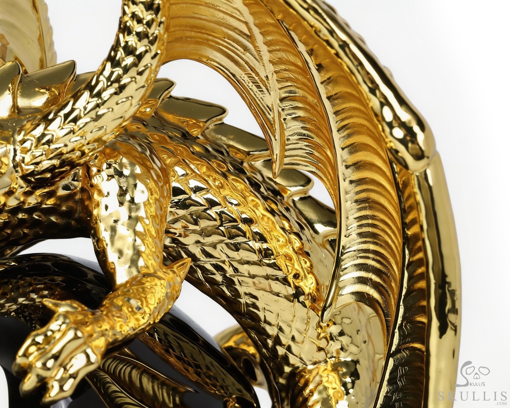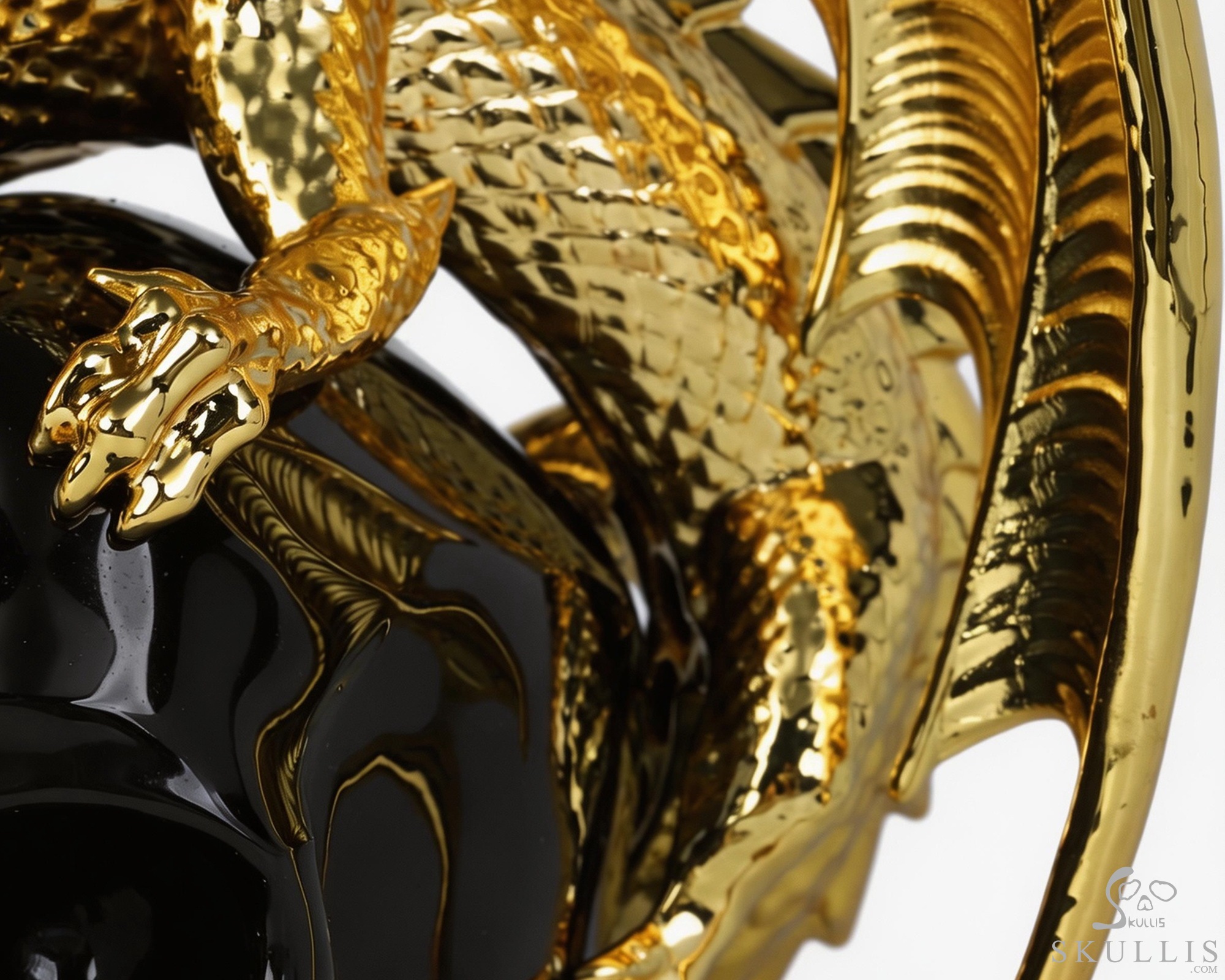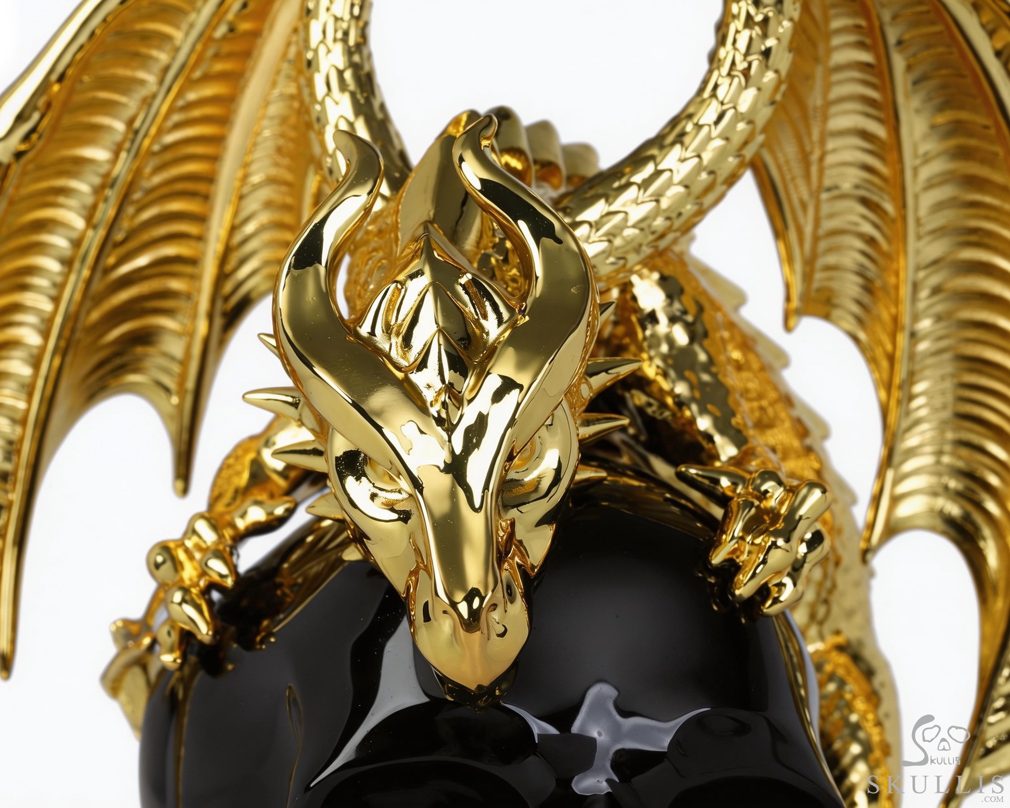 6.9" Black Obsidian Hand Carved Crystal Skull and Gold Plated Cooper Dragon Fine Art Sculpture, Crystal Healing