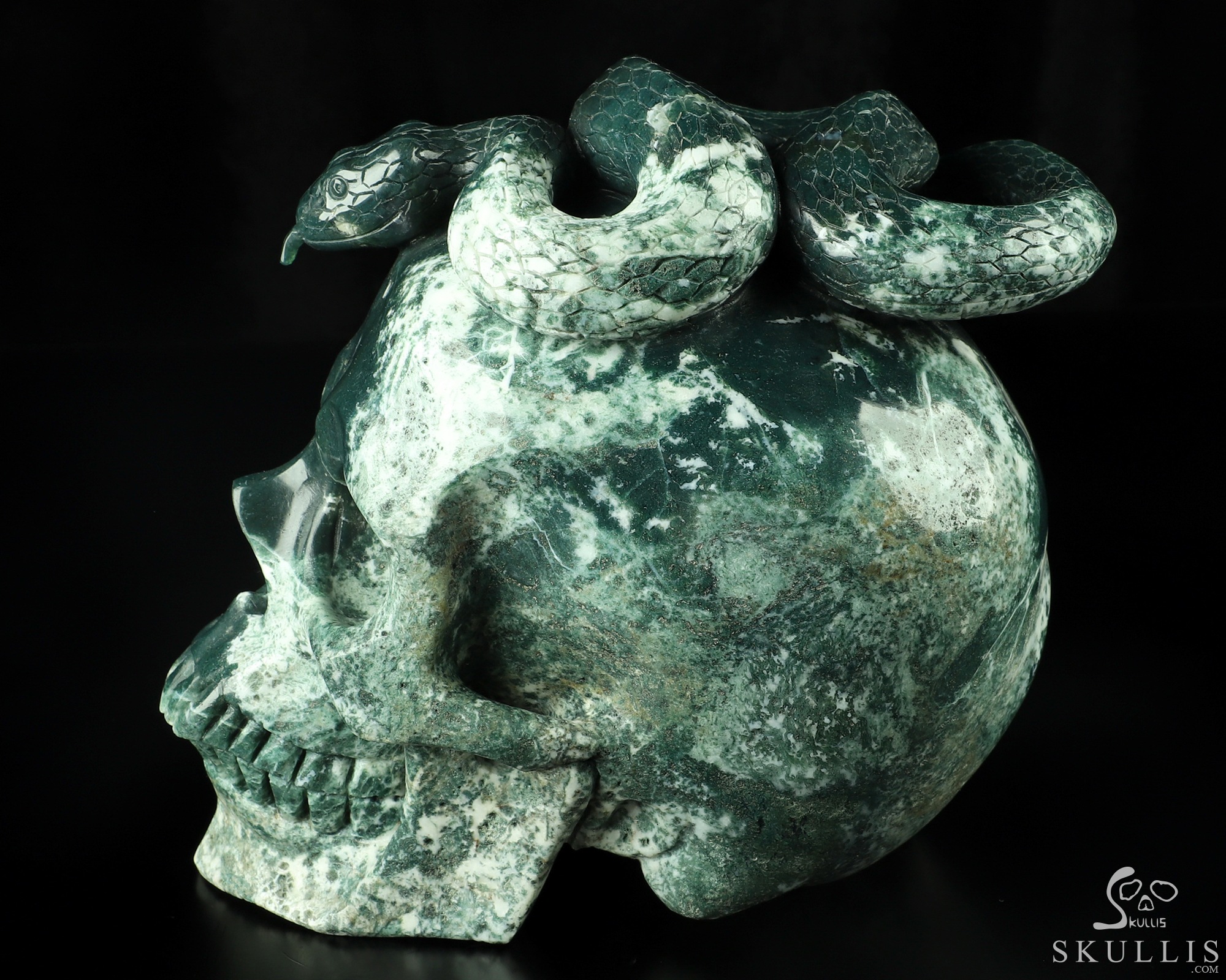 6.9" Green Moss Agate Carved Crystal Skull & Snake, Crystal Healing