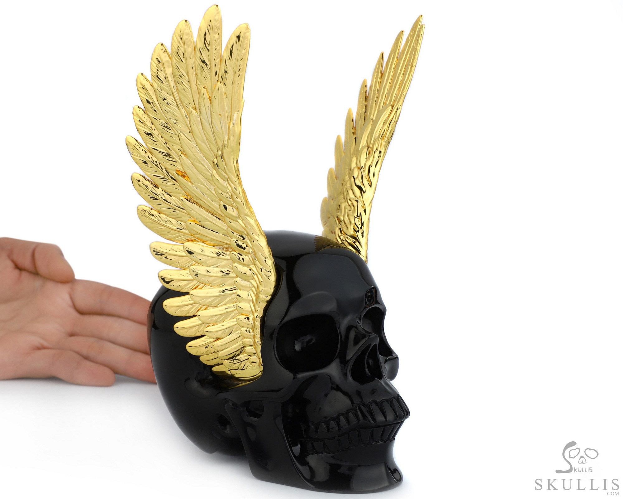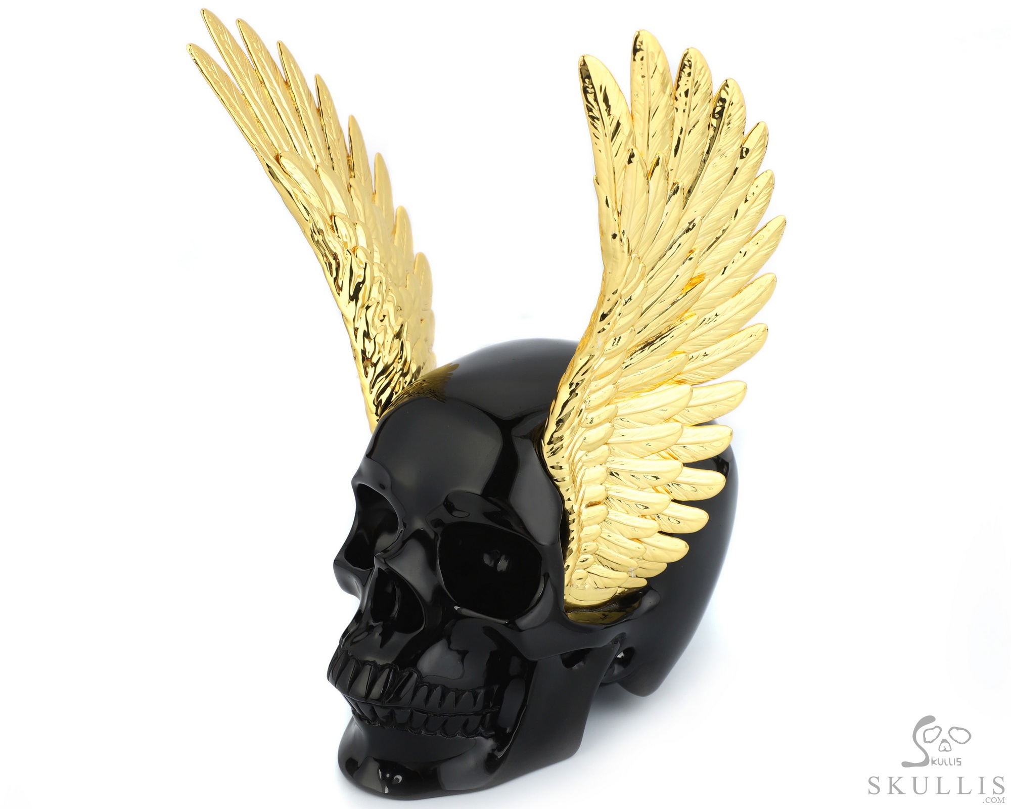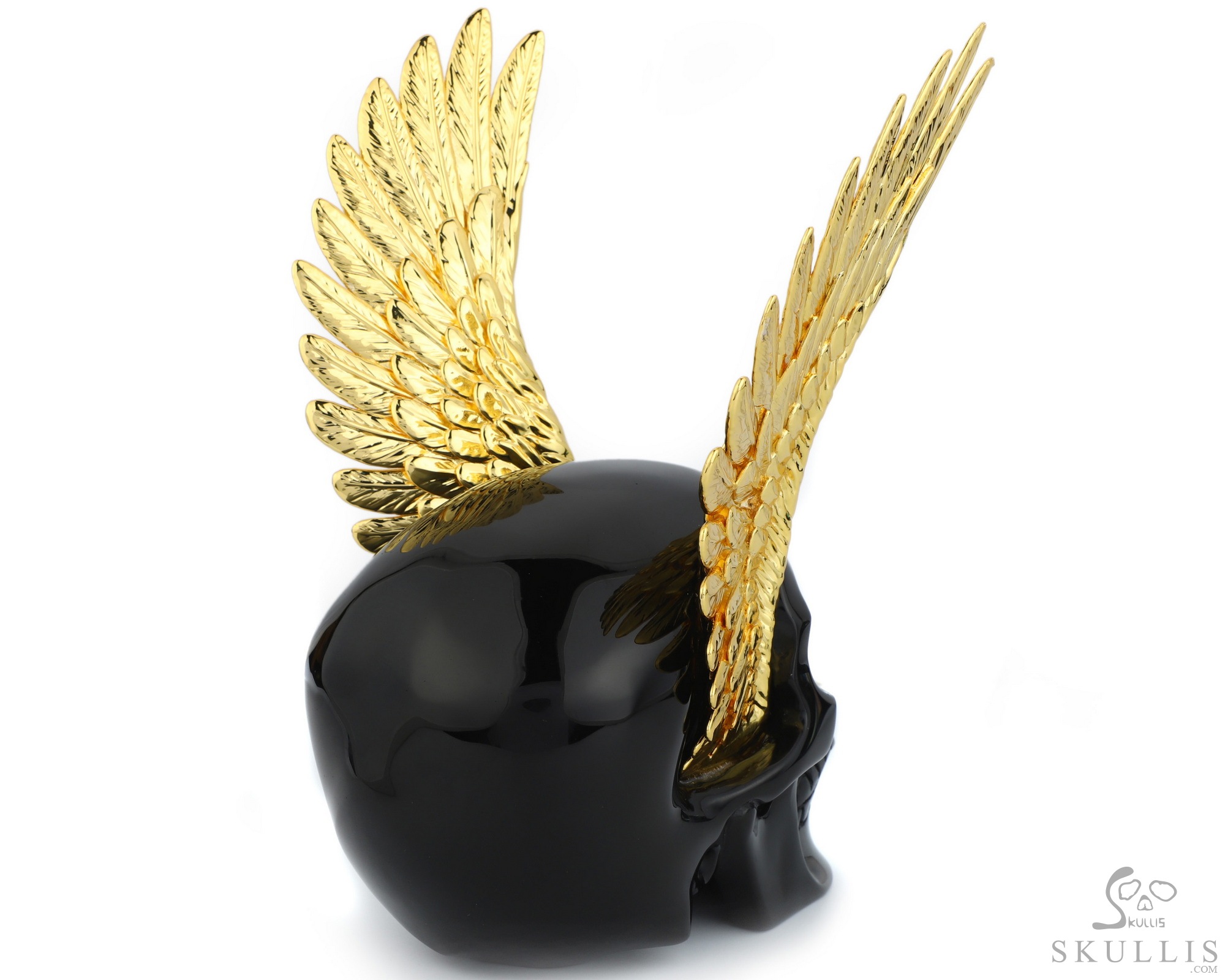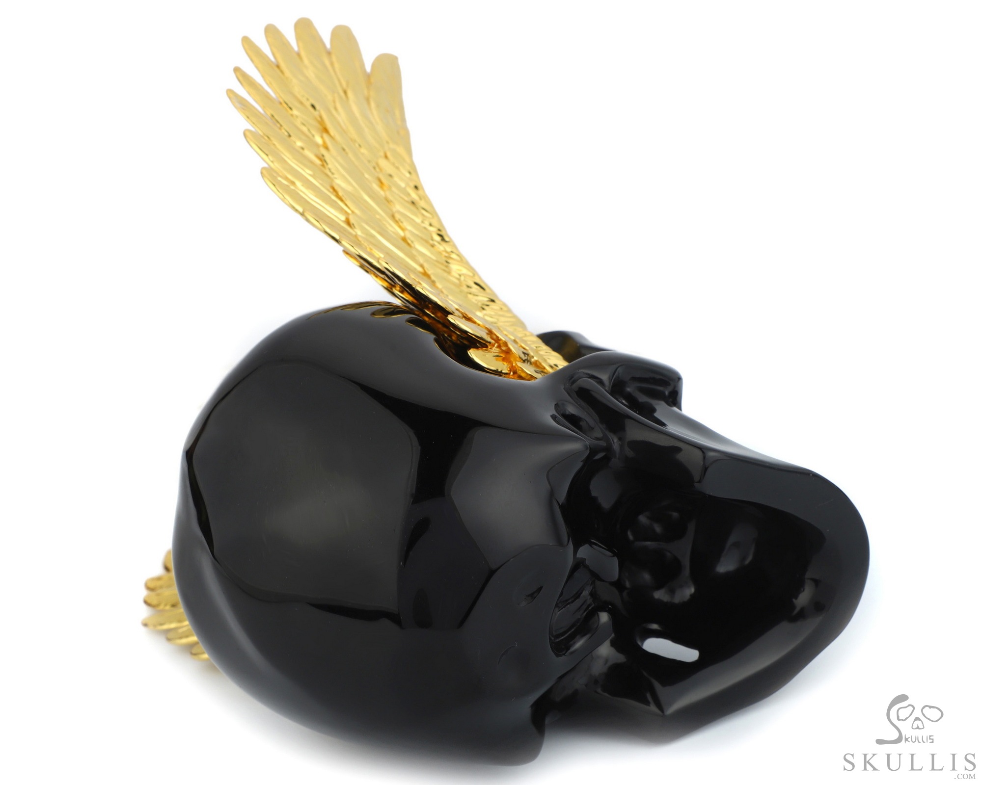 7.3" Black Obsidian Hand Carved Crystal Skull and 18K Gold Plated Cooper Wings Sculpture, Crystal Healing
