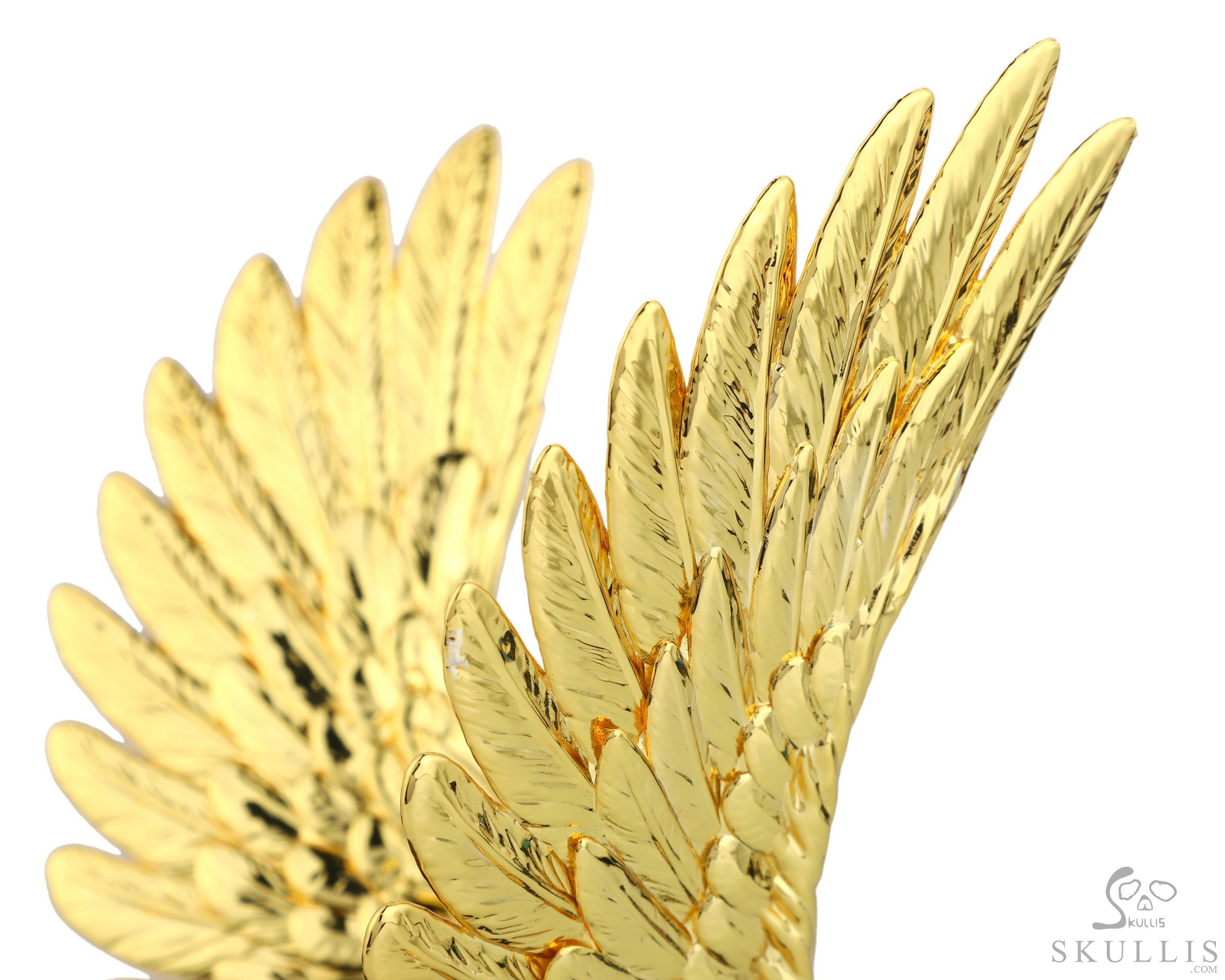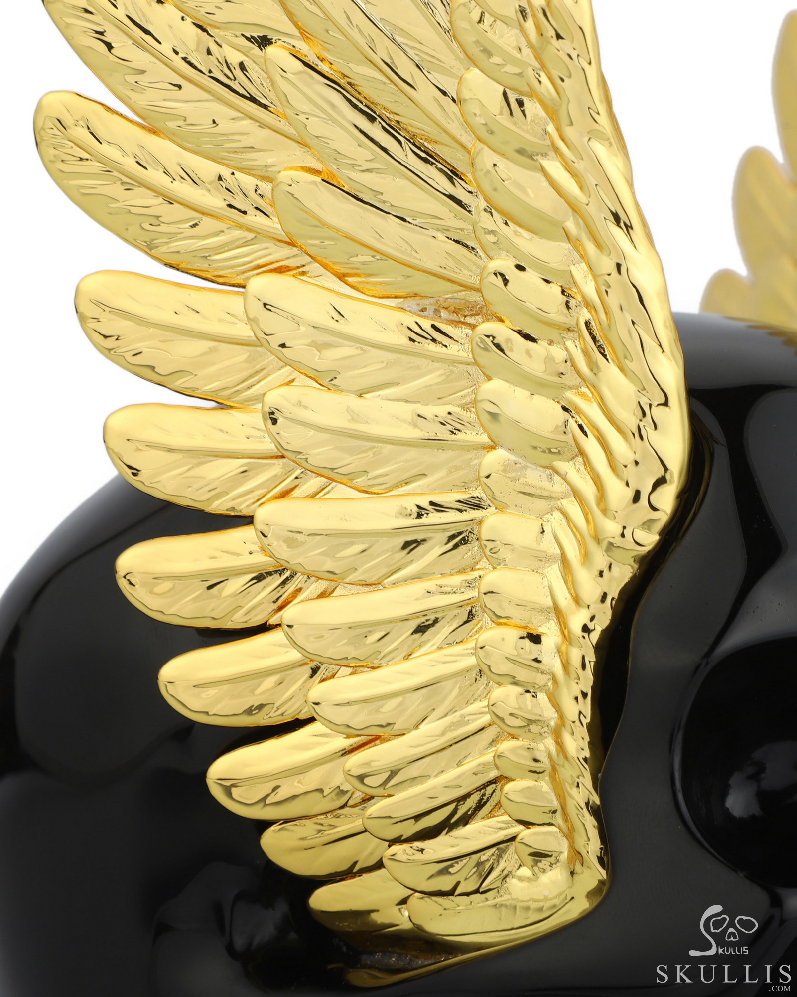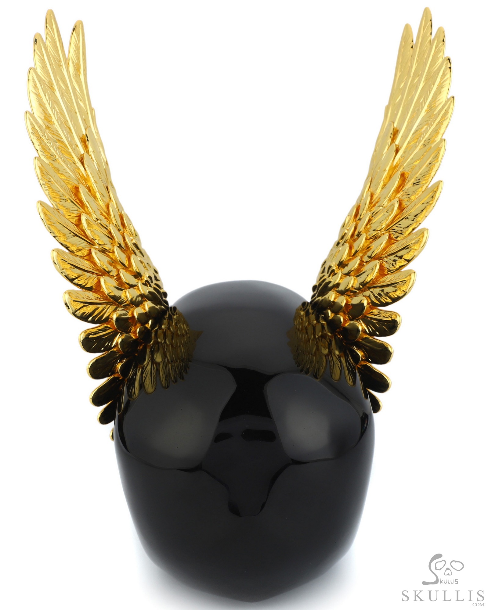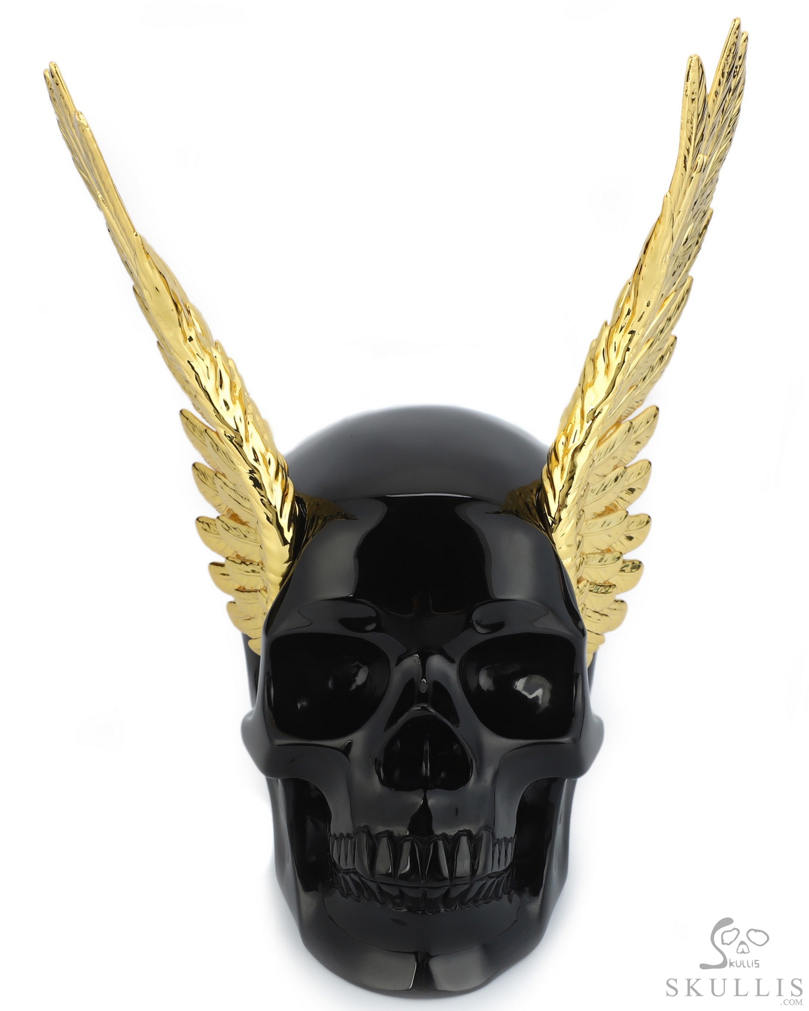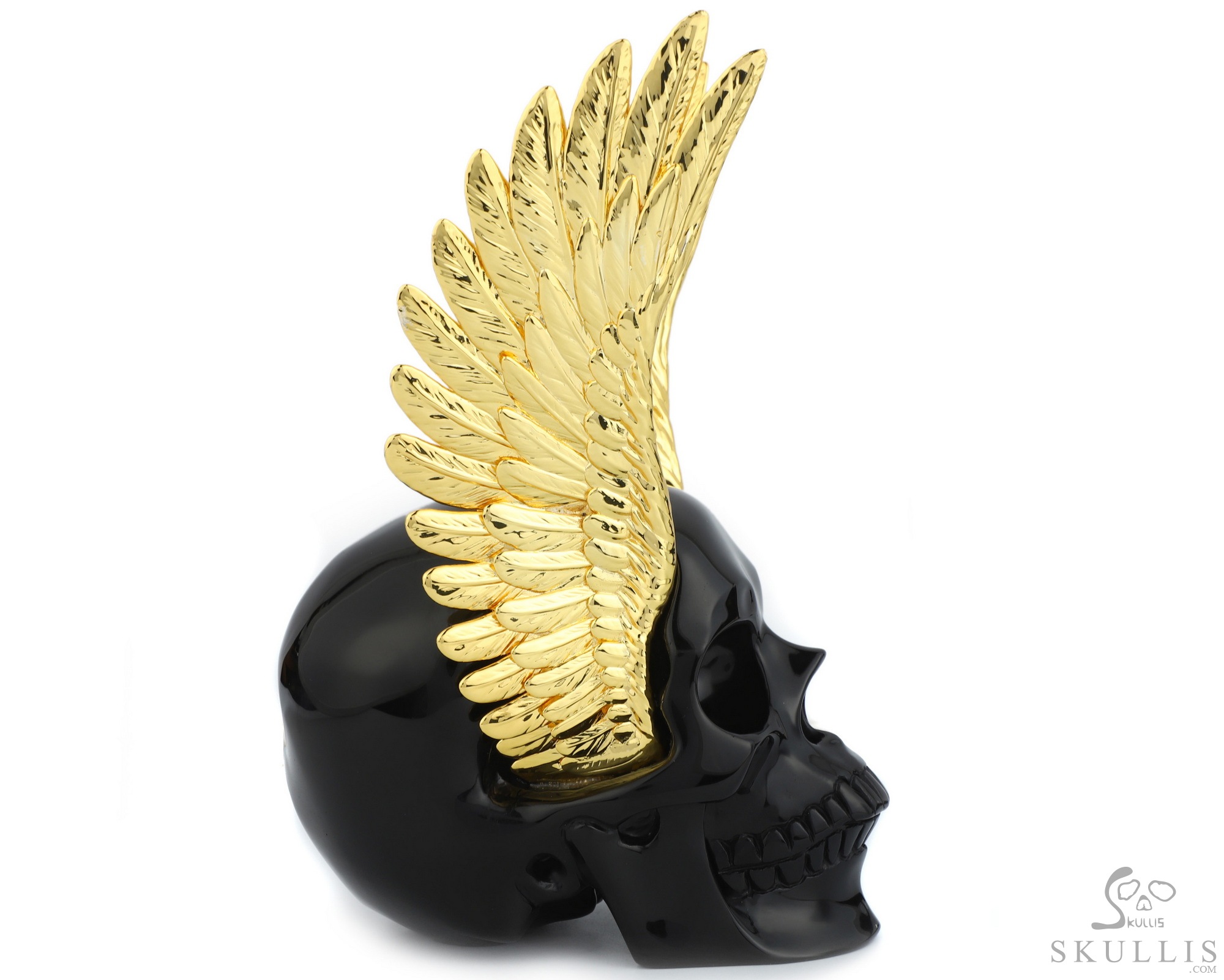 7.3" Black Obsidian Hand Carved Crystal Skull and 18K Gold Plated Cooper Wings Sculpture, Crystal Healing