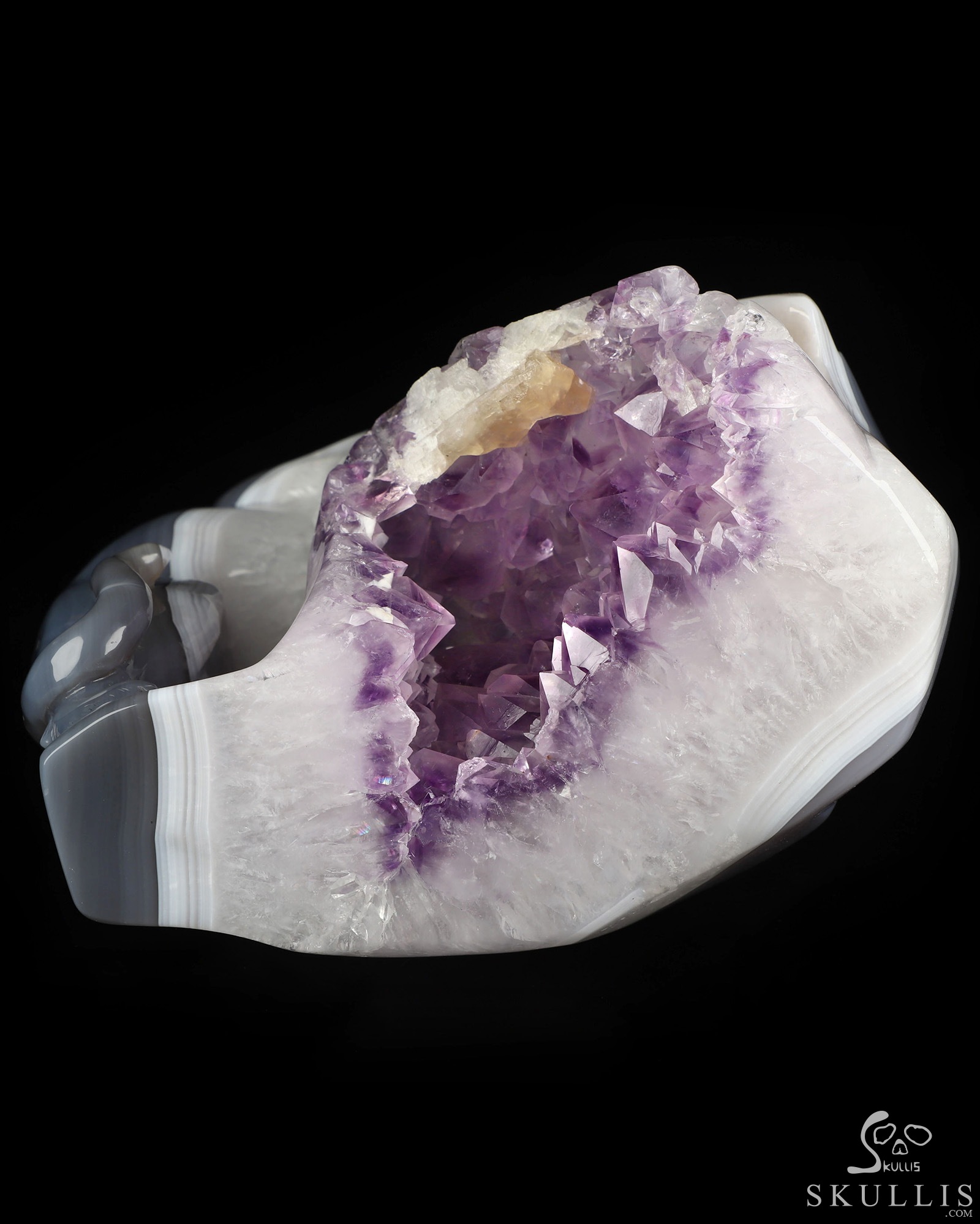 Lifesized 7.5" Agate Amethyst Geode Hand Carved Crystal Skull, Super Realistic, Crystal Healing