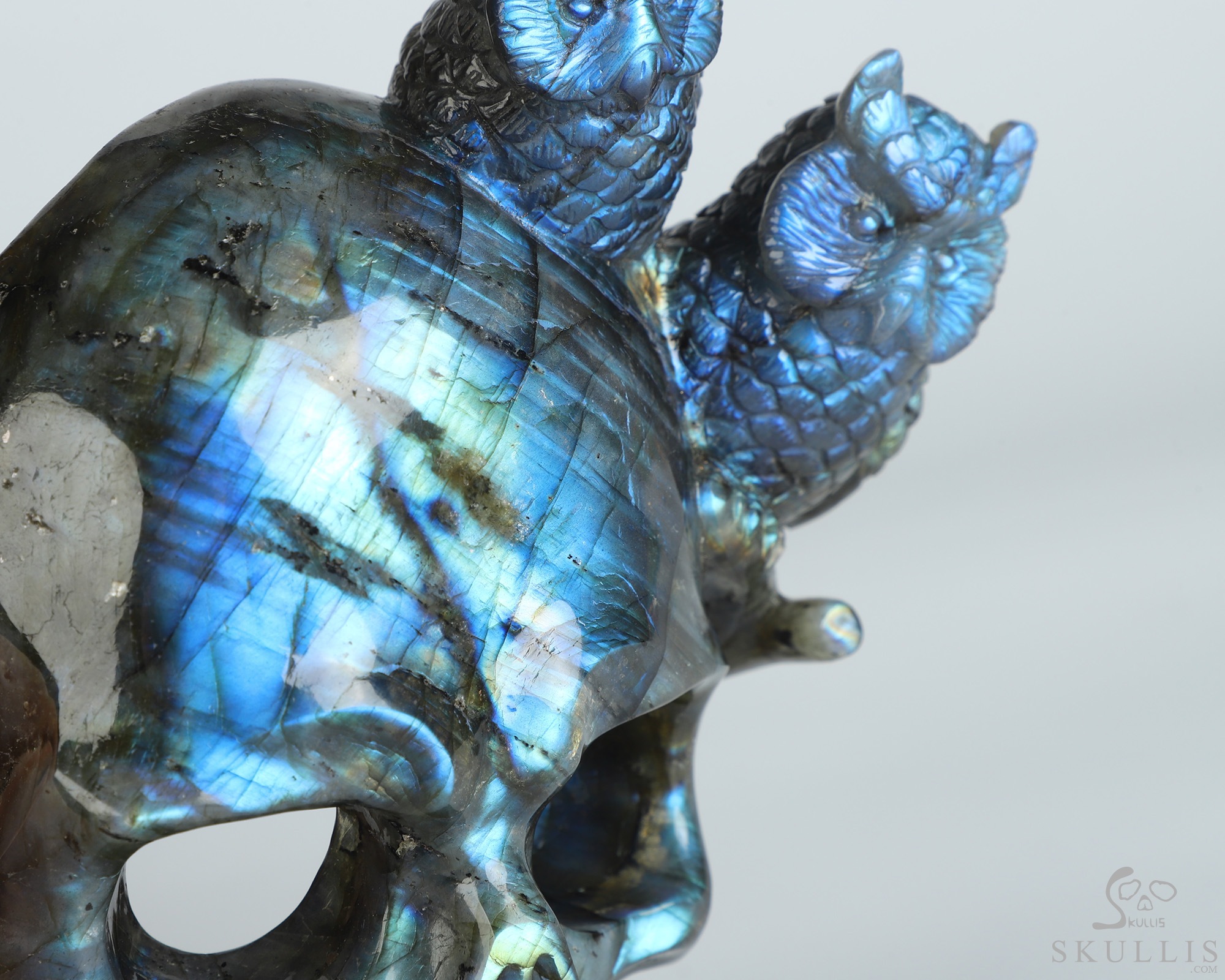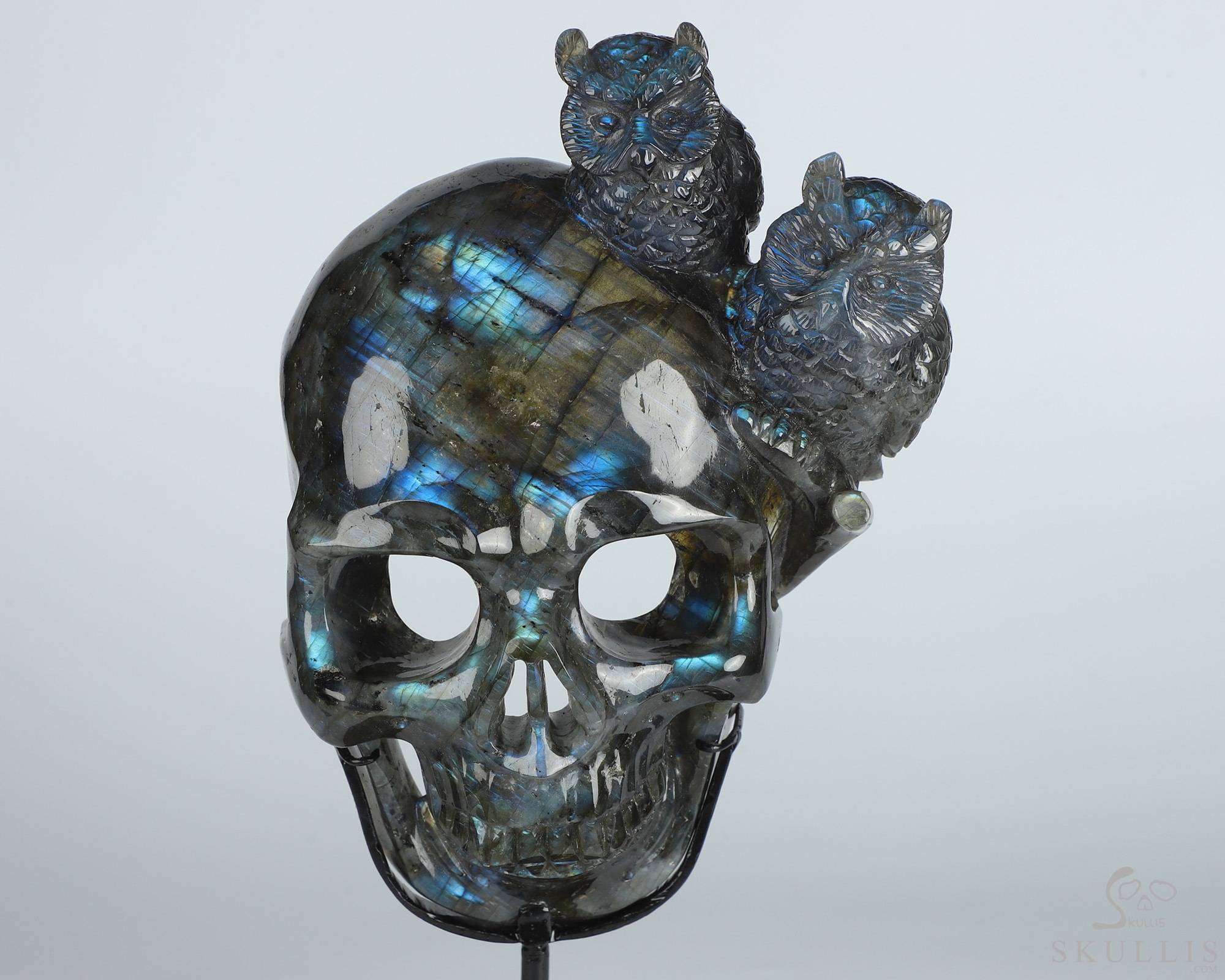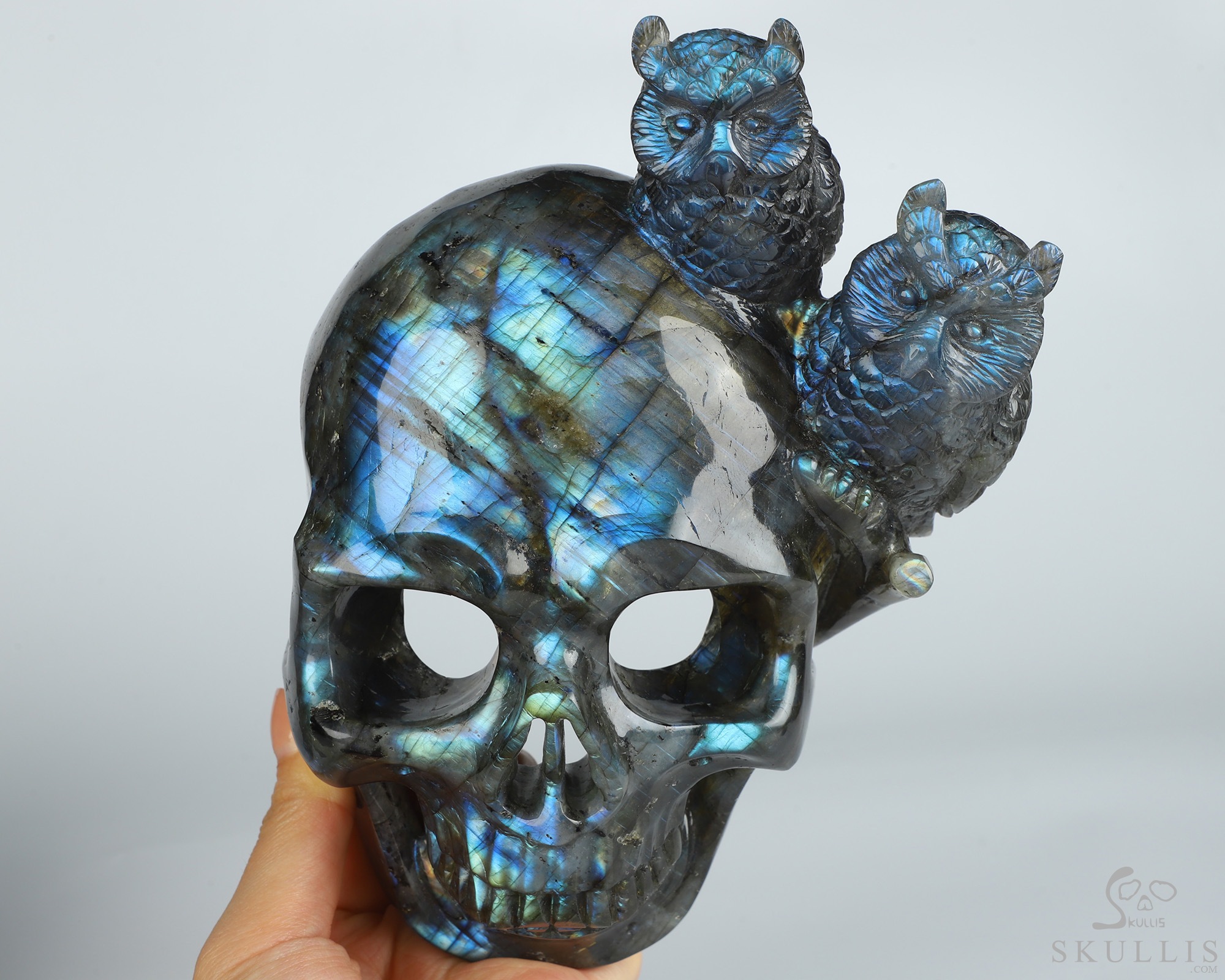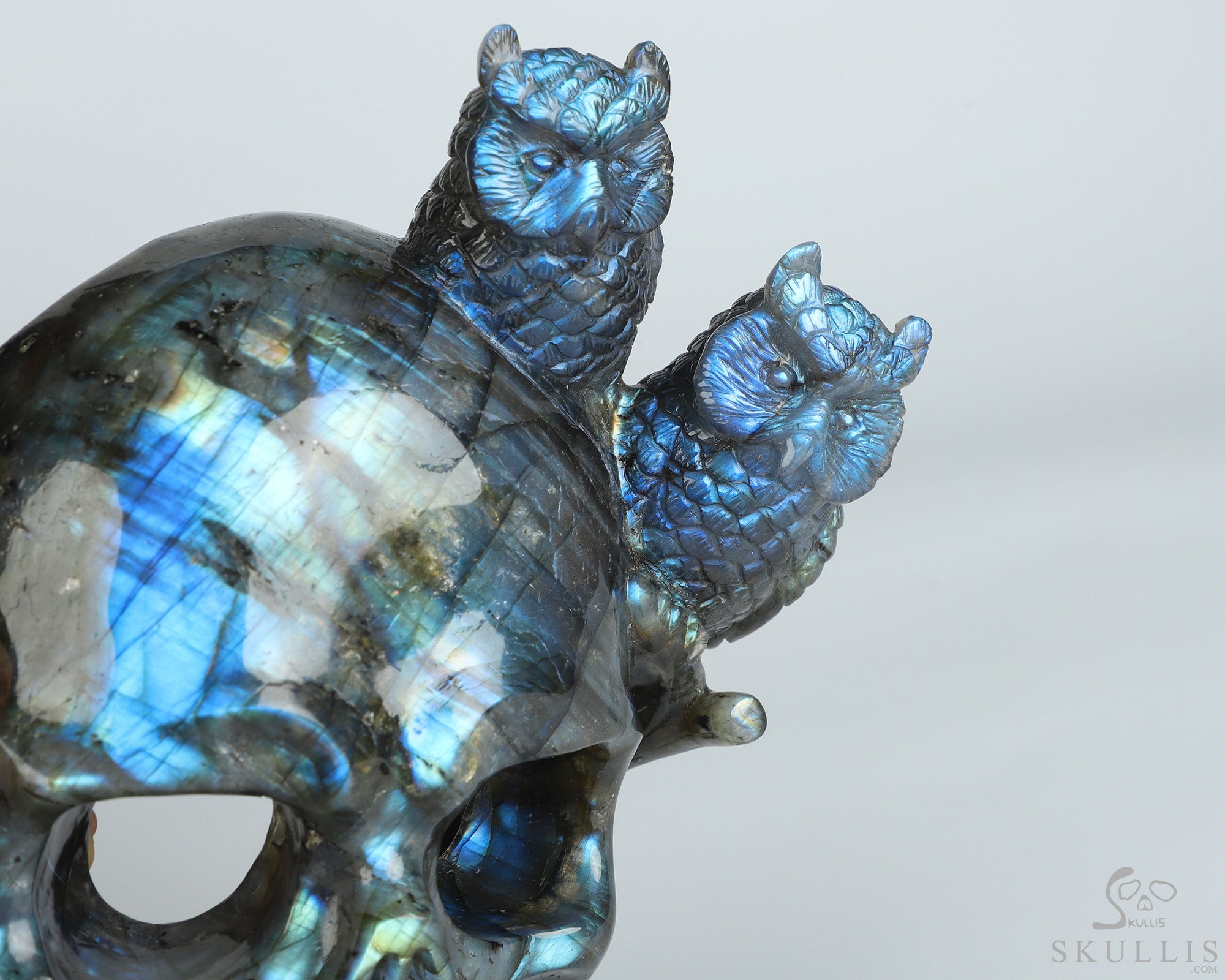 7.7" Labradorite Hand Carved Crystal Skull and Owls Sculpture, Crystal Healing