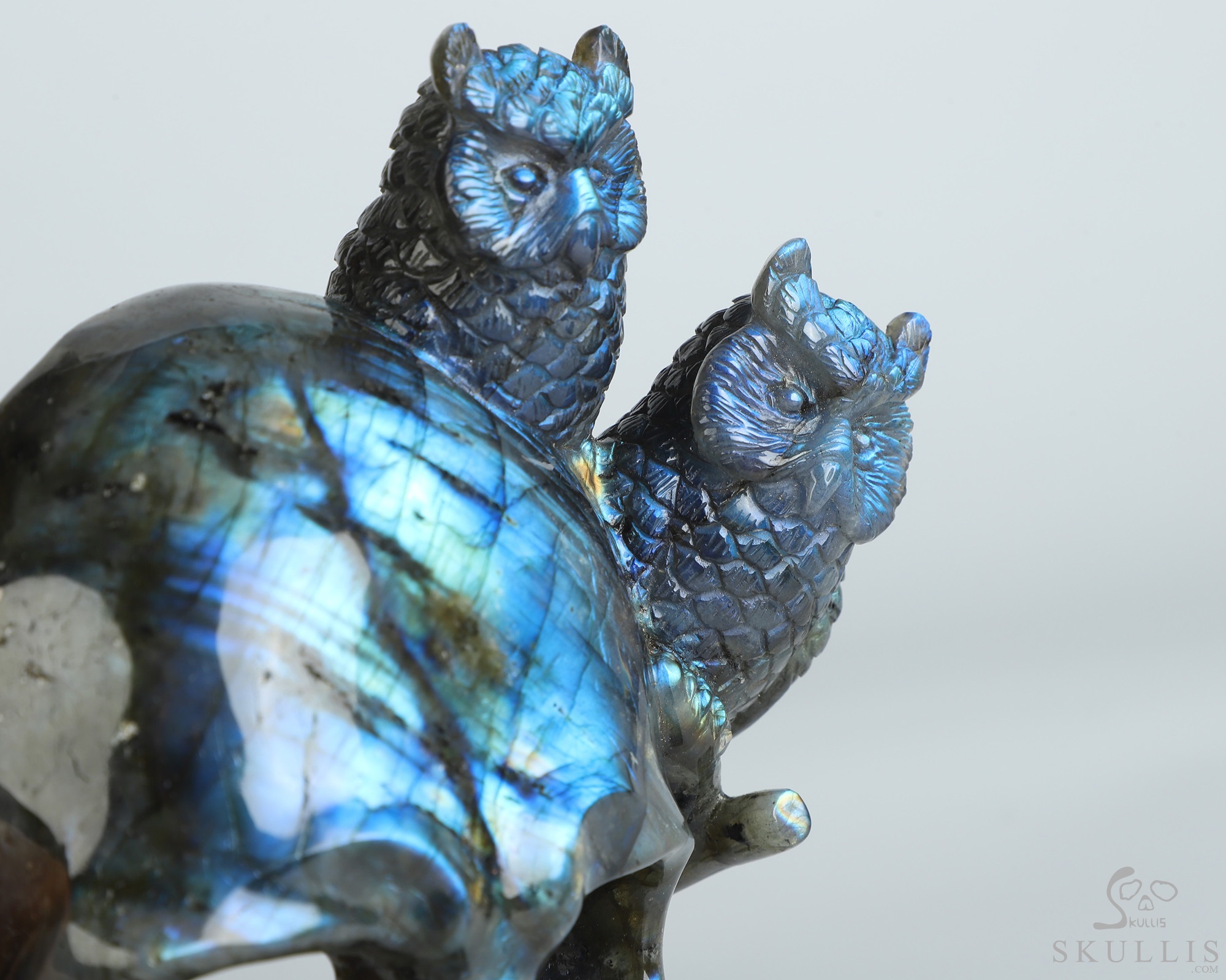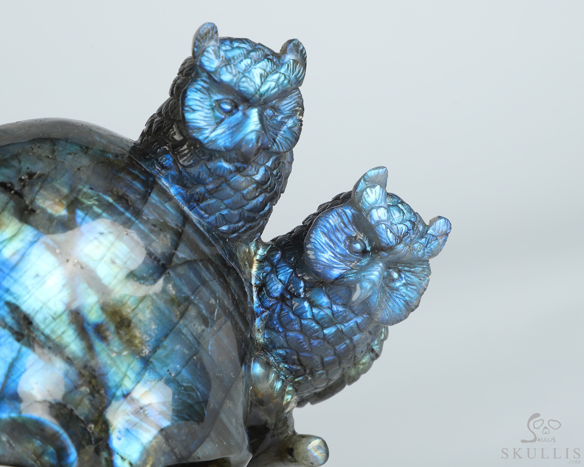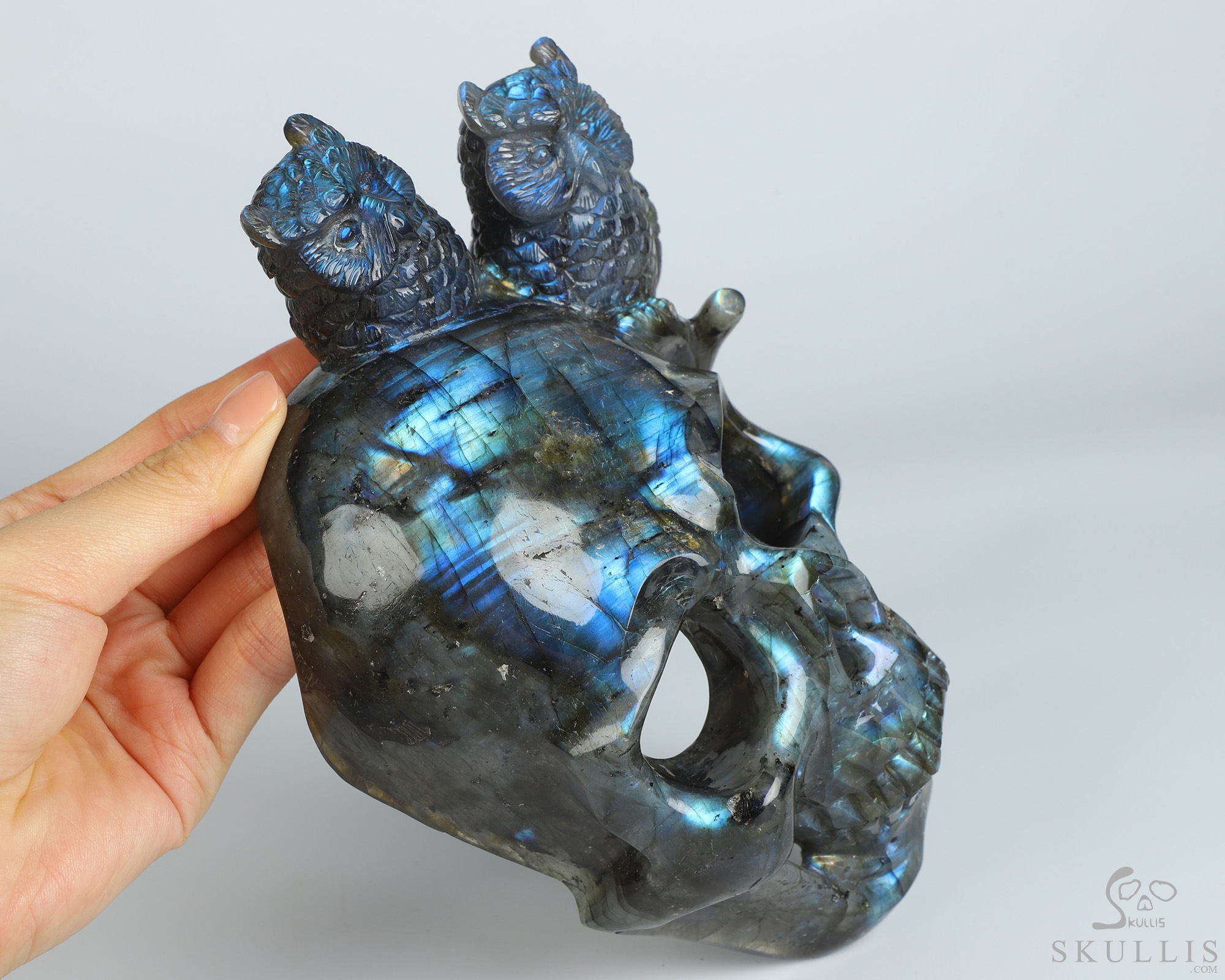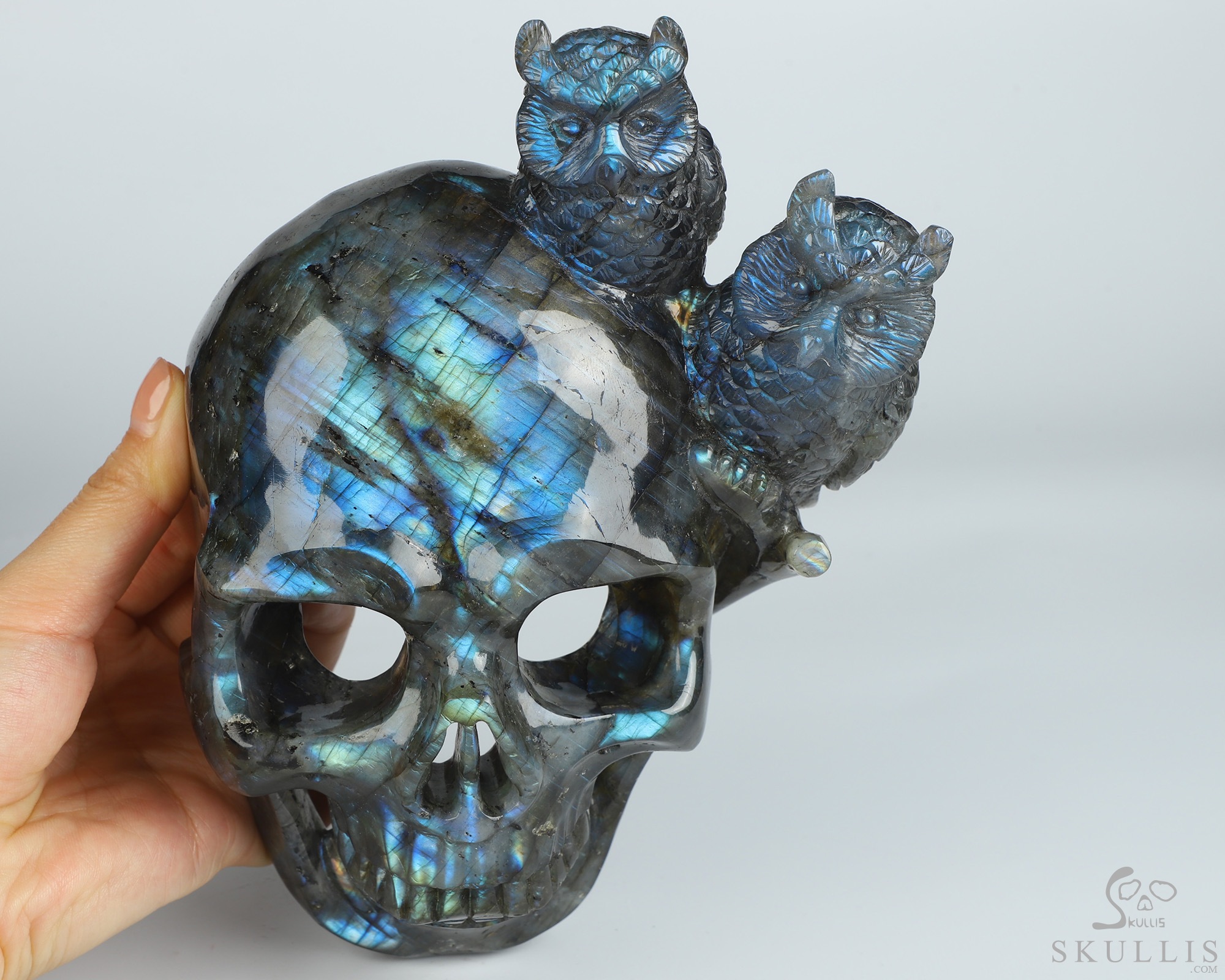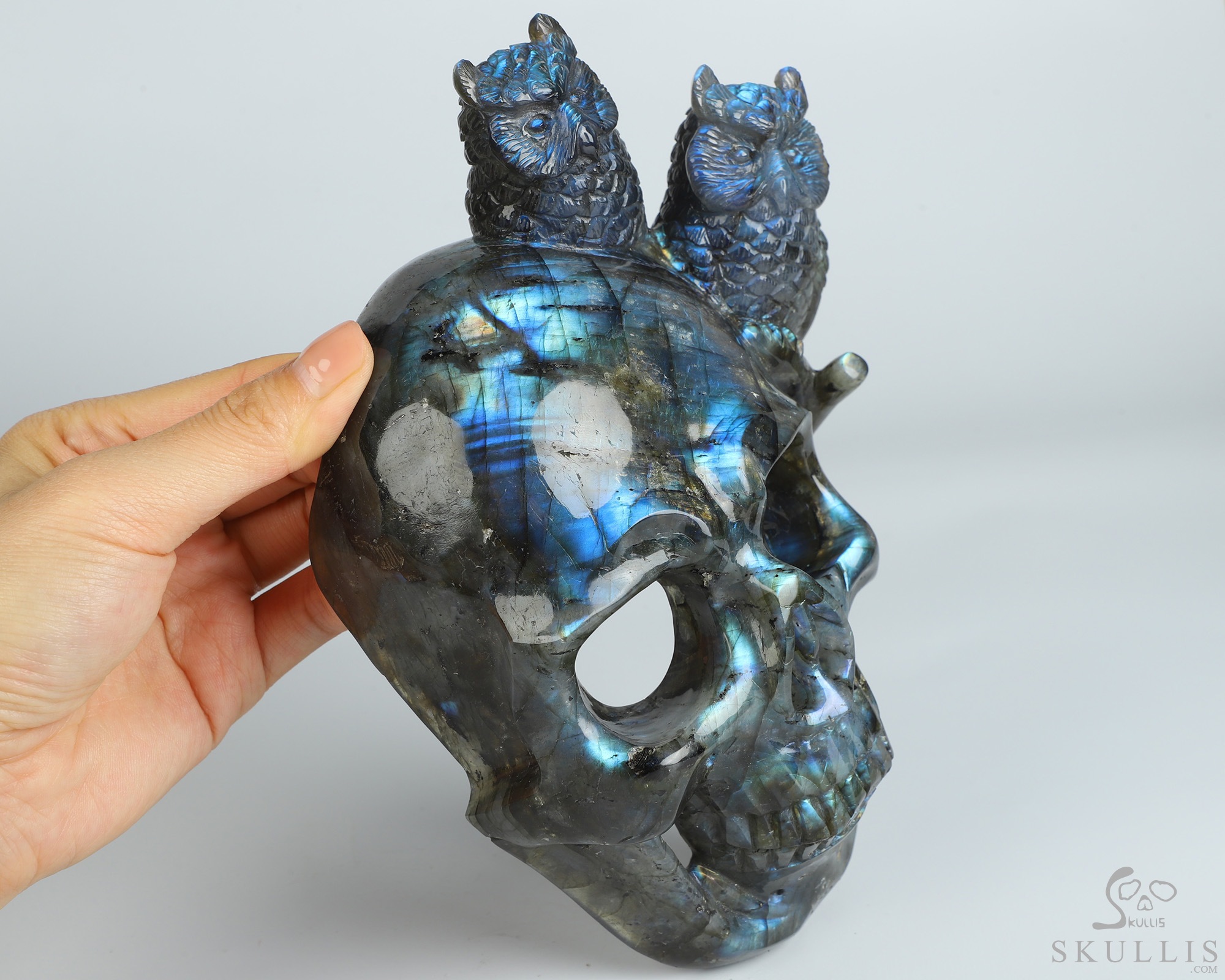 7.7" Labradorite Hand Carved Crystal Skull and Owls Sculpture, Crystal Healing