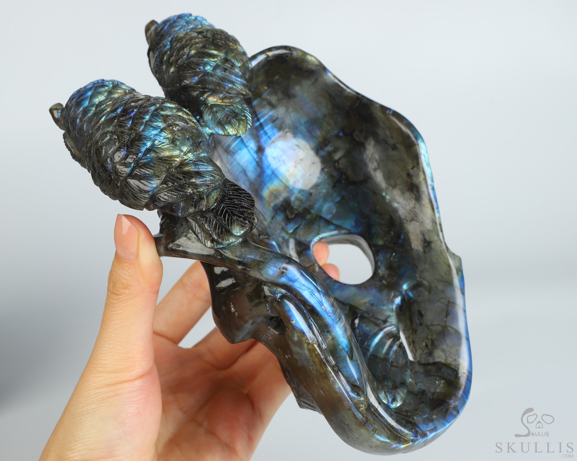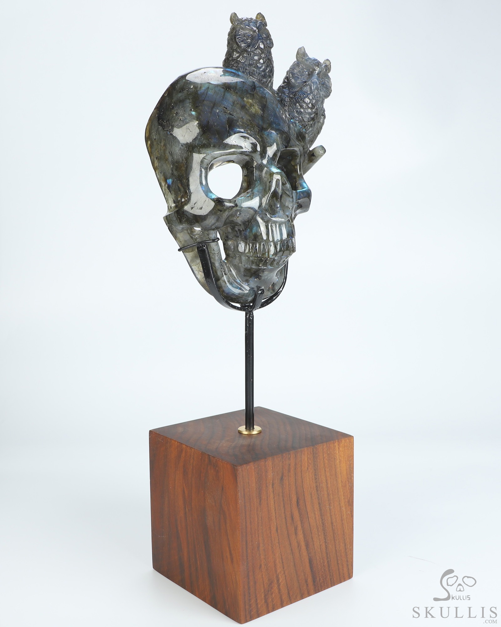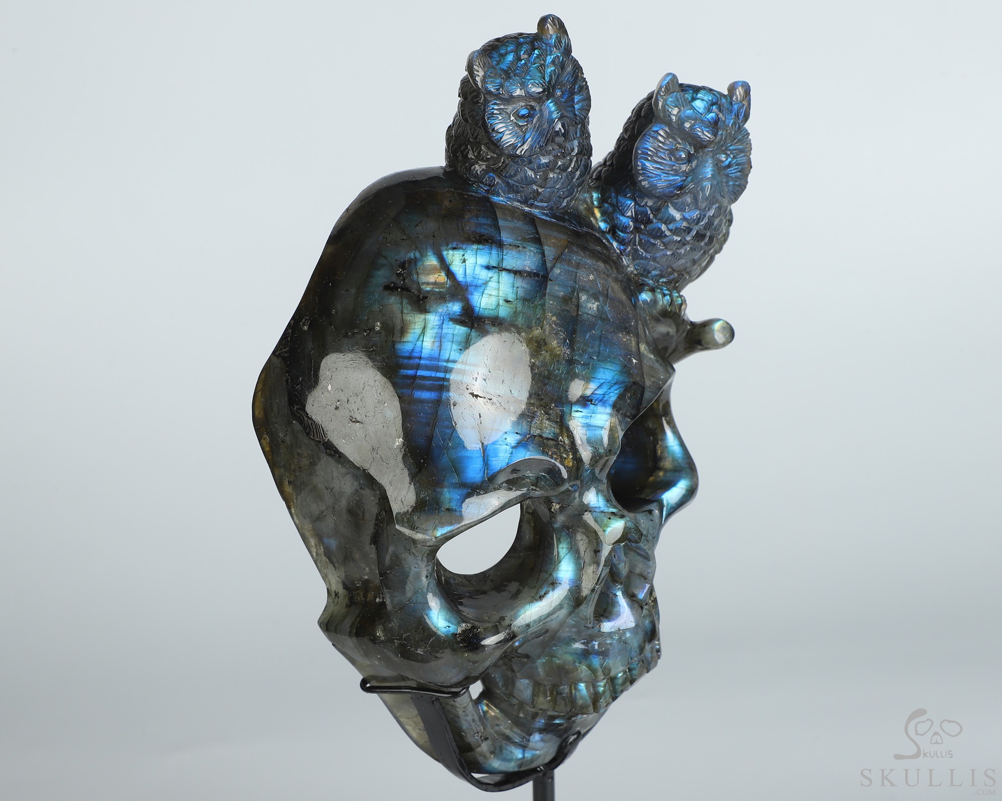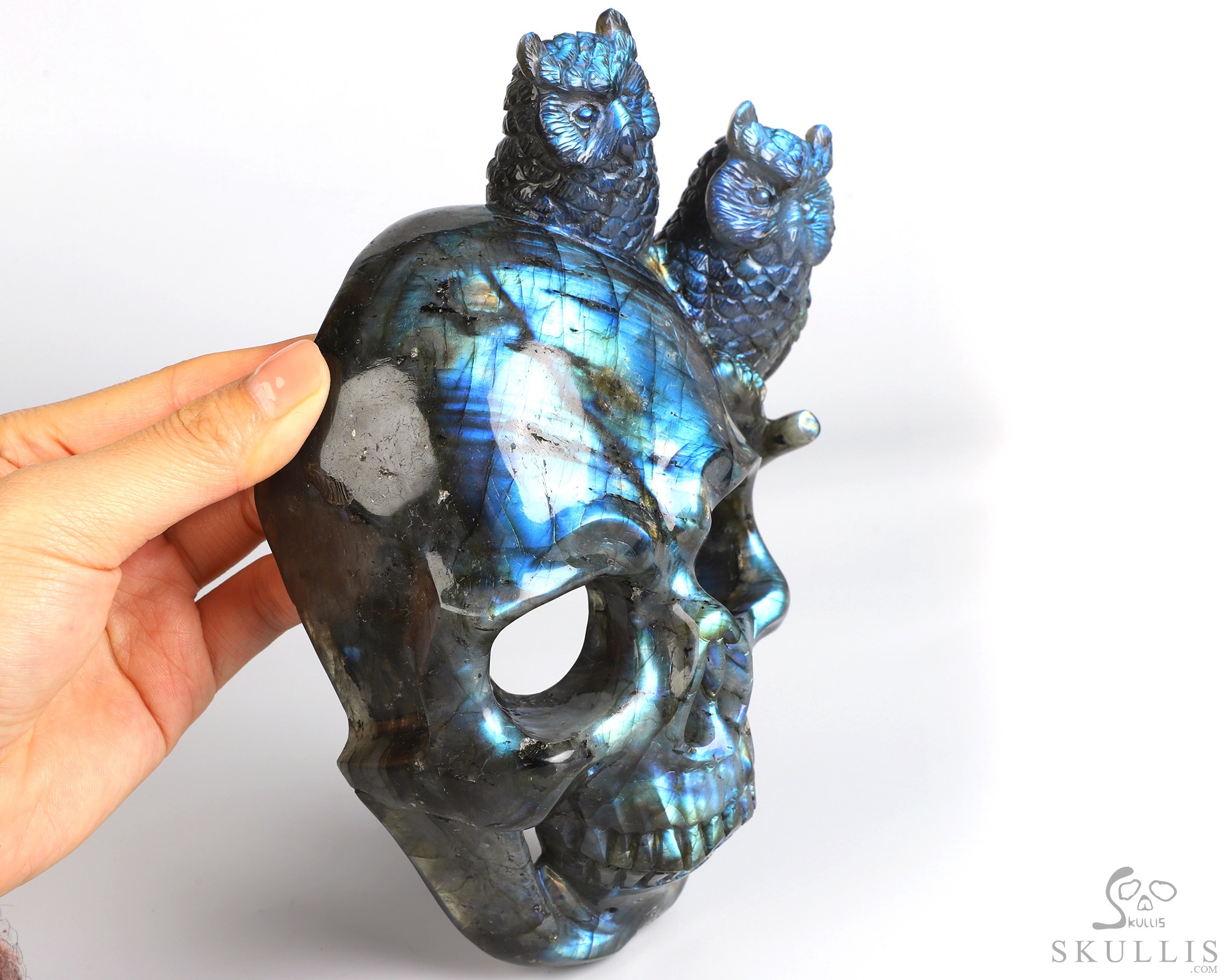 7.7" Labradorite Hand Carved Crystal Skull and Owls Sculpture, Crystal Healing