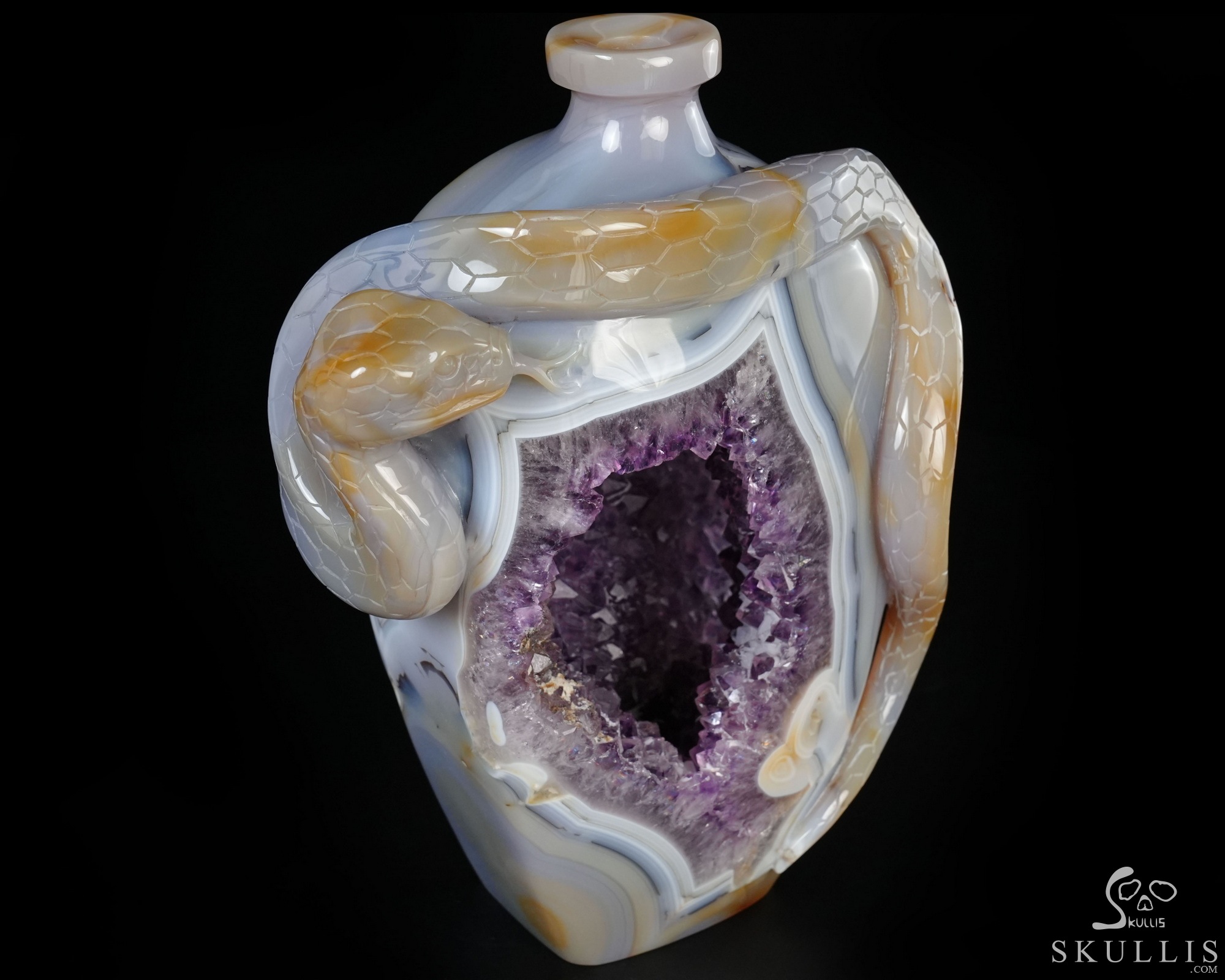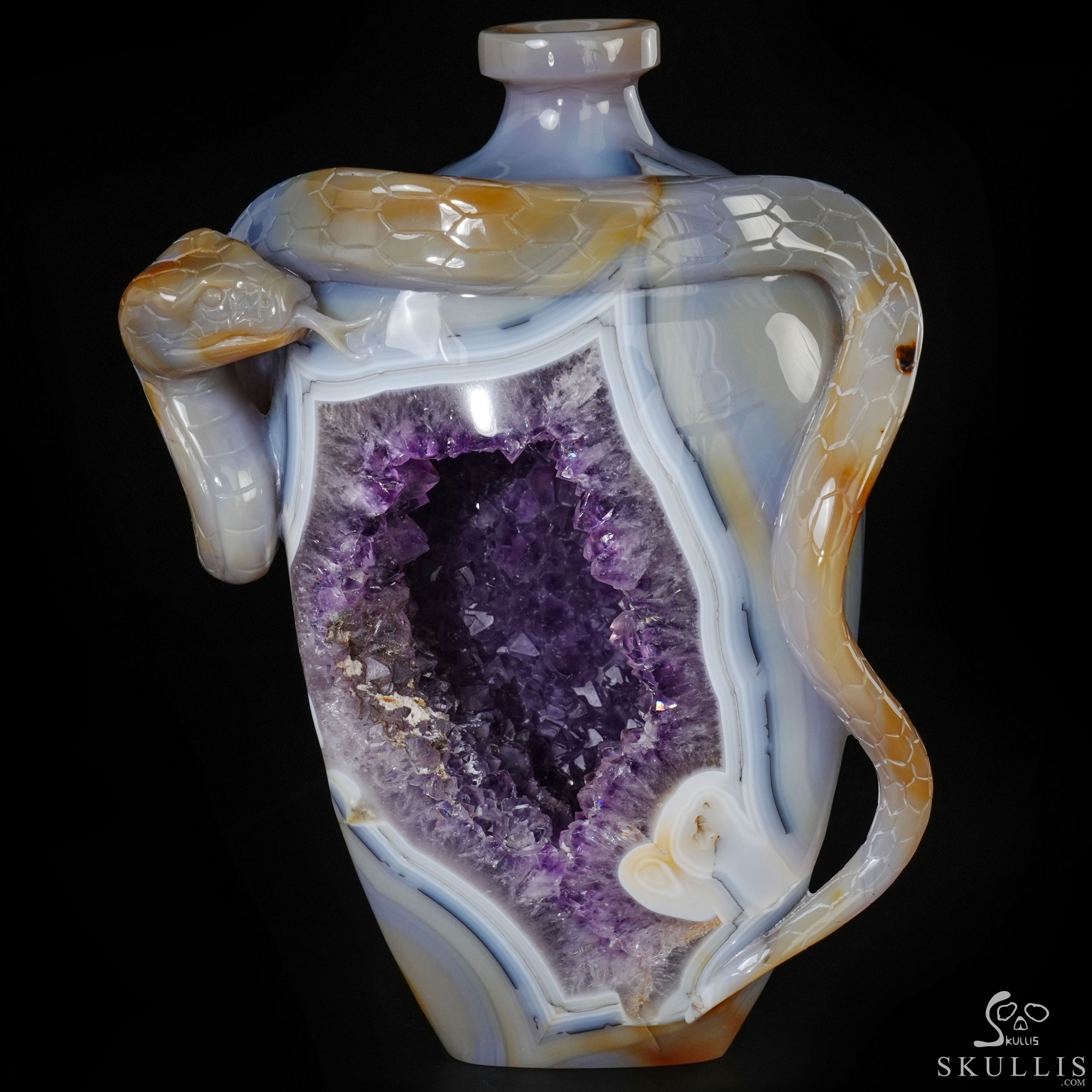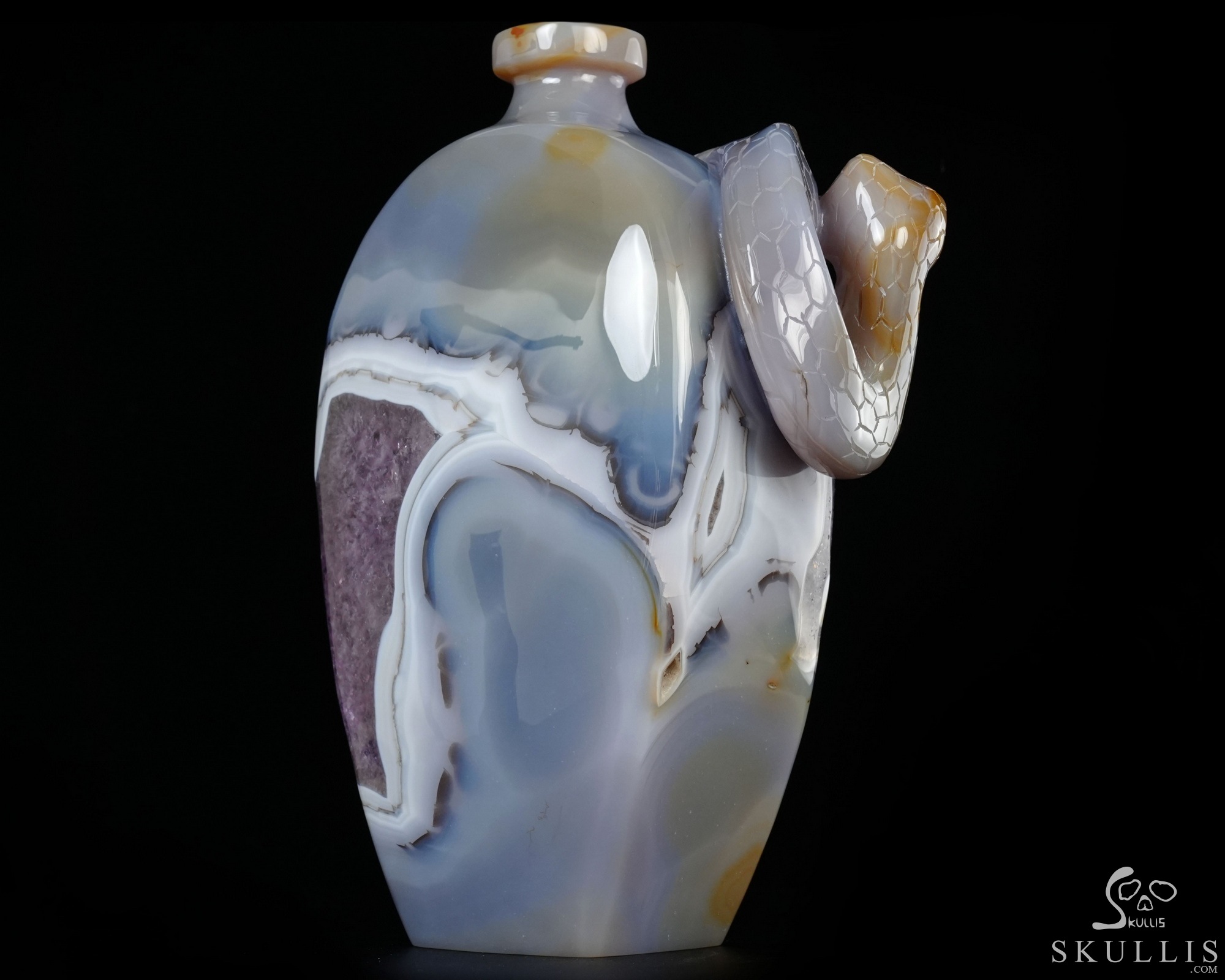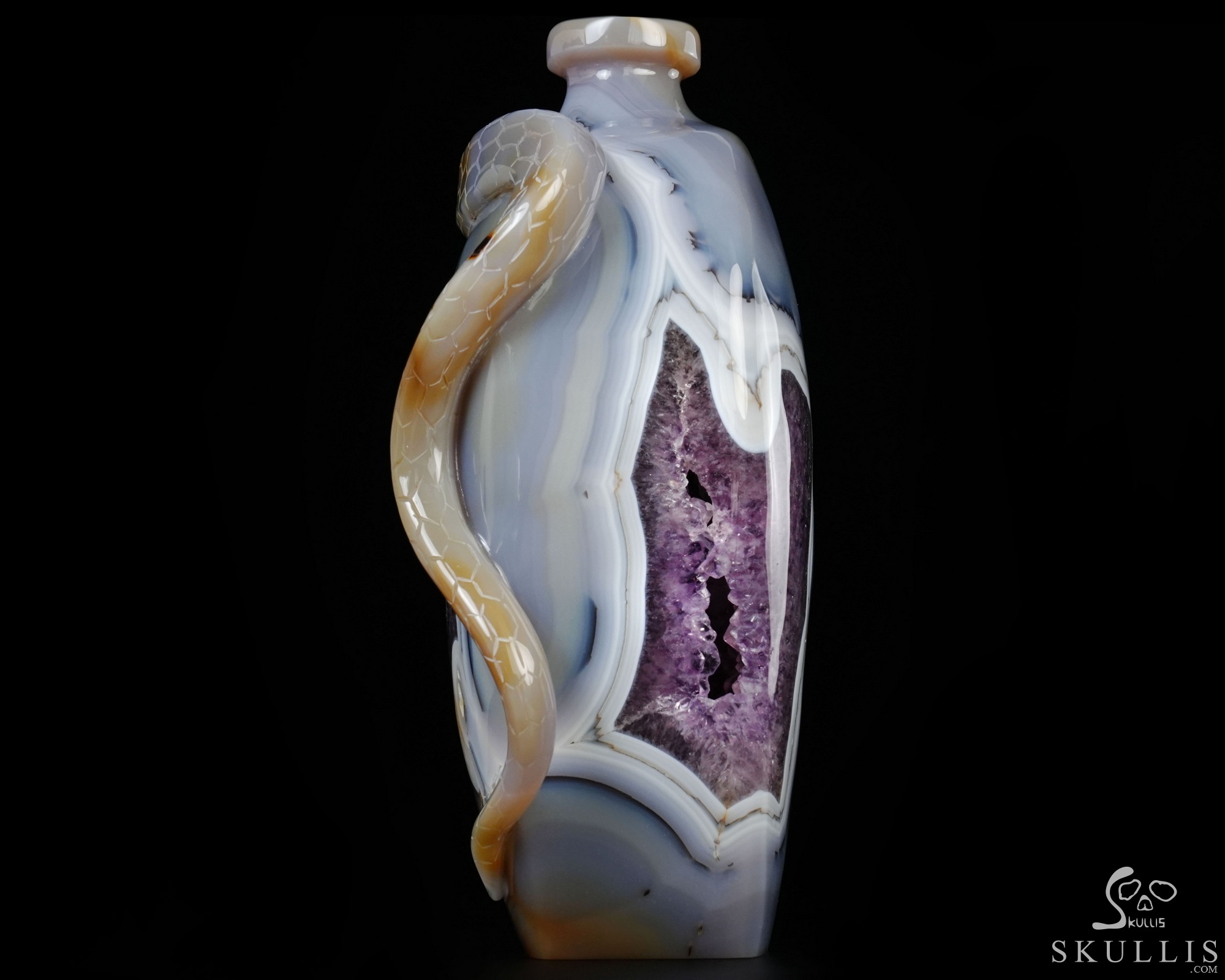 8.1" Agate Amethyst Geode Hand Carved Crystal Vase and Snake Sculpture, Crystal Healing