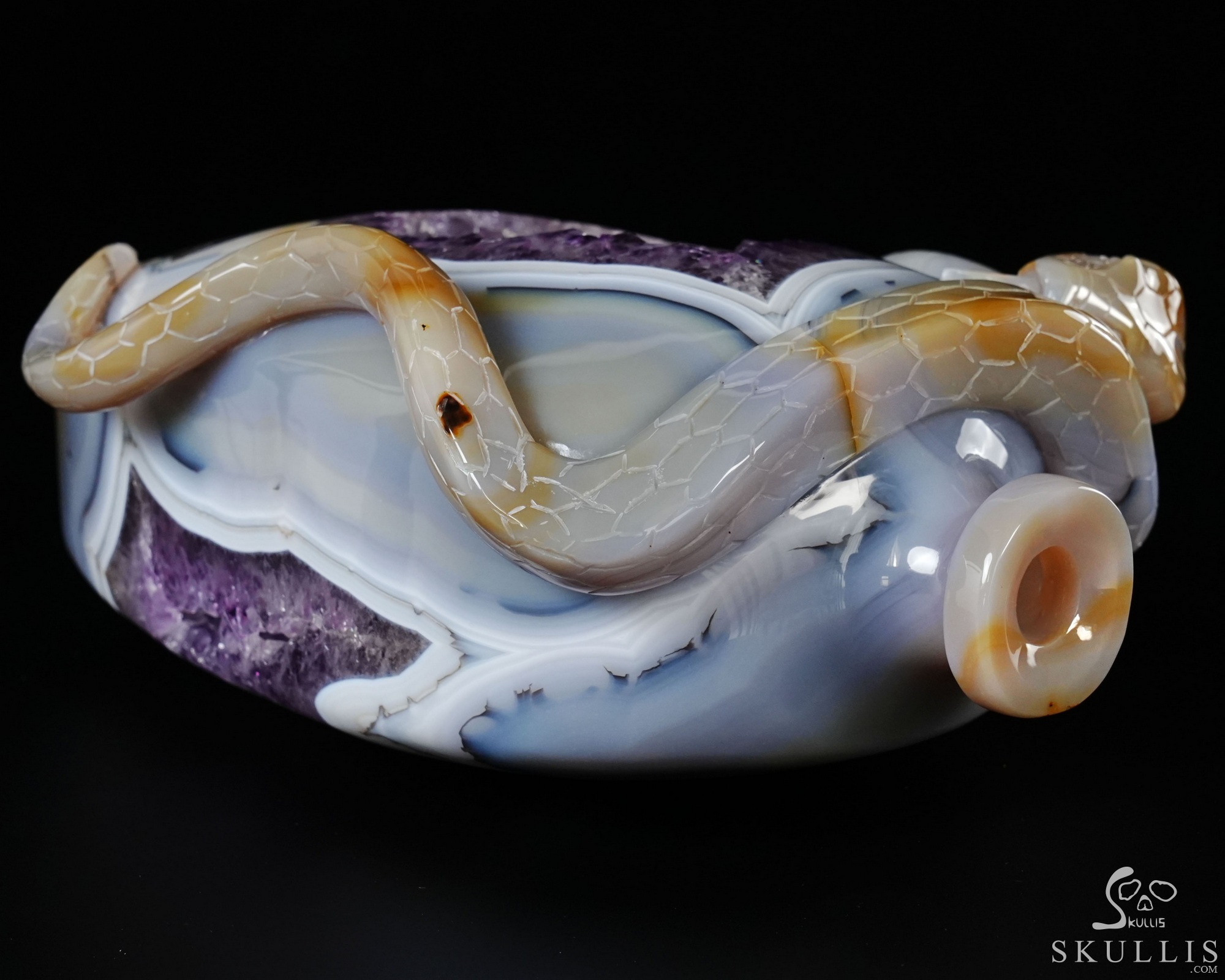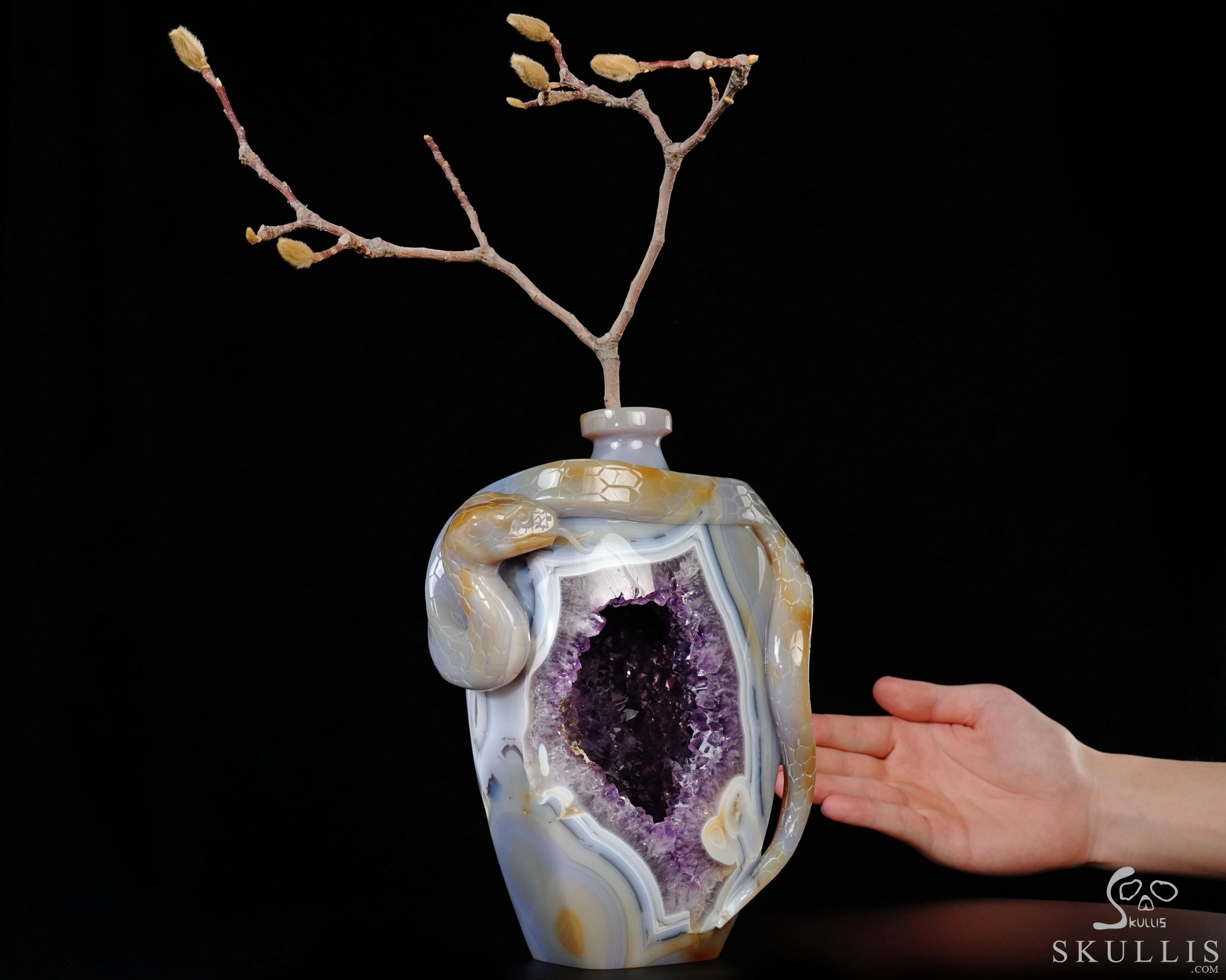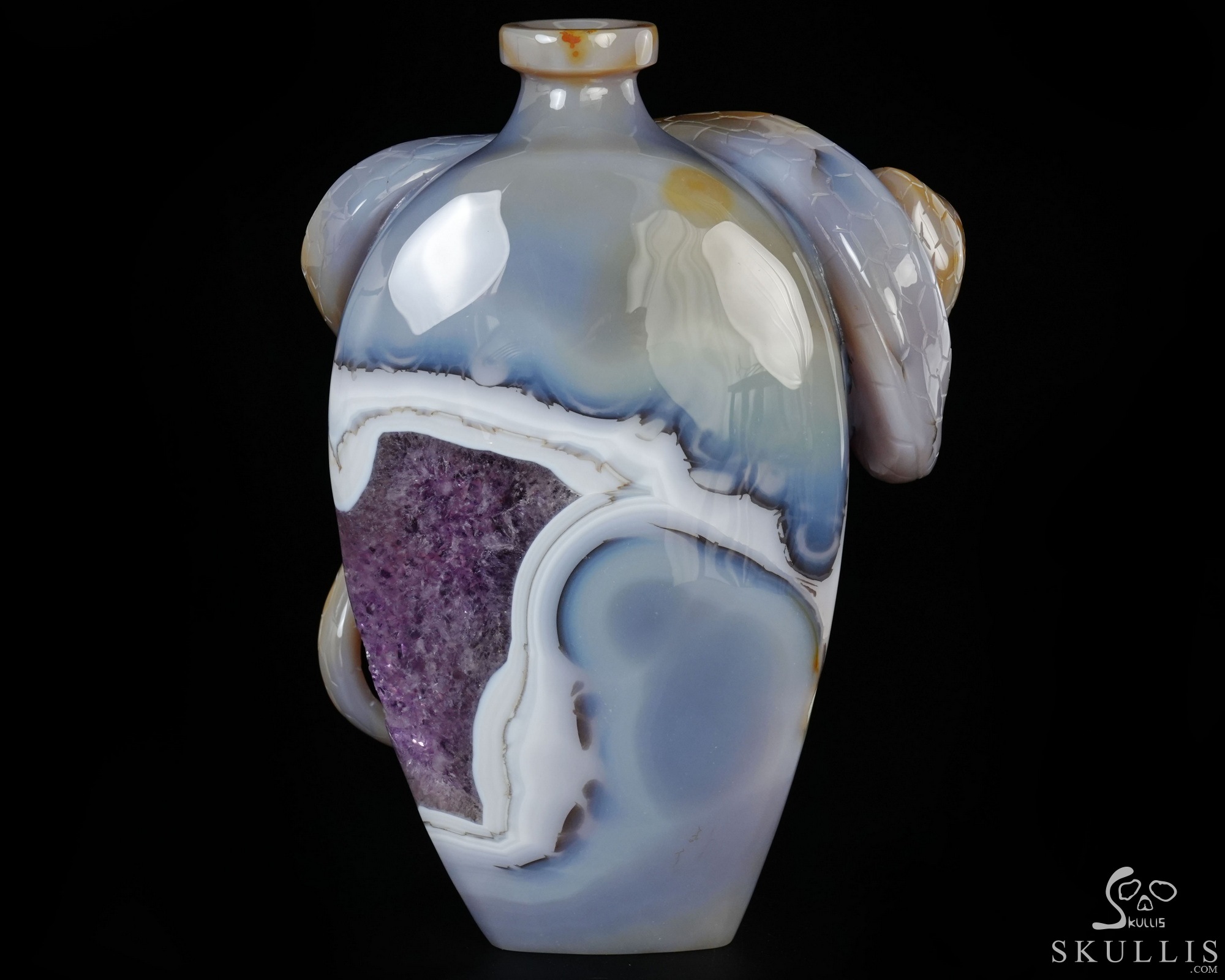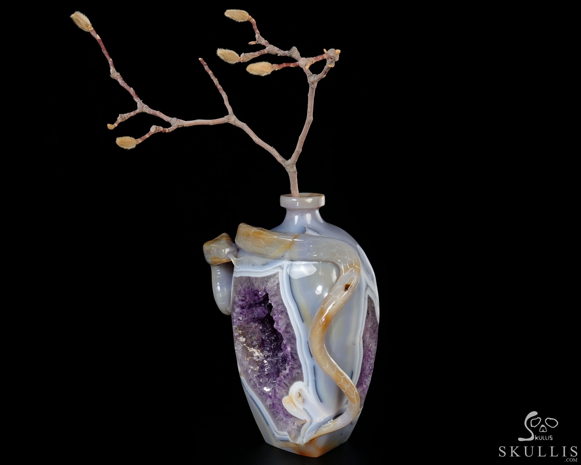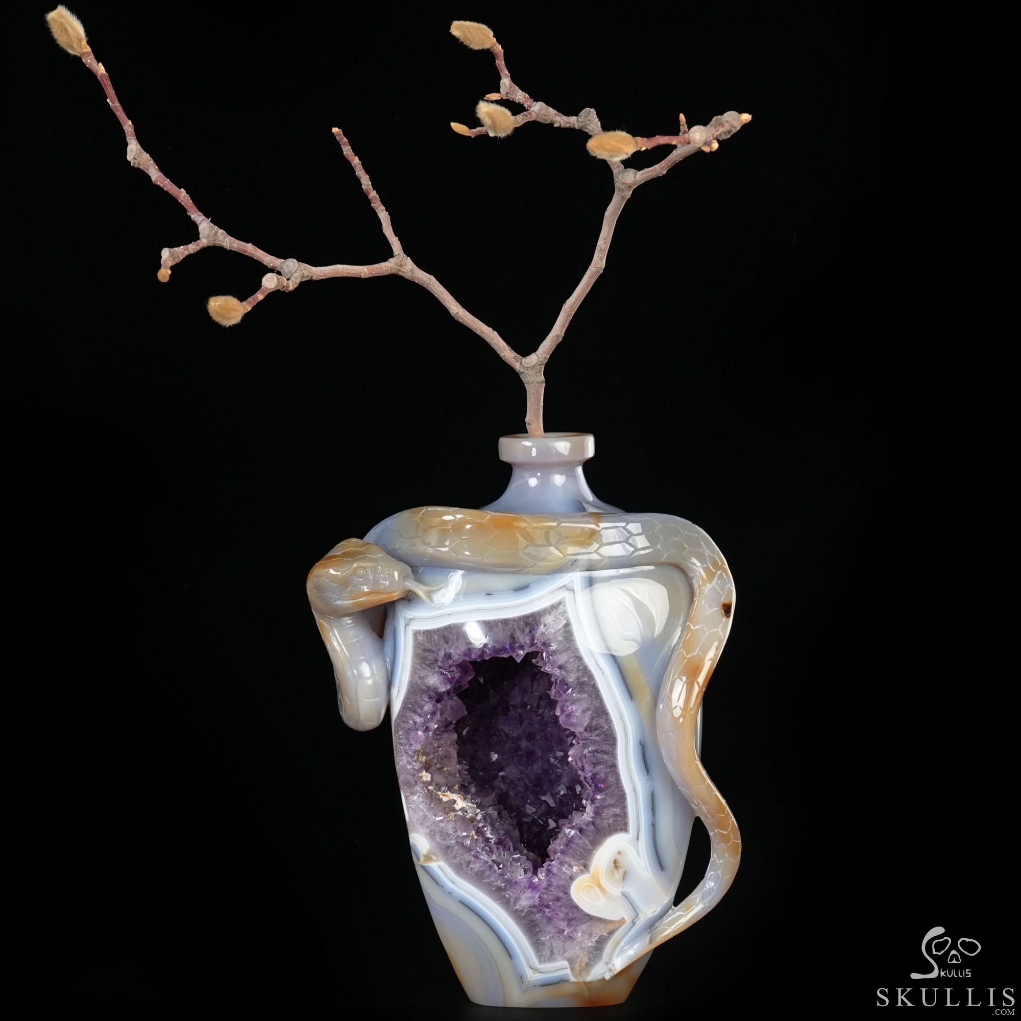 8.1" Agate Amethyst Geode Hand Carved Crystal Vase and Snake Sculpture, Crystal Healing