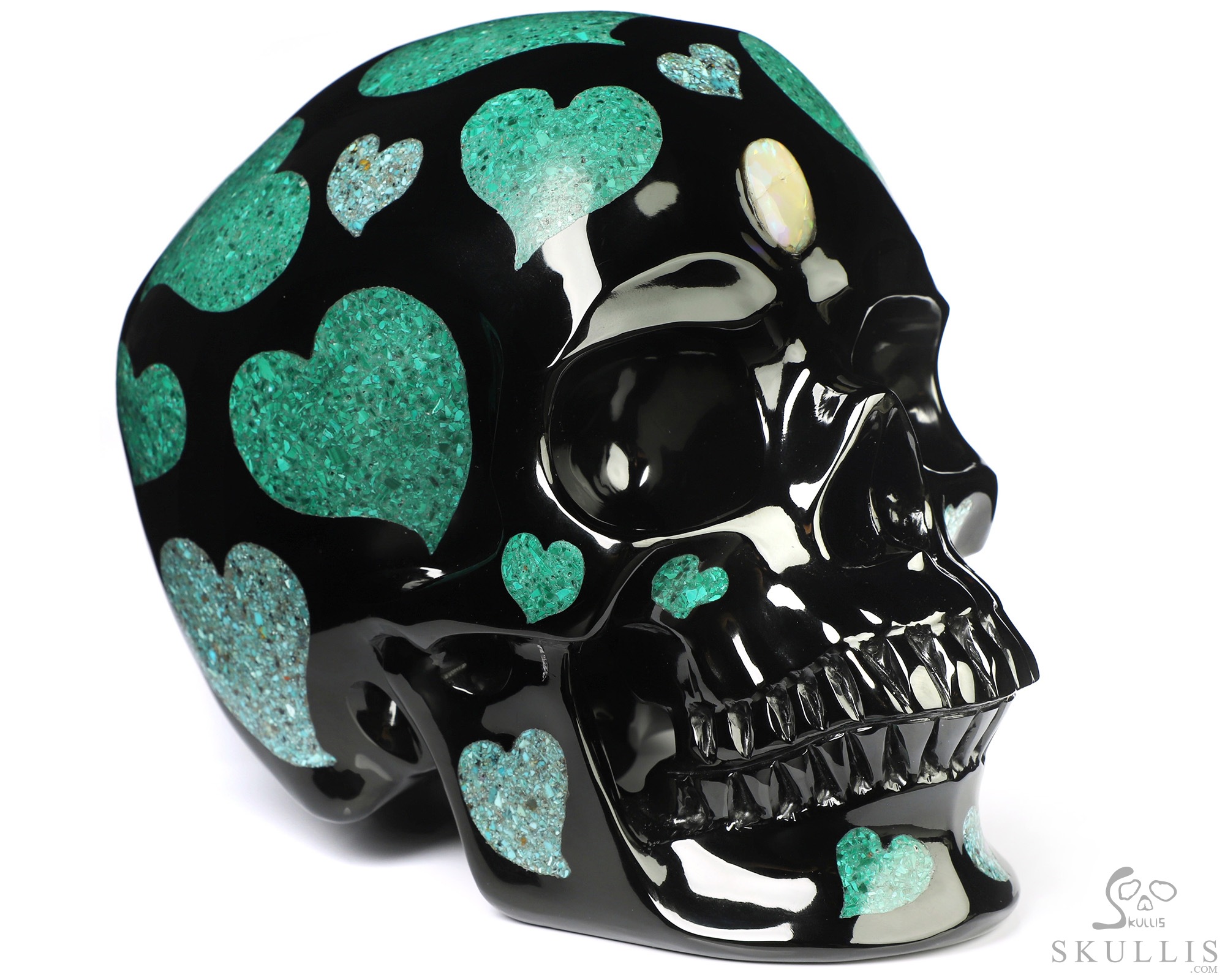 8.2" Black Obsidian with Malachite and Turquoise Inlay Hand Carved Crystal Skull, Crystal Healing