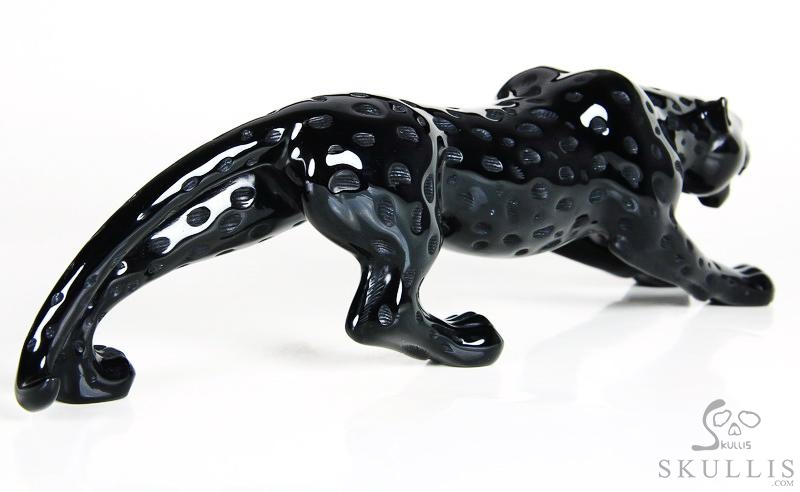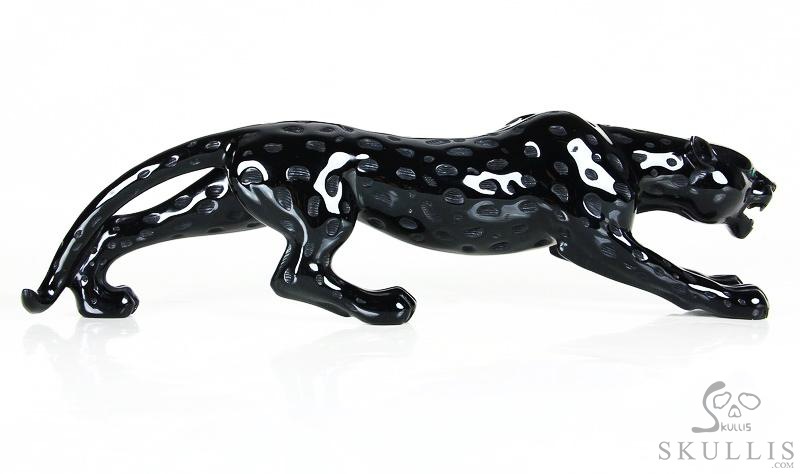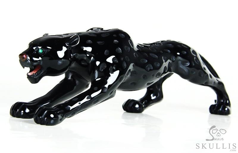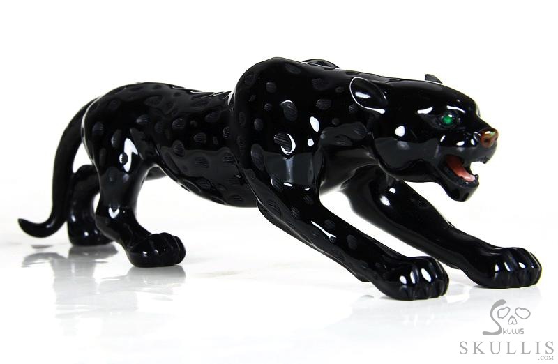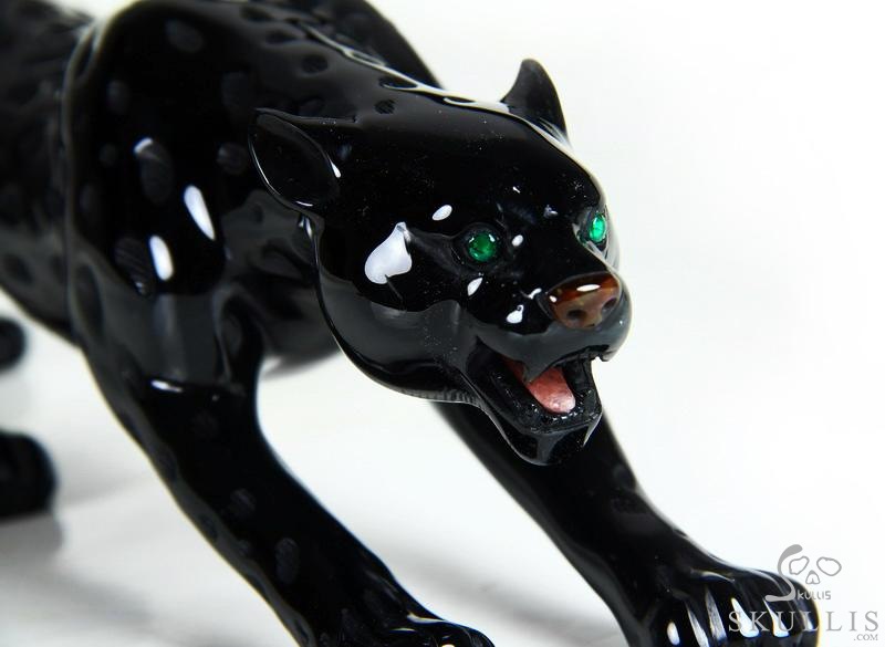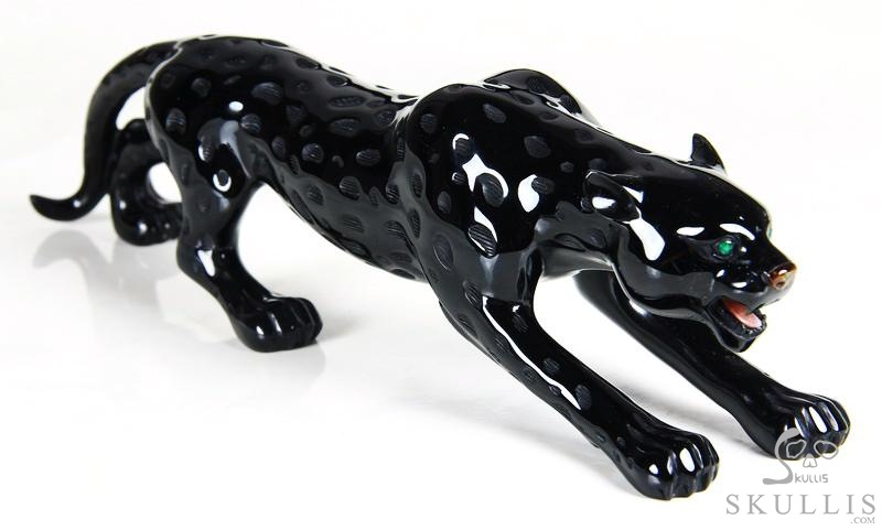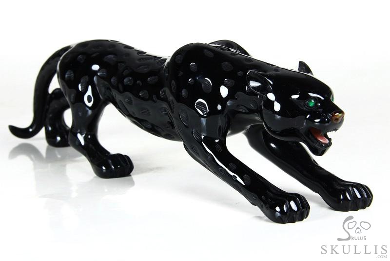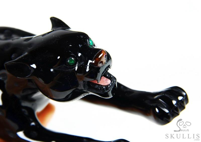 AMAZING 11.3" Black Obsidian Carved Carved Crystal Leopard Sculpture with Emerald, Fire Agate & Rhodochrosite