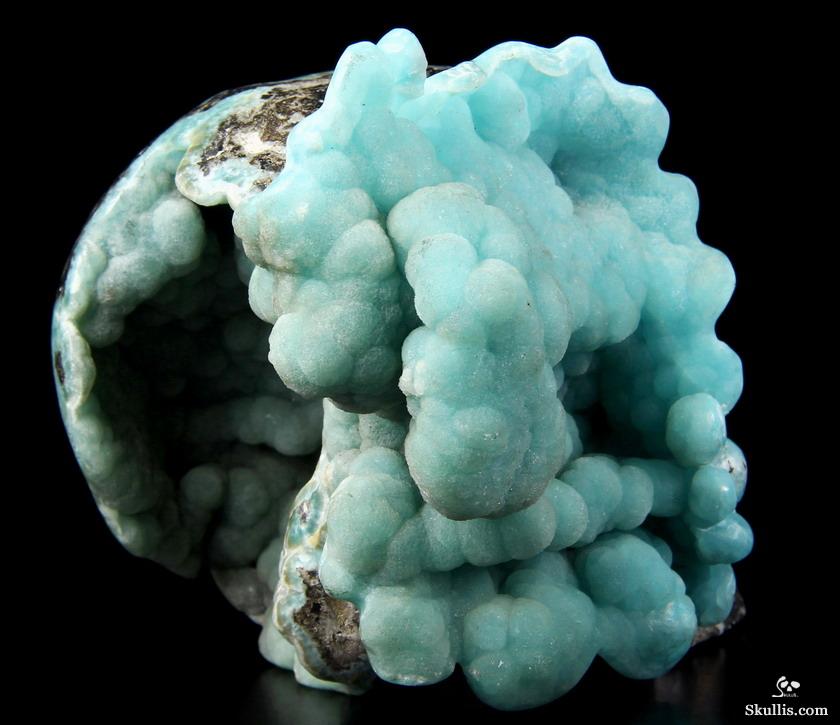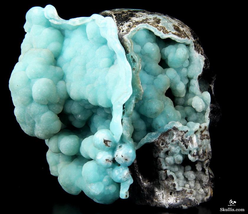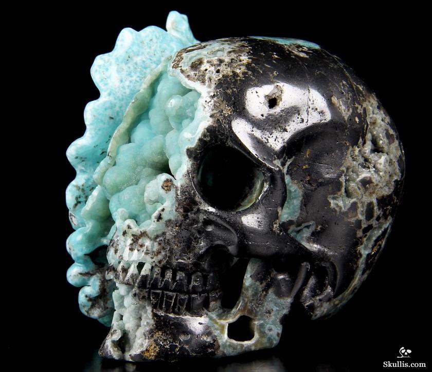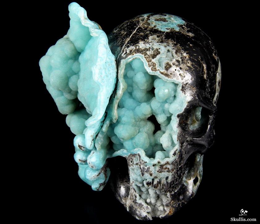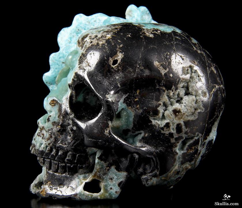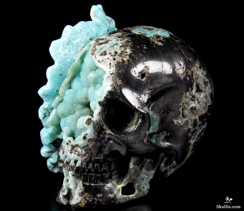 A remarkable blue aragonite geode specimen with entrancing aqua blue crystal formations inside! We knew we had to carve this when we saw it! The exquisite color and fascinating crystalline growth habit of this choice blue aragonite geode are now properly framed within a stunning crystal skull!