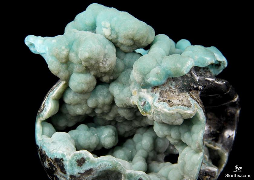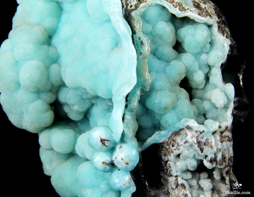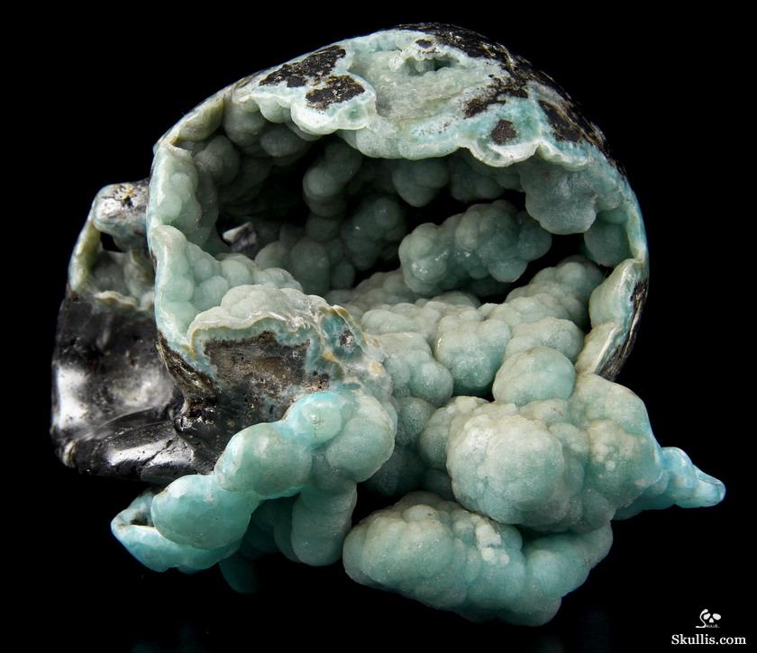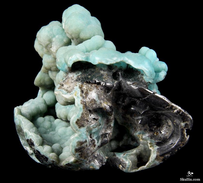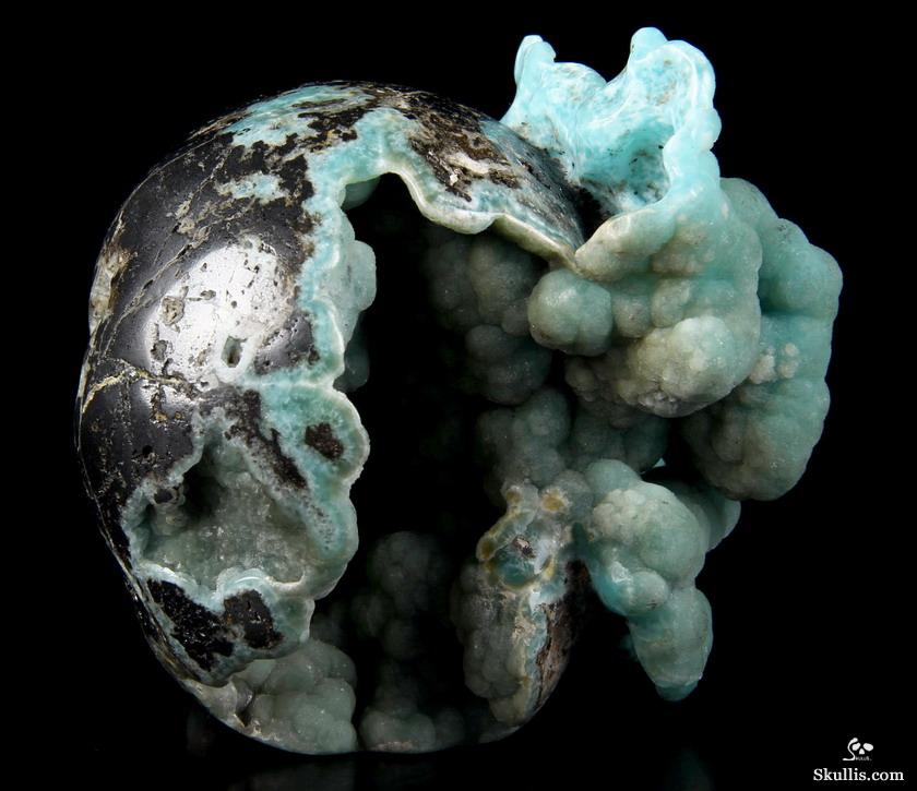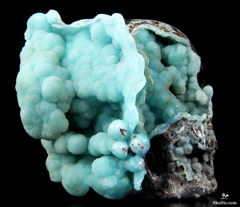 A remarkable blue aragonite geode specimen with entrancing aqua blue crystal formations inside! We knew we had to carve this when we saw it! The exquisite color and fascinating crystalline growth habit of this choice blue aragonite geode are now properly framed within a stunning crystal skull!