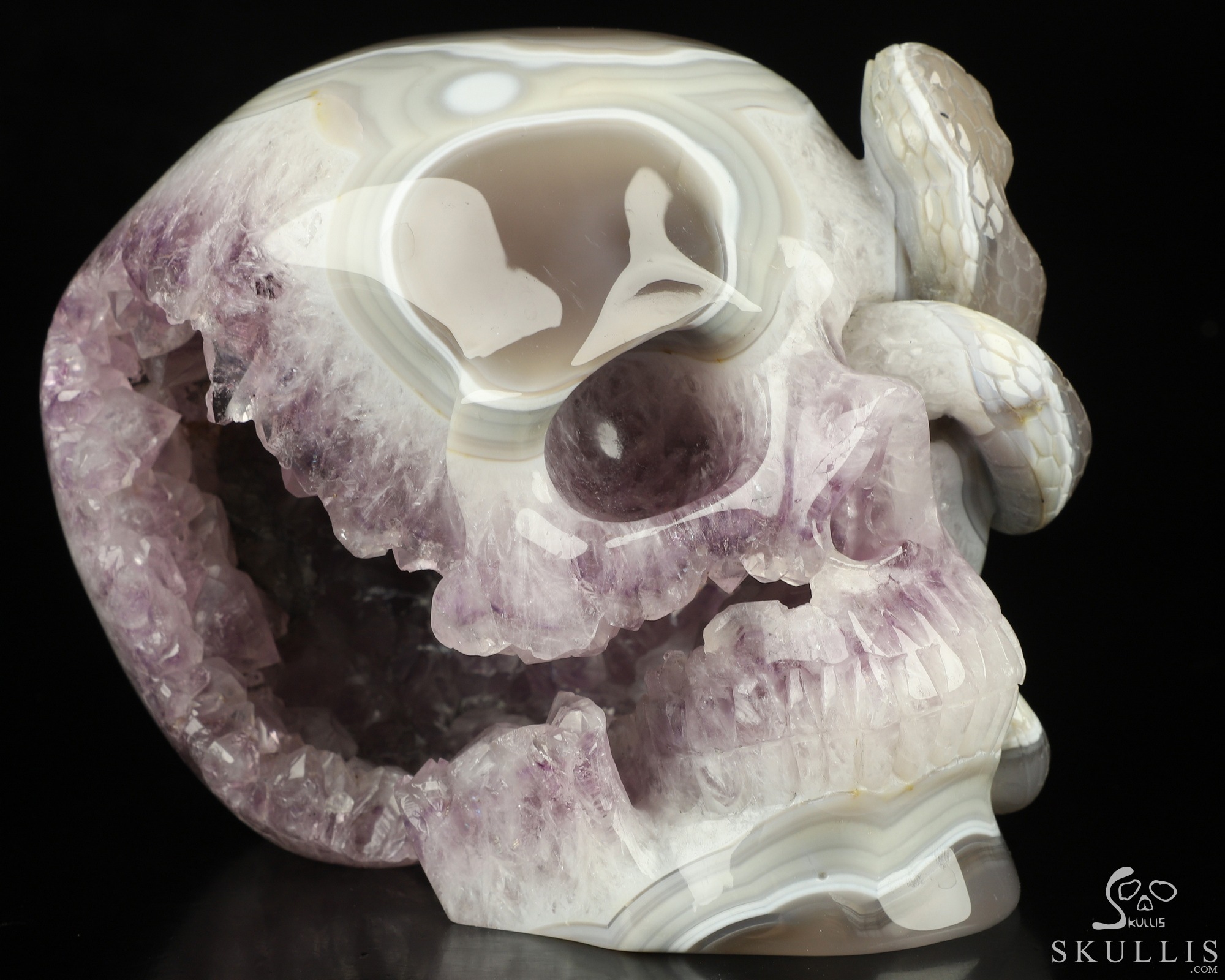 Amazing 5.7" Agate Amethyst Geode Carved Crystal Skull with Snake, Crystal Healing