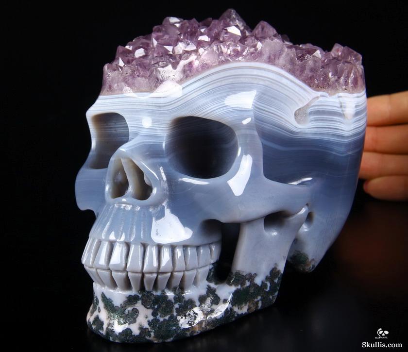 5.1" Agate Amethyst Druse Hand Carved Crystal Skull, Super Realistic, Crystal Healing