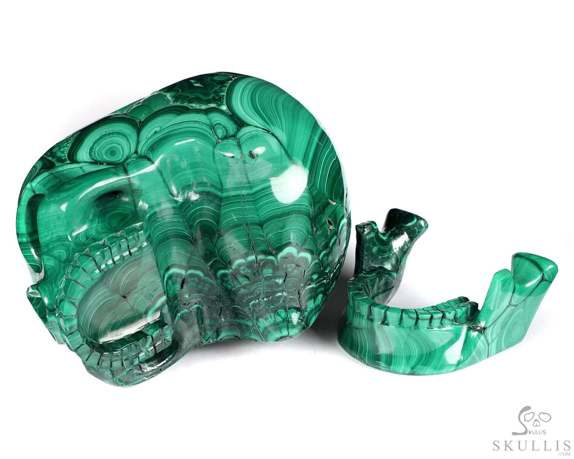 Amazing 6.3" Malachite Carved Crystal Mitchell-Hedges Crystal Skull, Detachable Jaw, Crystal Healing