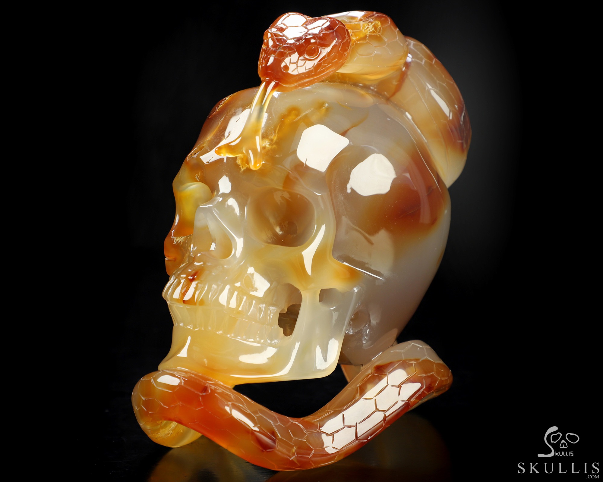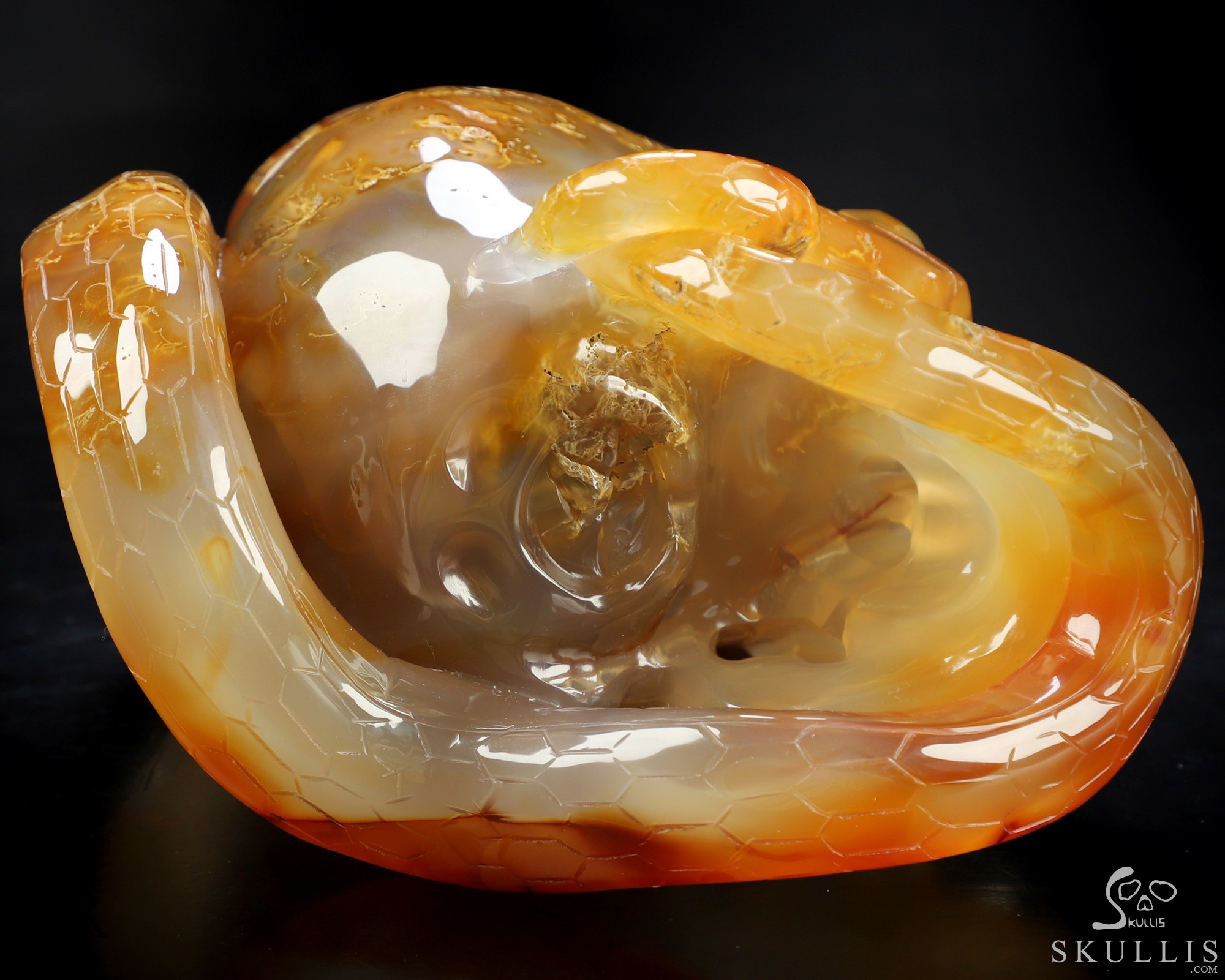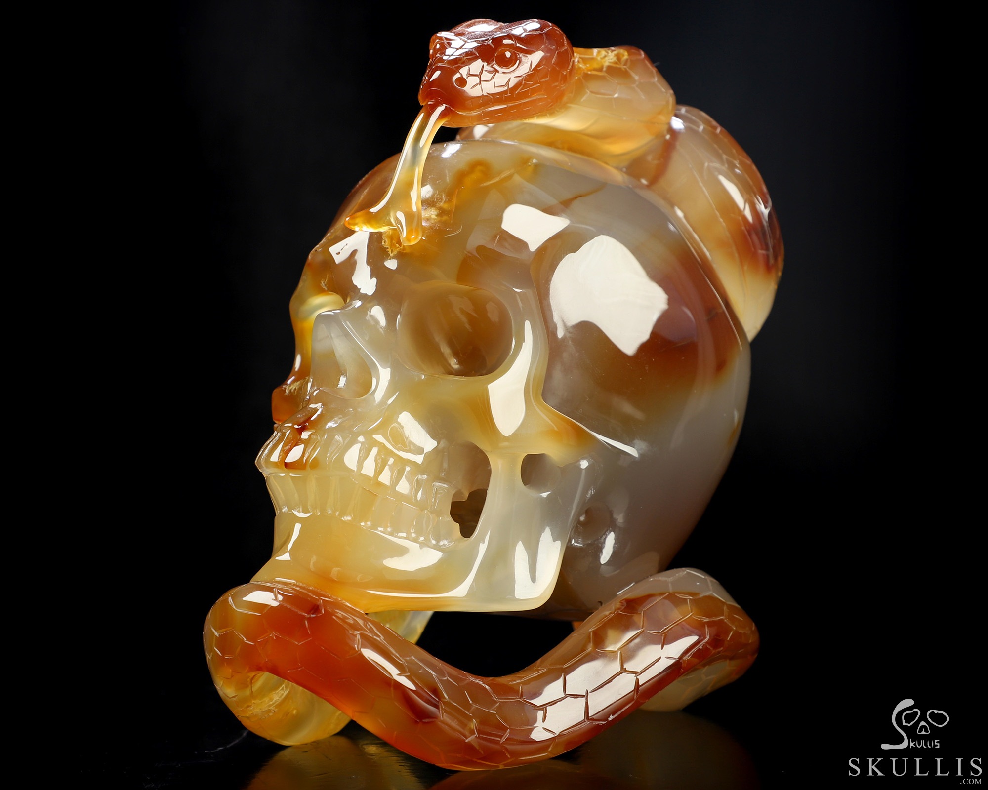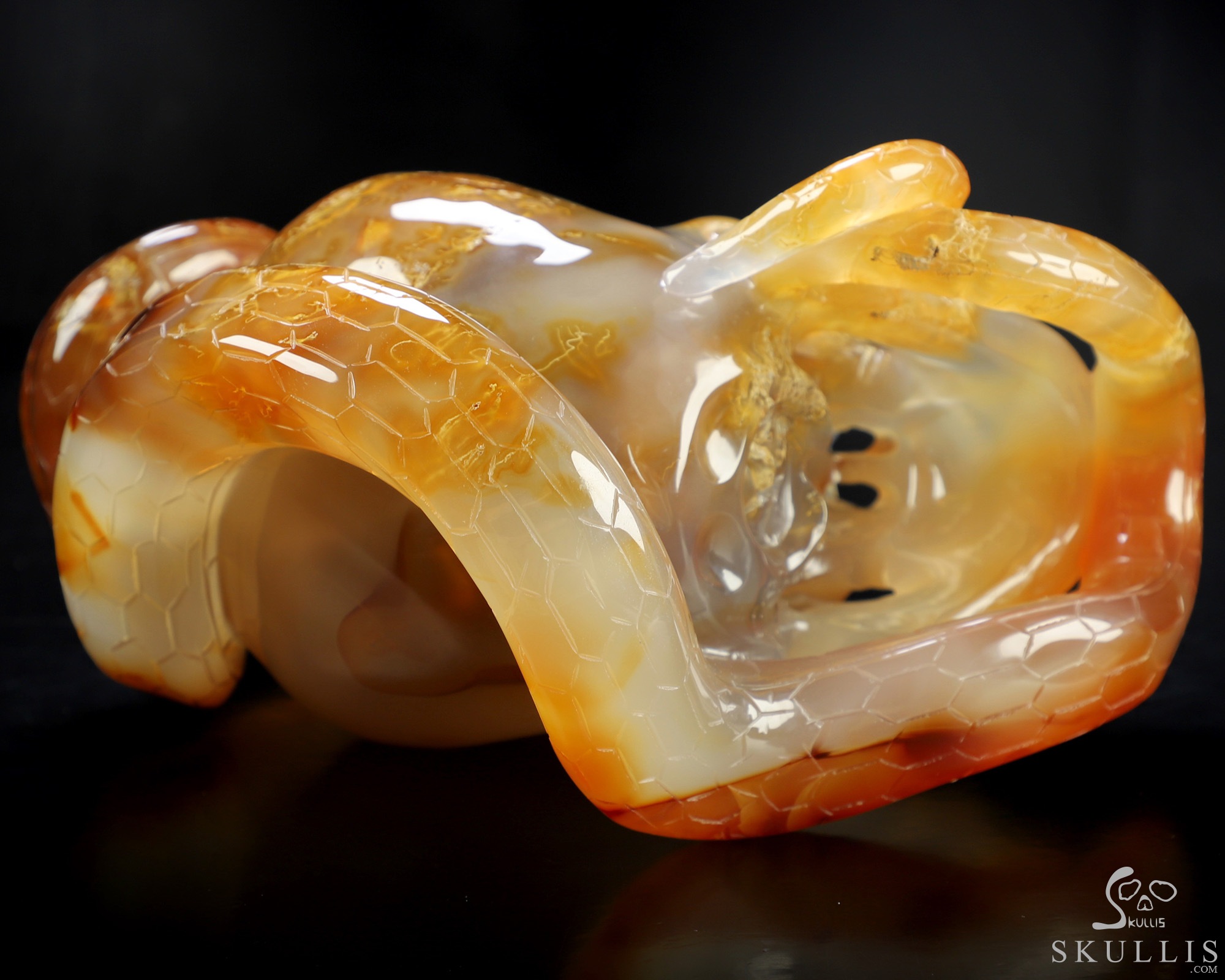 Amazing 6.7" Carnelian Hand Carved Crystal Skull and Snake Sculpture, Crystal Healing