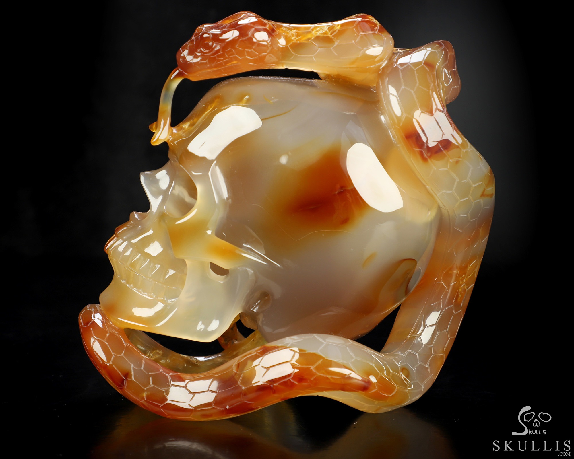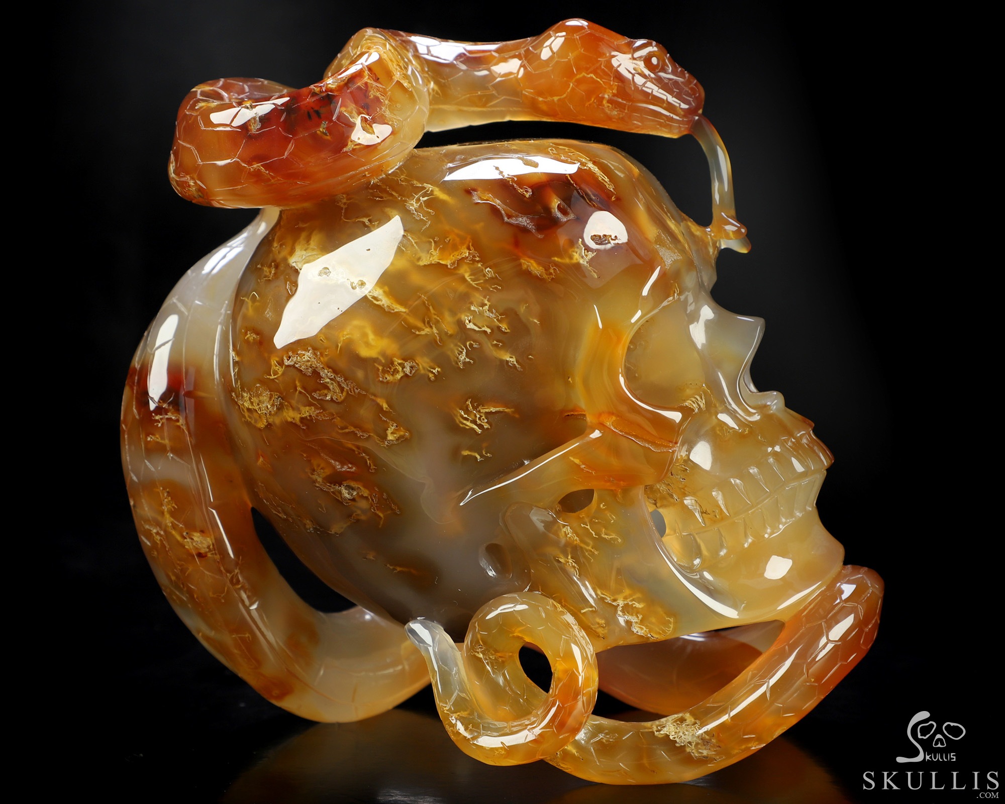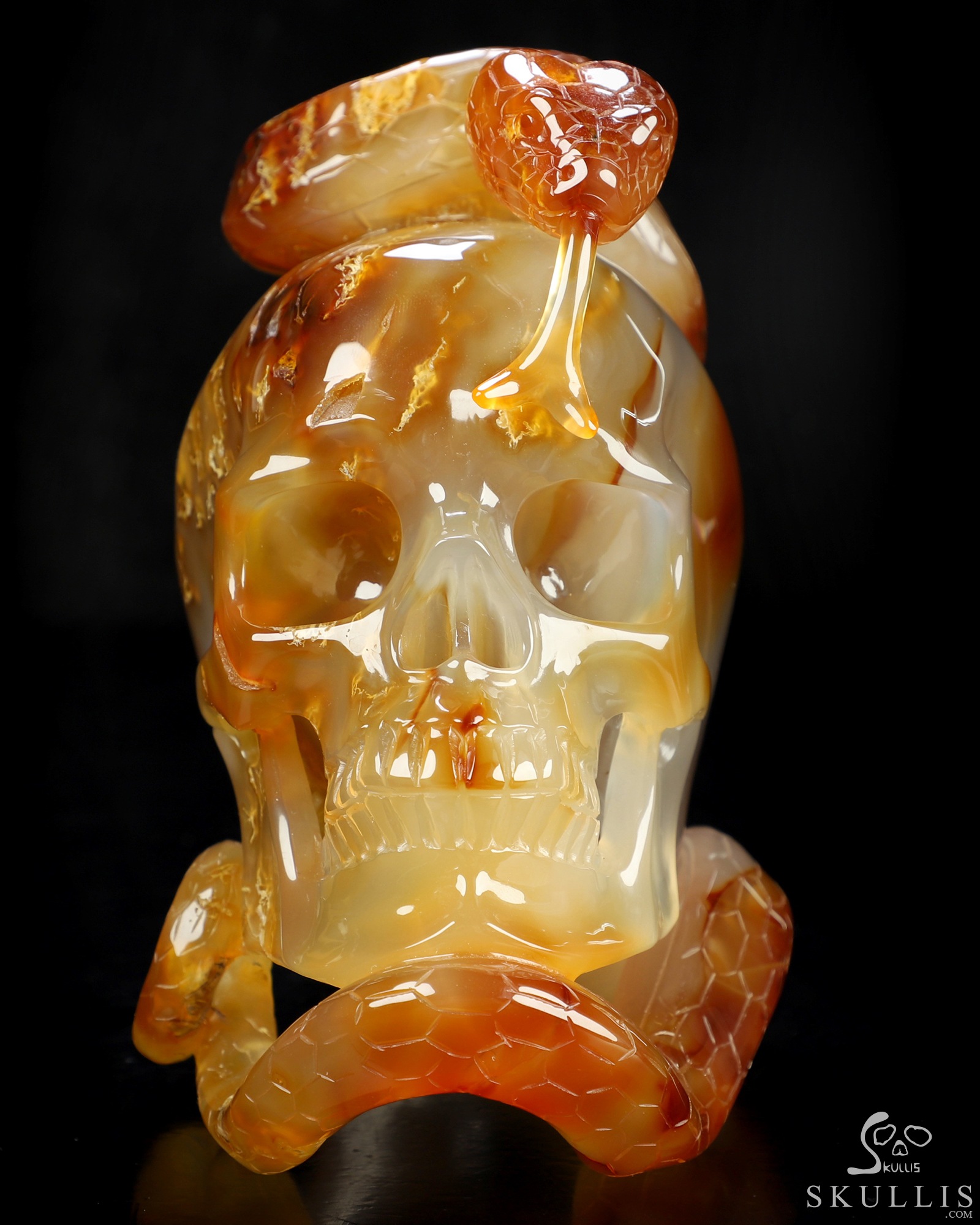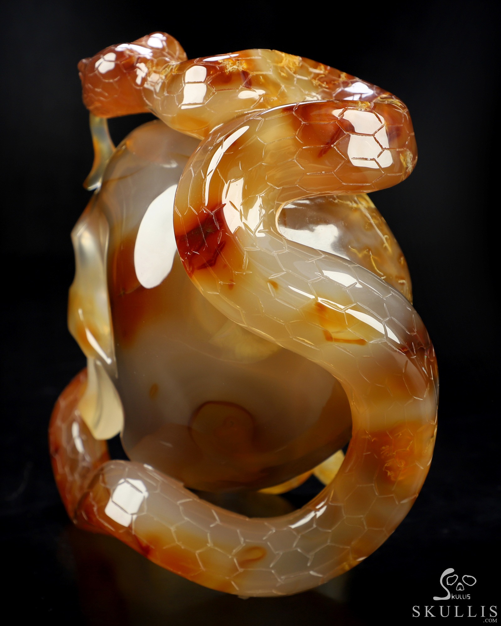 Amazing 6.7" Carnelian Hand Carved Crystal Skull and Snake Sculpture, Crystal Healing