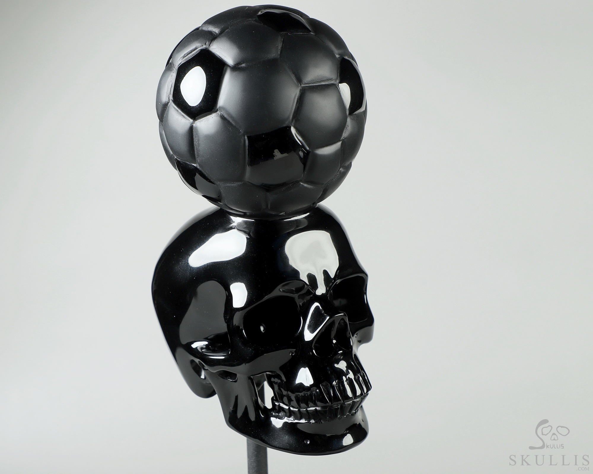 Black Obsidian Carved Crystal Skull with Football and Kambaba Jasper Stand Sculpture