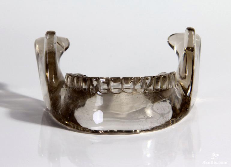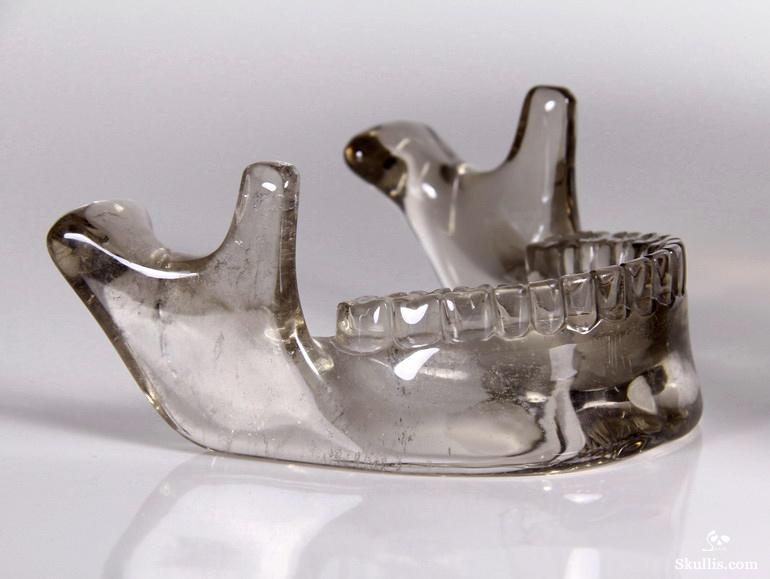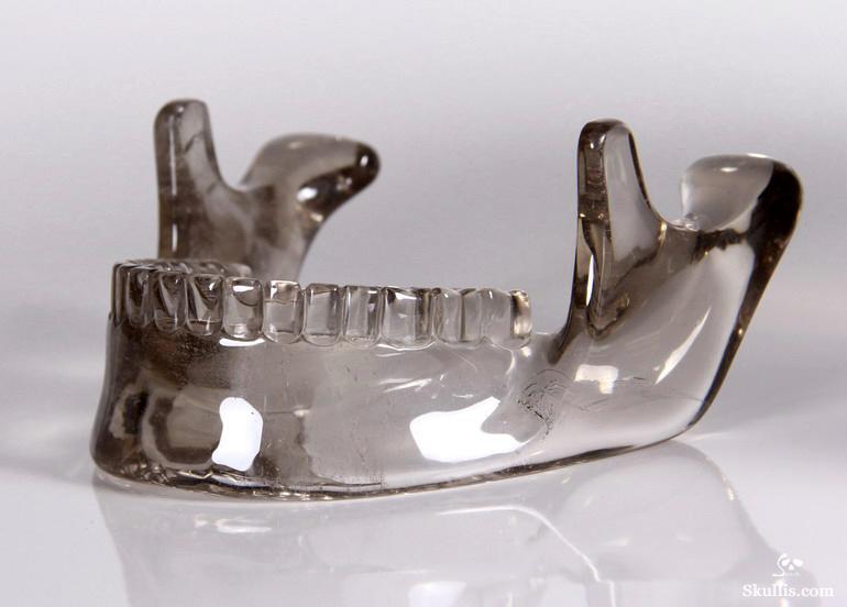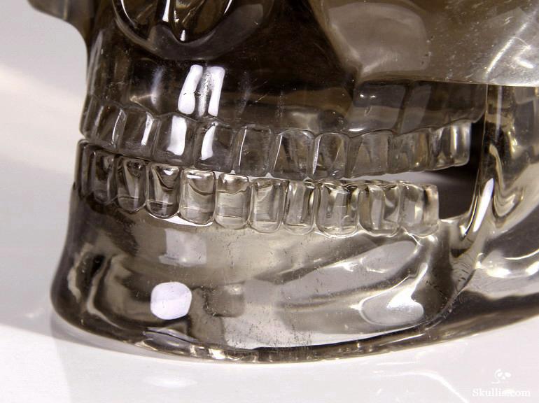 After untold hours of research, study, and carving, we have done it! The top artists at Skullis Studios have exactingly reproduced the famous Mitchell-Hedges crystal skull. Not only did we scour the Internet for every available photo, youtube video, and written description of the Mitchell-Hedges skull (including the official size and weight measurements- provided to us by documentarians from the National Geographic Channel, via The Smithsonian Institution in Washington DC); we also acquired every DVD available featuring the skull, from its original appearance on Arthur C. Clarke's "Mysterious World", to more recent documentaries (Smithsonian Institute/BBC documentary on the subject of crystal skulls, SyFy Channel documentary, among others), to videos sold as meditation aides by the skull's present caretaker, Bill Homann. Proportionately accurate in every detail, the skull has been painstakingly reproduced using official measurements taken by Frank Dorland at the Hewlett Packard crystal laboratory, where the Mitchell-Hedges skull was first subjected to rigorous scientific testing in 1970. Besides watching every known piece of video showing the skull and studying every available picture innumerable times, our team of top artists also took detailed measurements from multiple high quality DVD images (taken from various angles) of the skull and lower jaw, to ensure the highest degree of accuracy possible in proportionately recreating every feature of the original. Many months and several iterations later, we have finally done what the experts said could not be done: we have successfully and accurately recreated the most enigmatic lapidary masterpiece of all time!