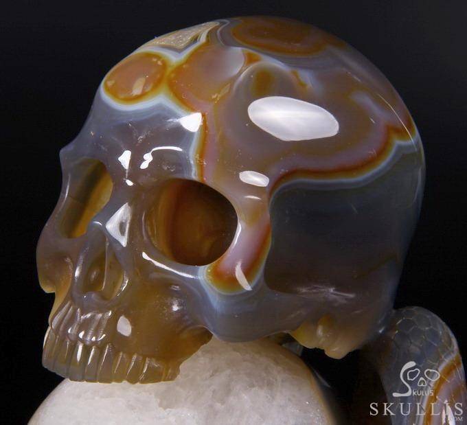 NOTE: Skullis does not prescribe treatment for medical issues. Skullis offers information for reference to assist with the selection and understanding of crystal skulls, including this agate geode crystal skull, sphere, and snake with ruby eyes sculpture.