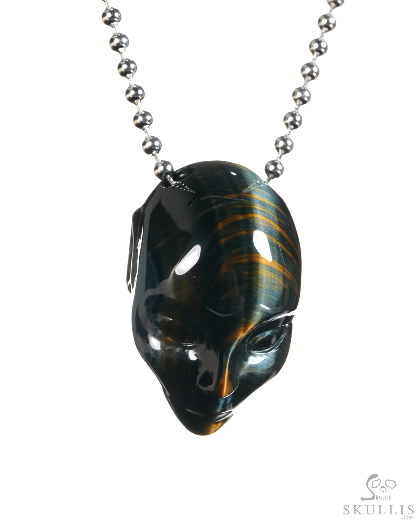 Necklace of 0.9" Blue & Gold Tiger's Eye Hand Carved Crystal Skull Pendant, Skull Jewelry