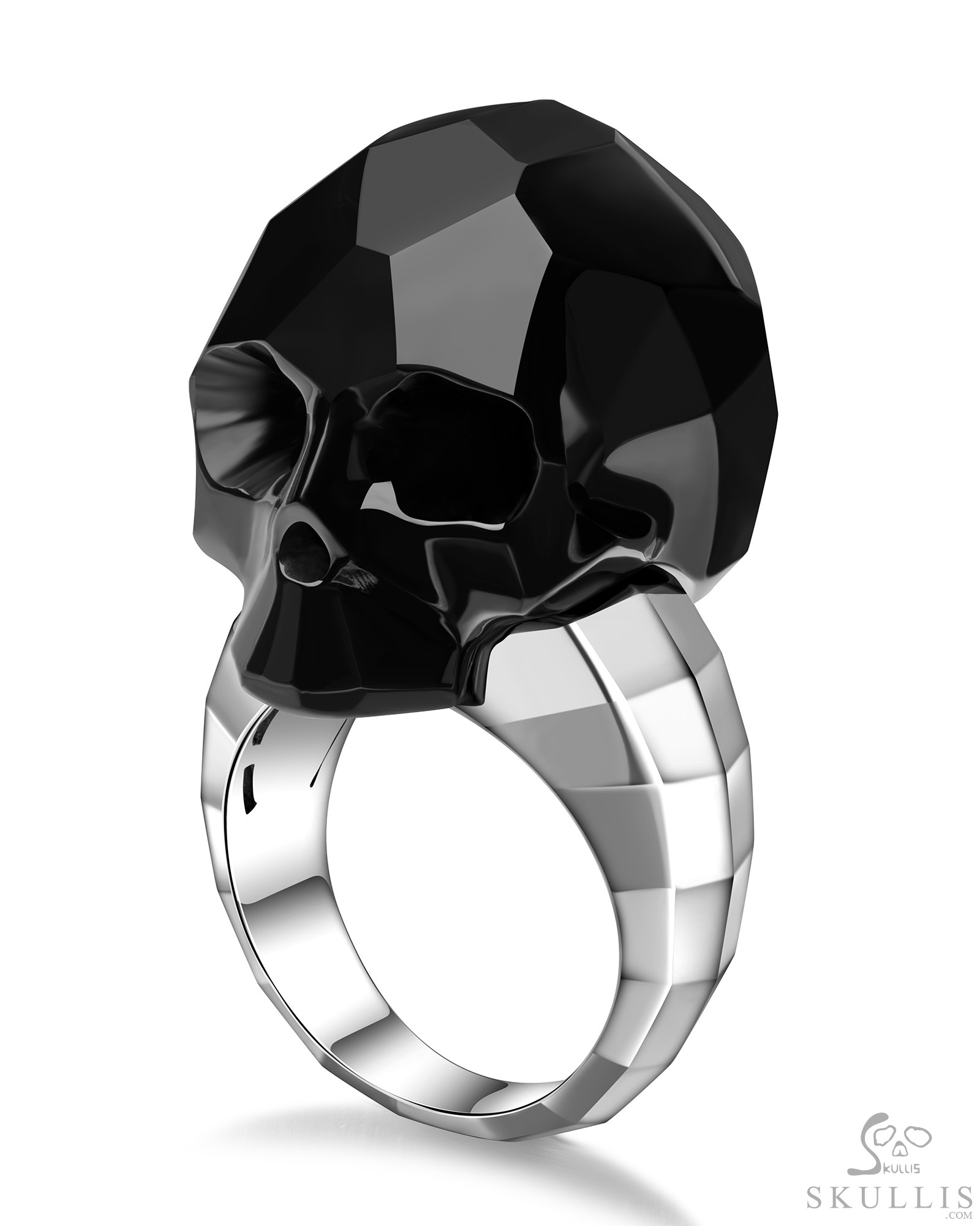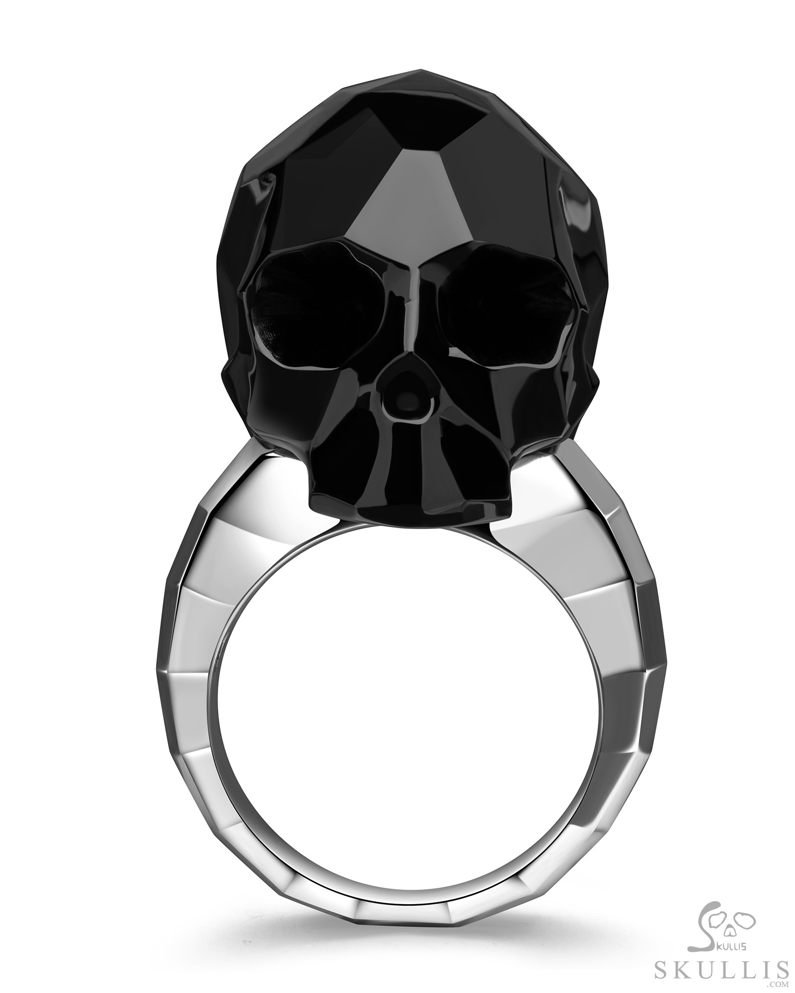 Facets of Fates - Gem Skull Ring of Black Obsidian Carved Faceted Skull in 925 Sterling Silver, Skull Jewelry