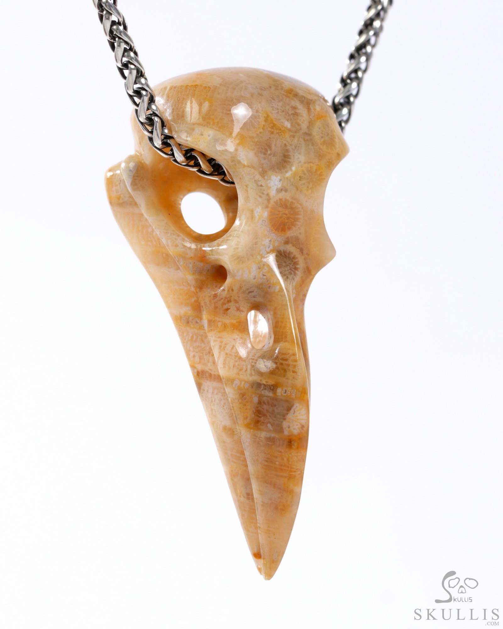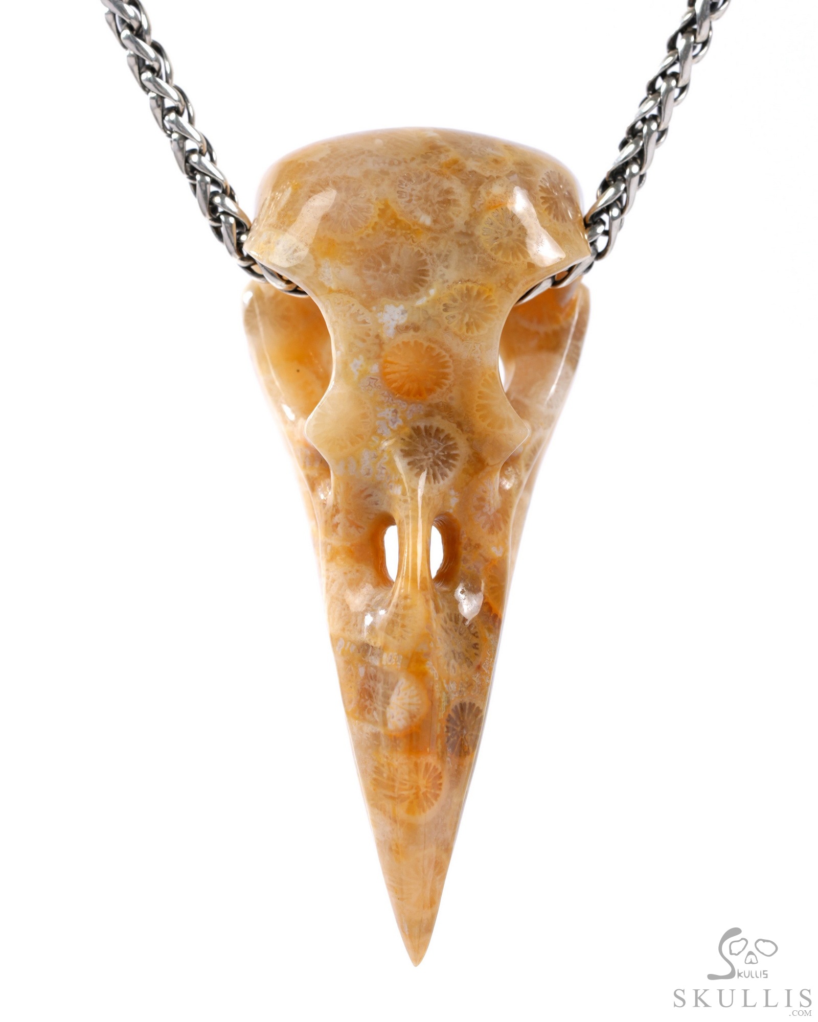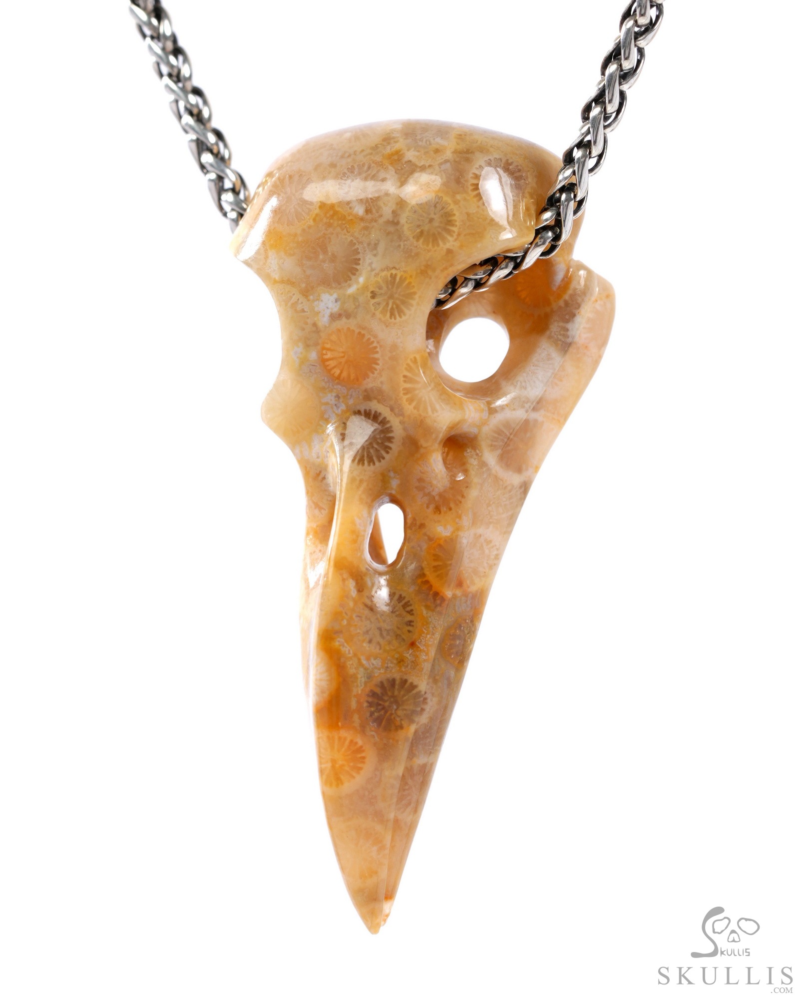 Gem Raven Skull Pendant Necklace of Coral Fossil Crystal Raven Pendant