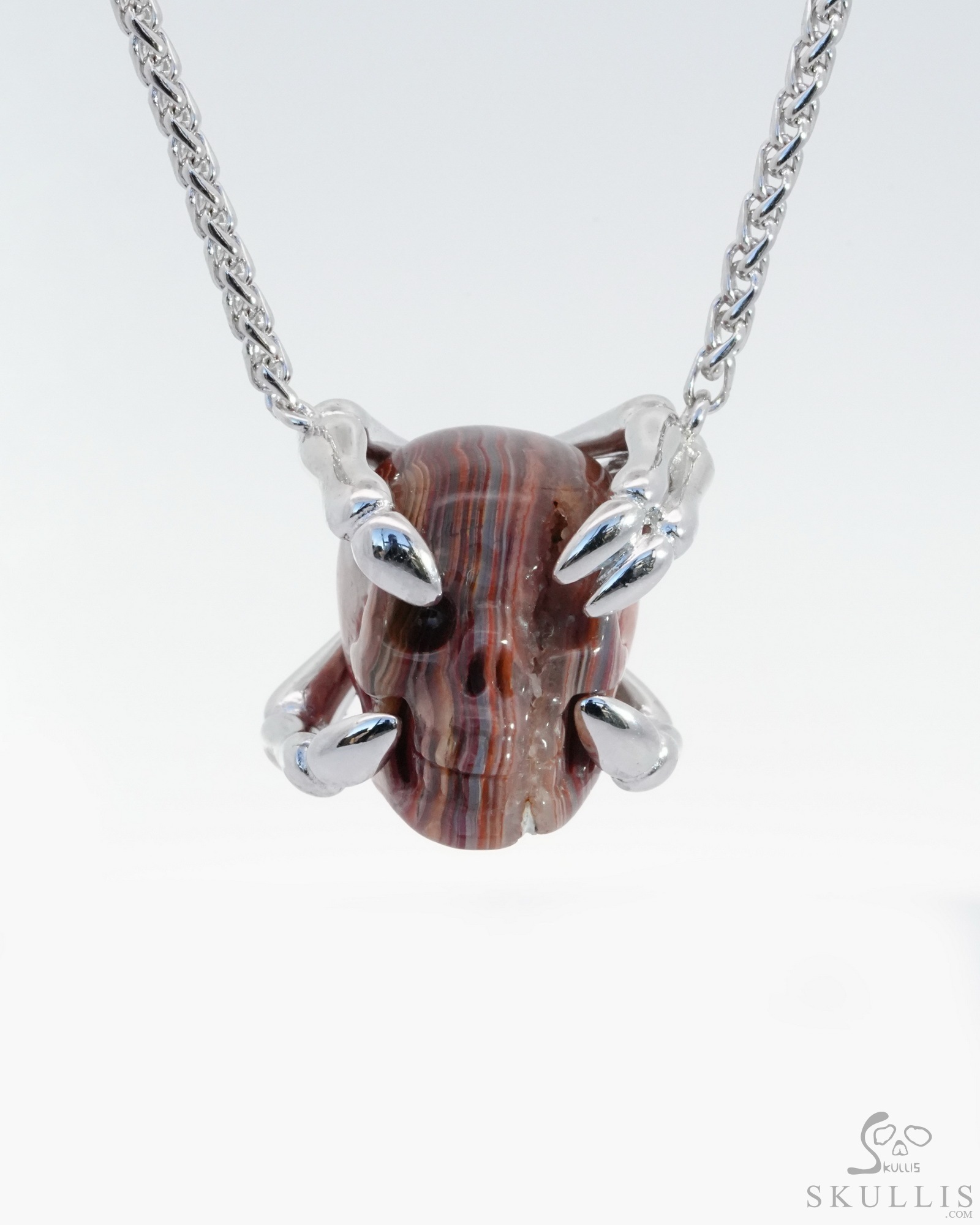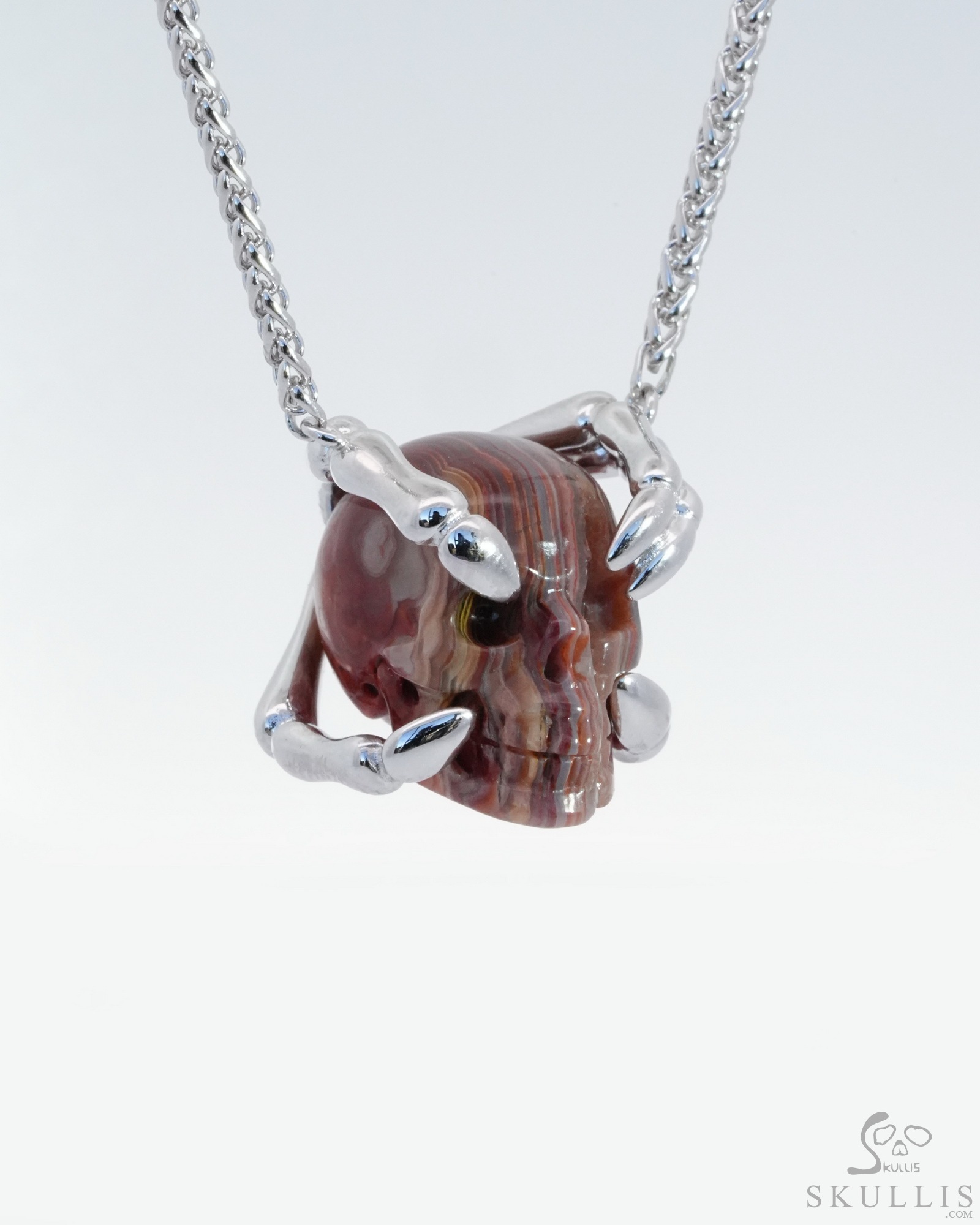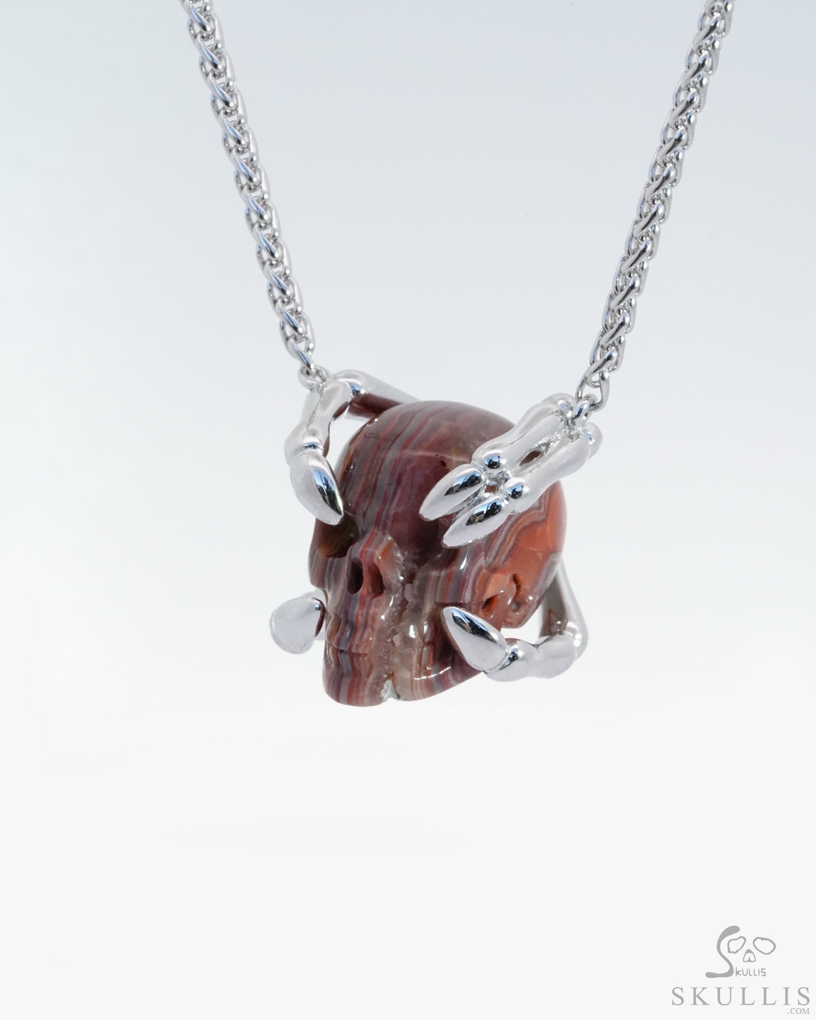 Gem Skull Pendant Necklace of Red Crazy Lace Agate Carved Skull with Sterling Silver Finger Bones, Skull Jewelry