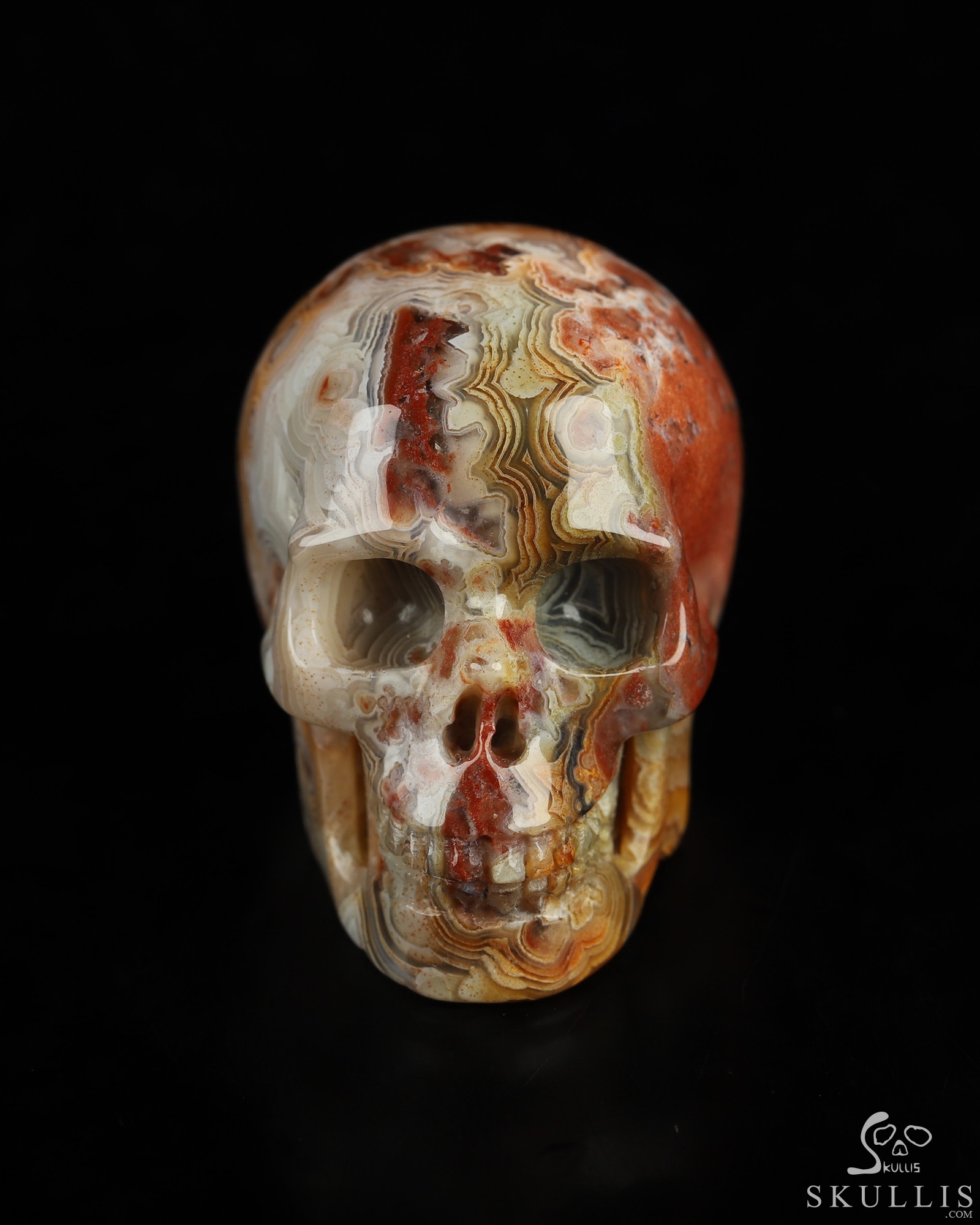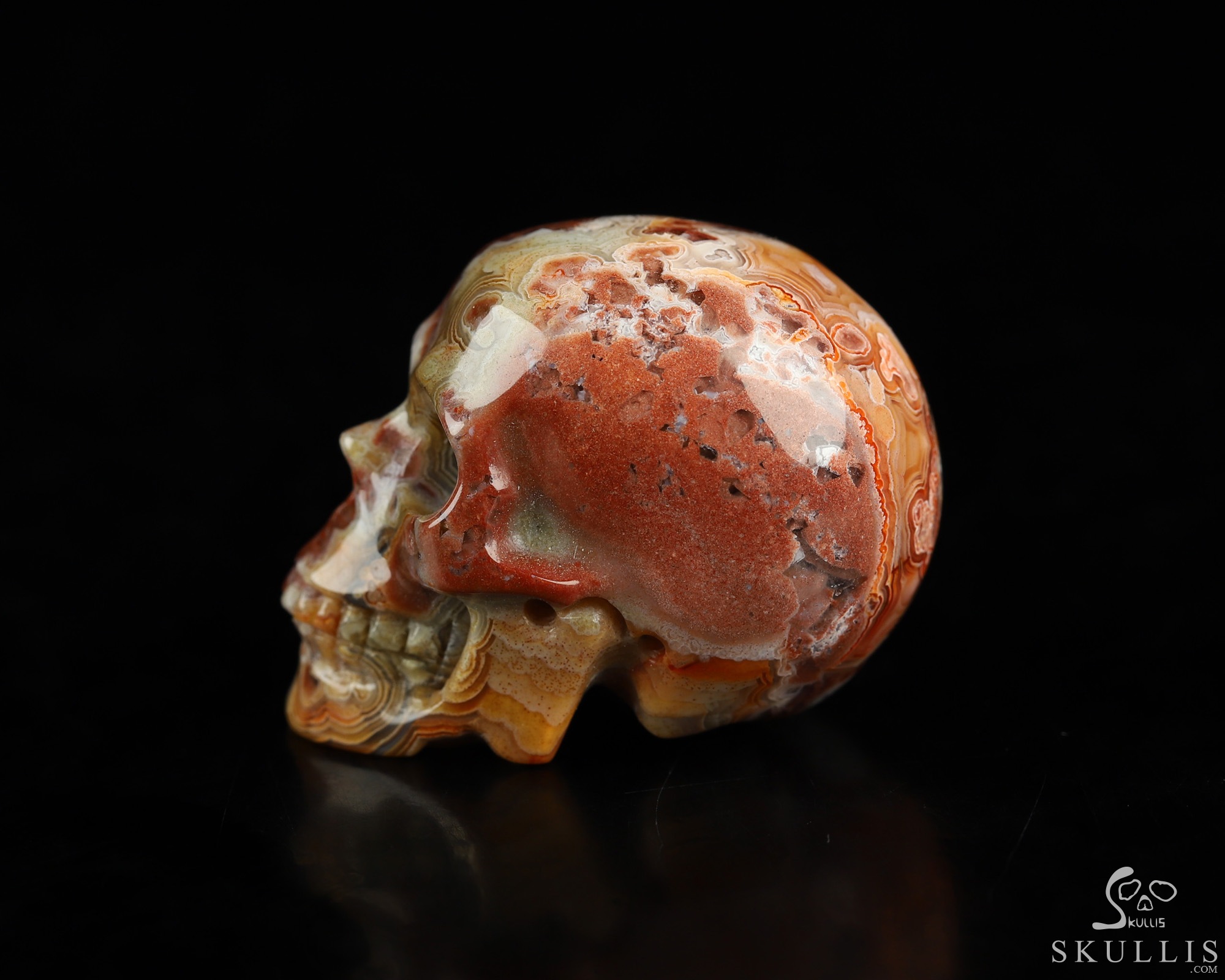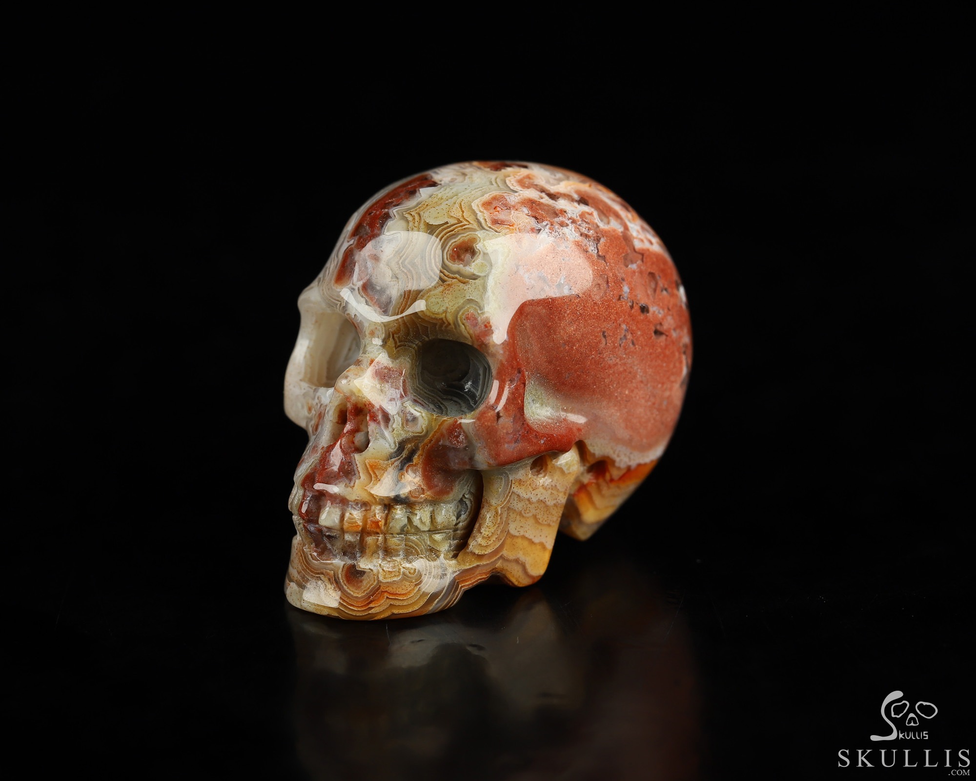 You are looking at a Red Crazy Lace Agate skull. The skull is 1.3 inches from front to back.